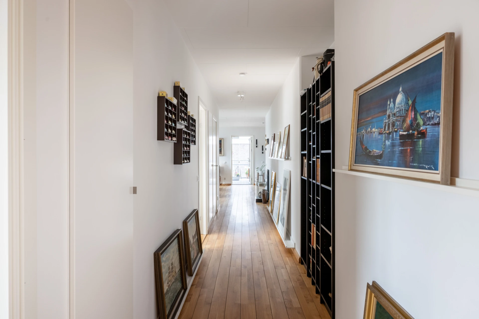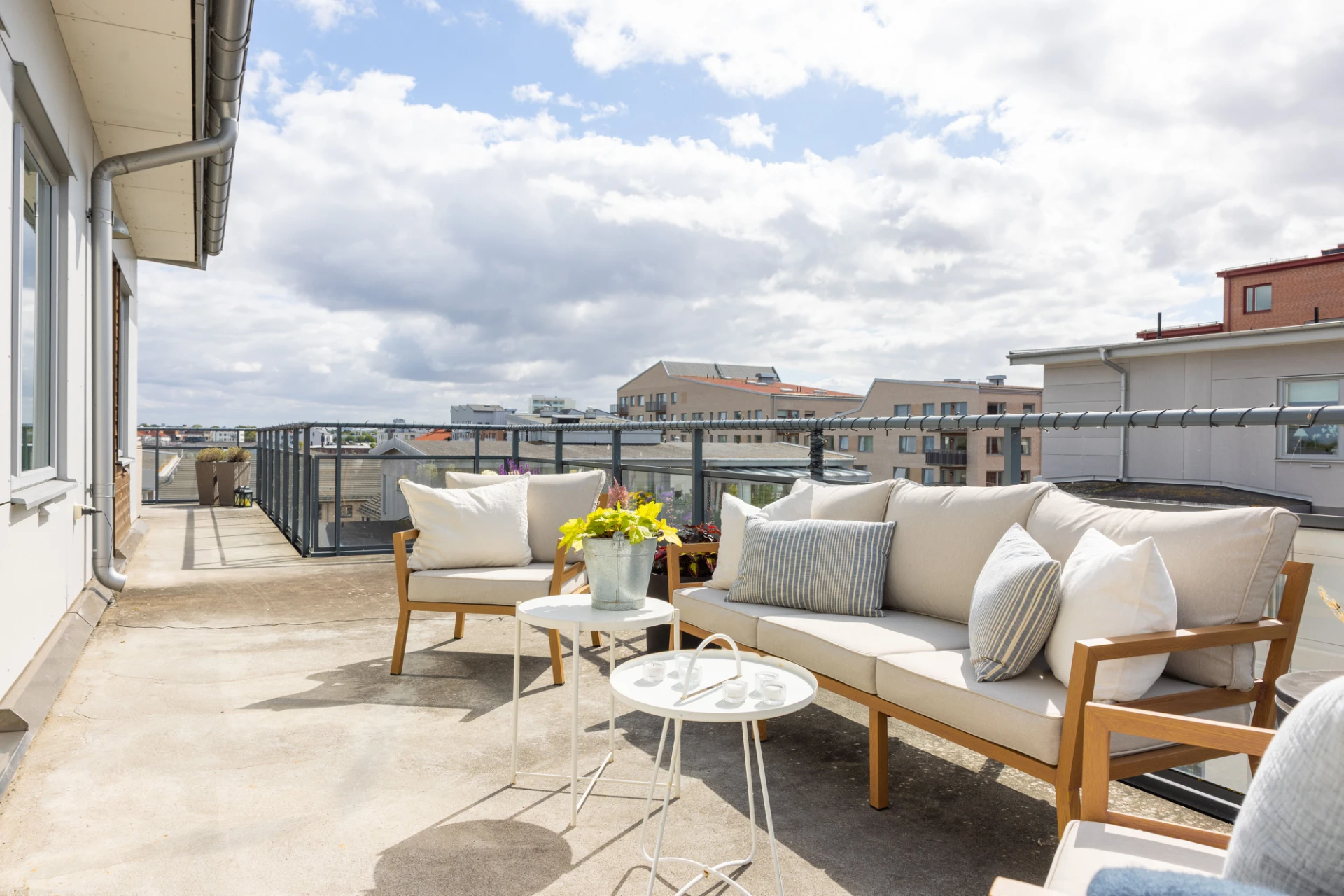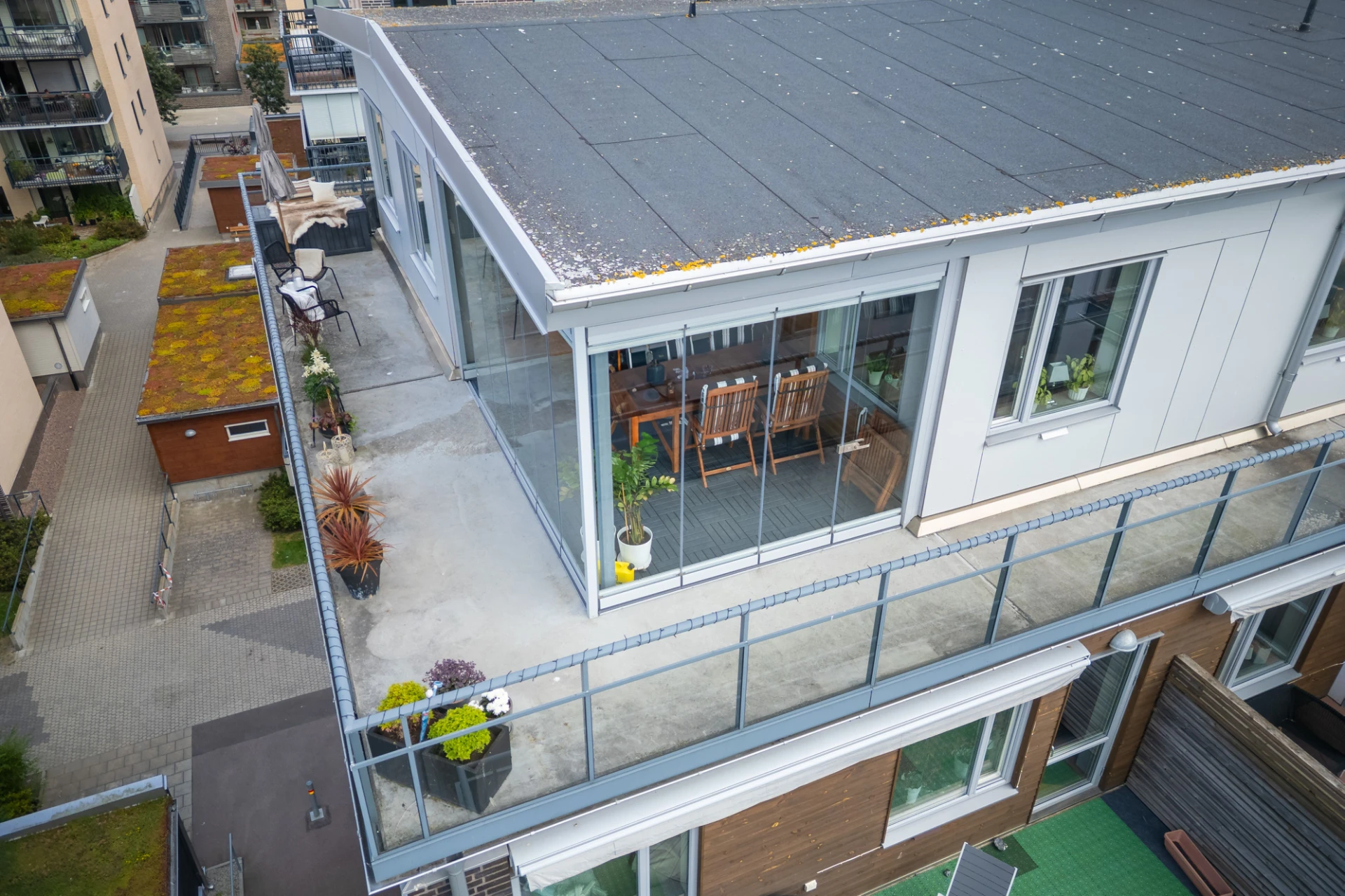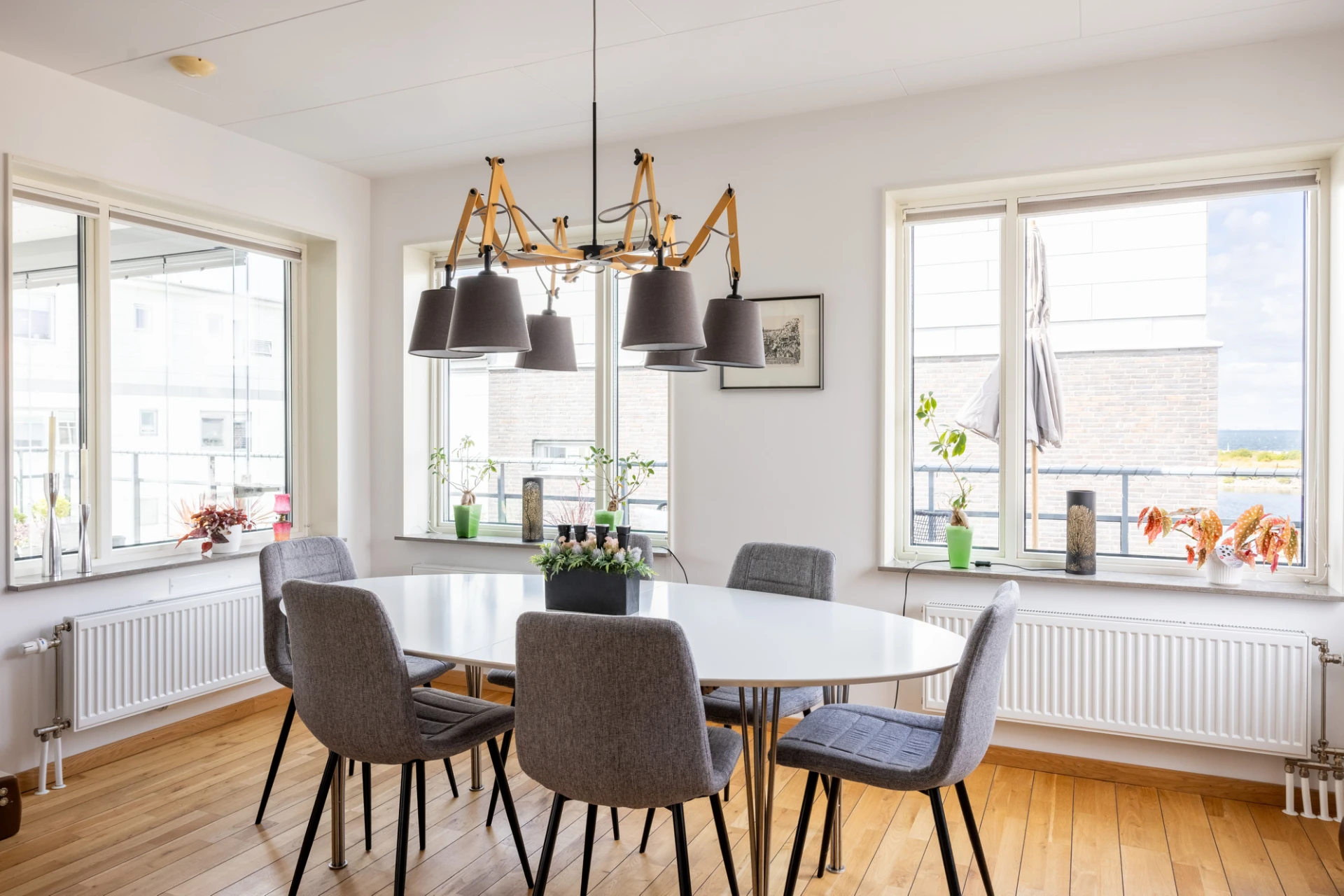 Skeppsgolv och vita väggar. Utgång till inglasad del av terrass.