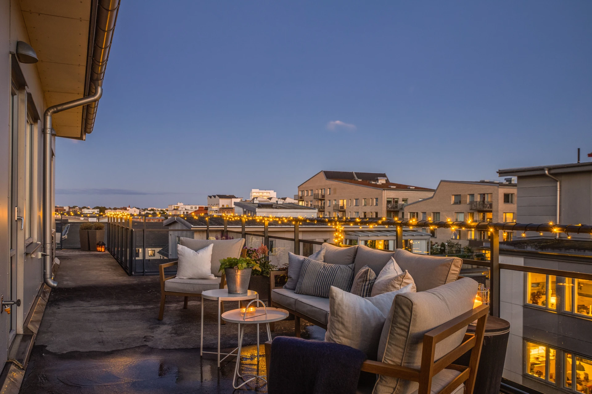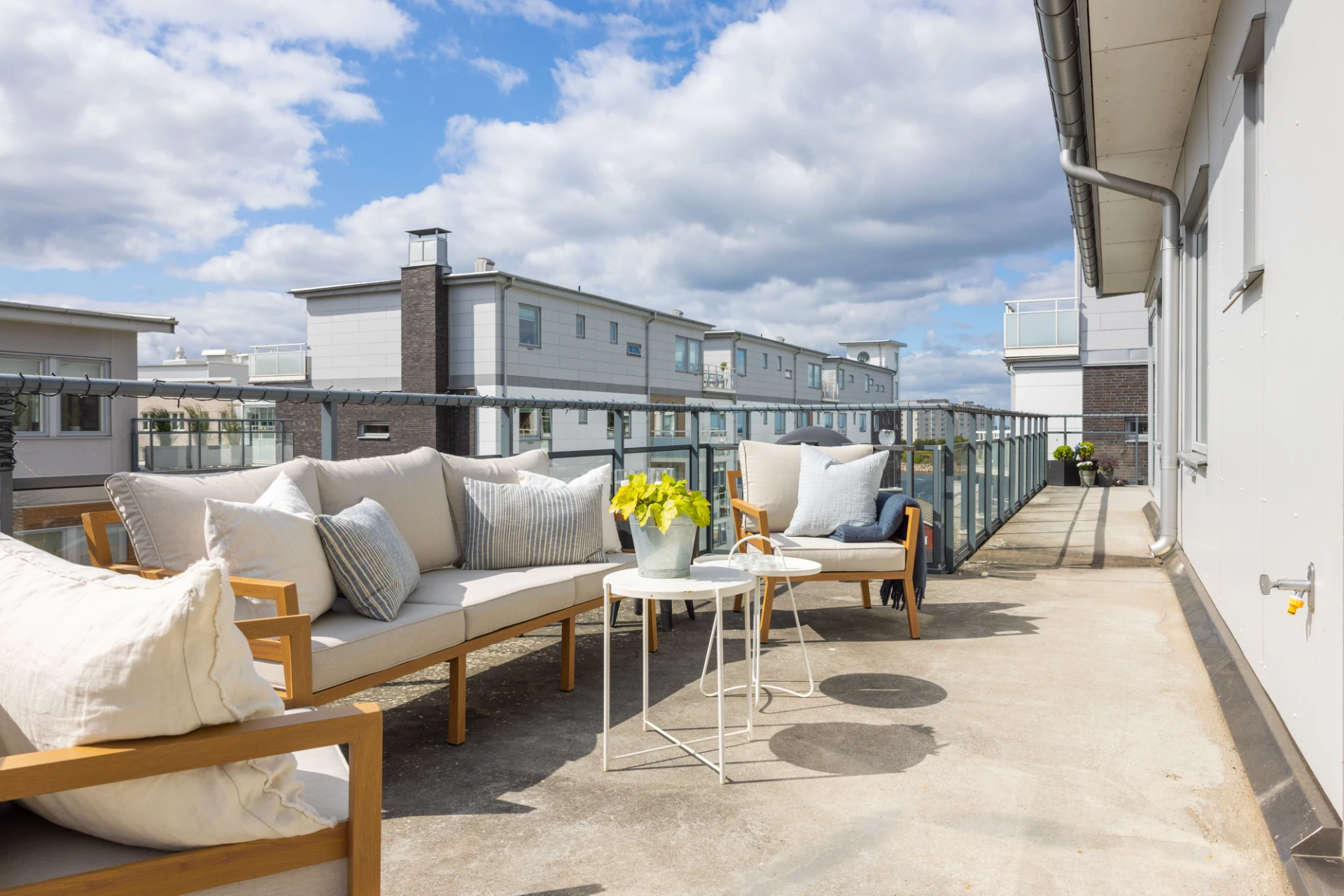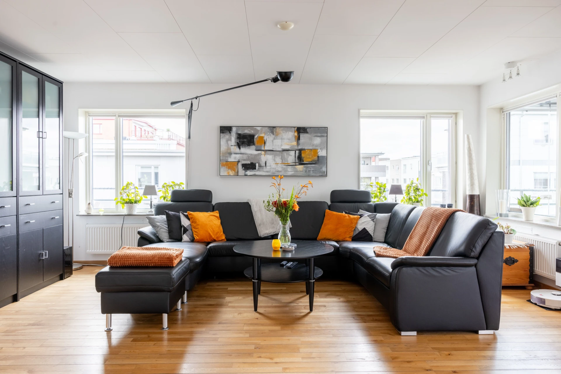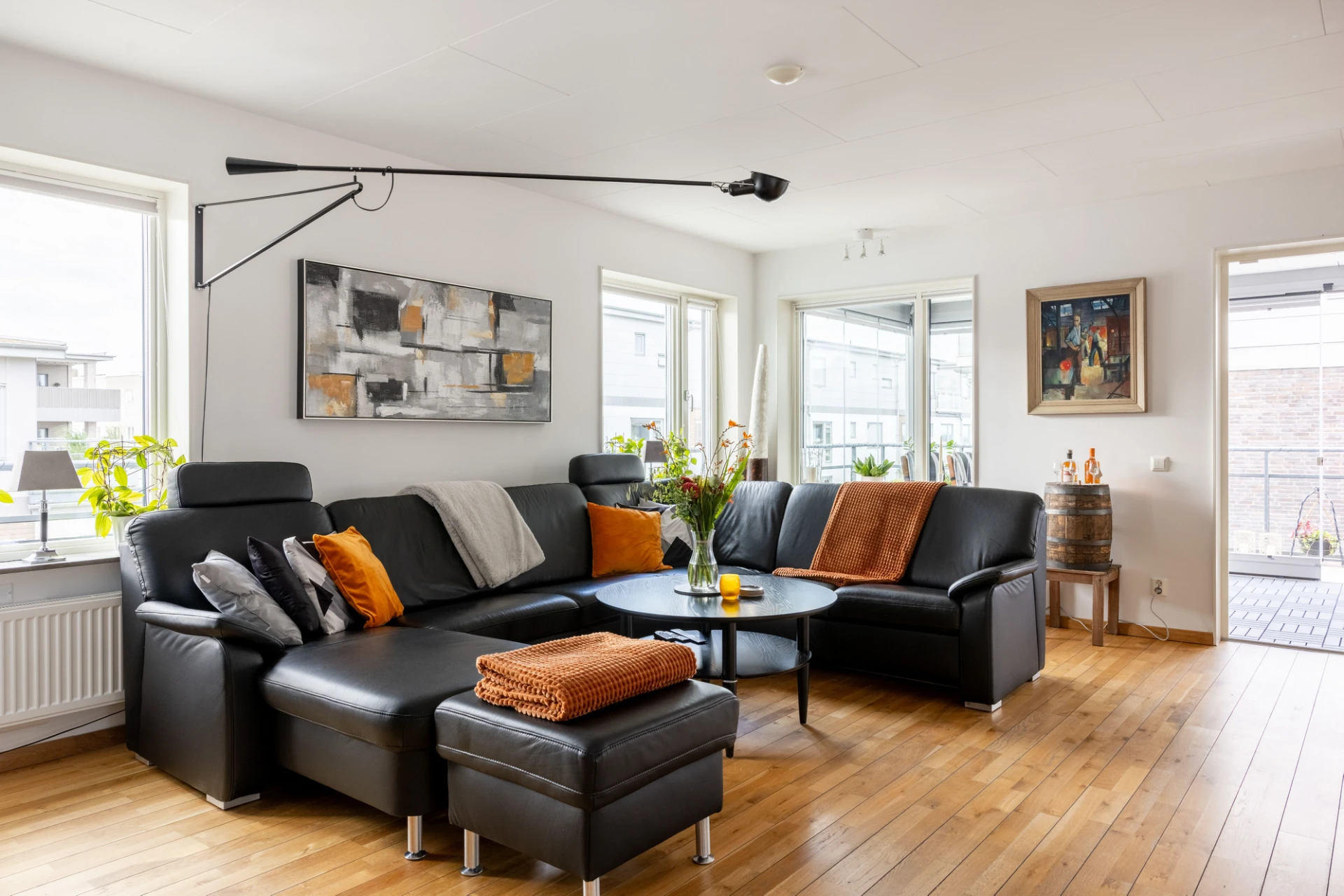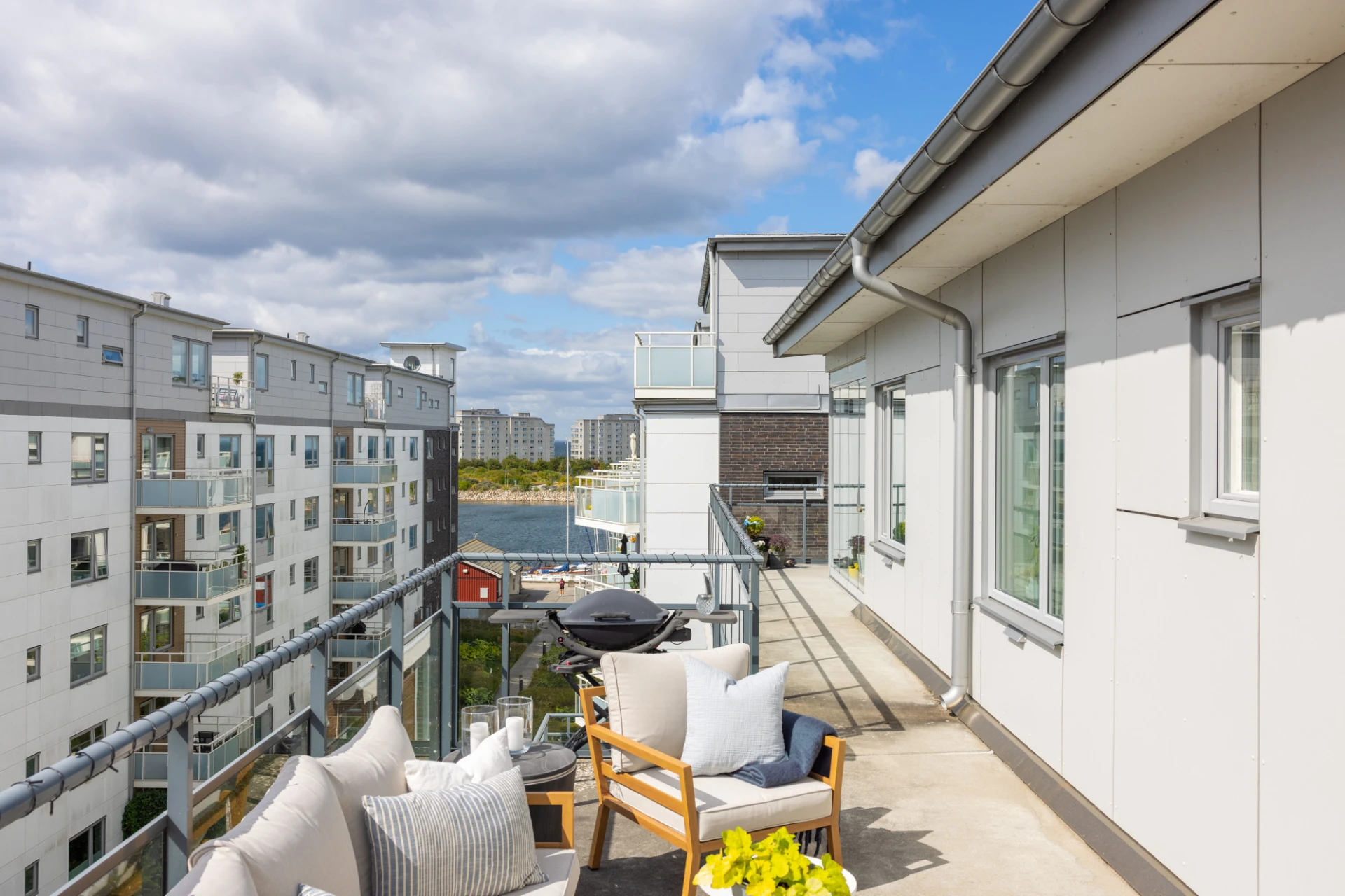 Skeppsgolv och vita väggar. Utgång till inglasad del av terrass.