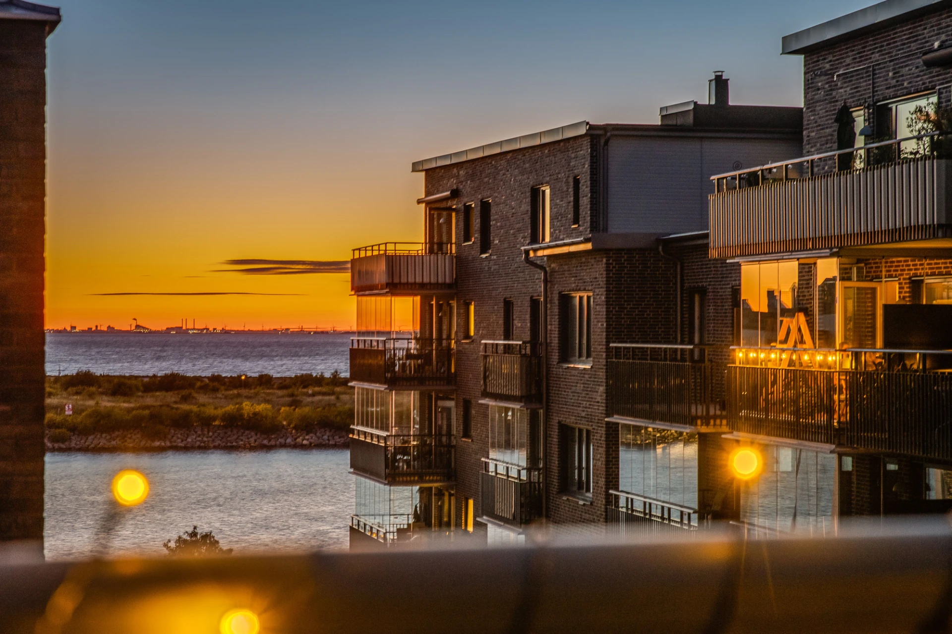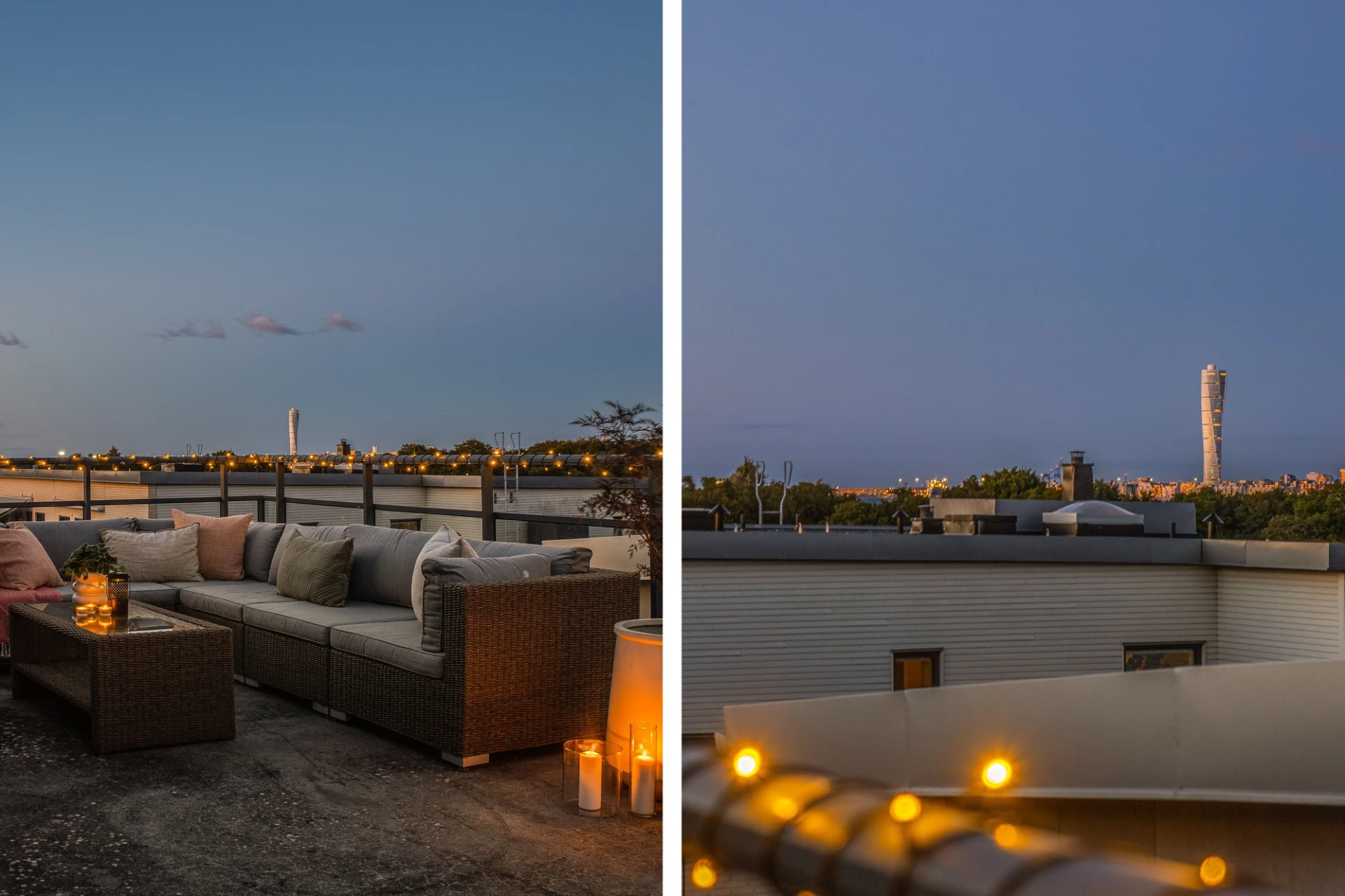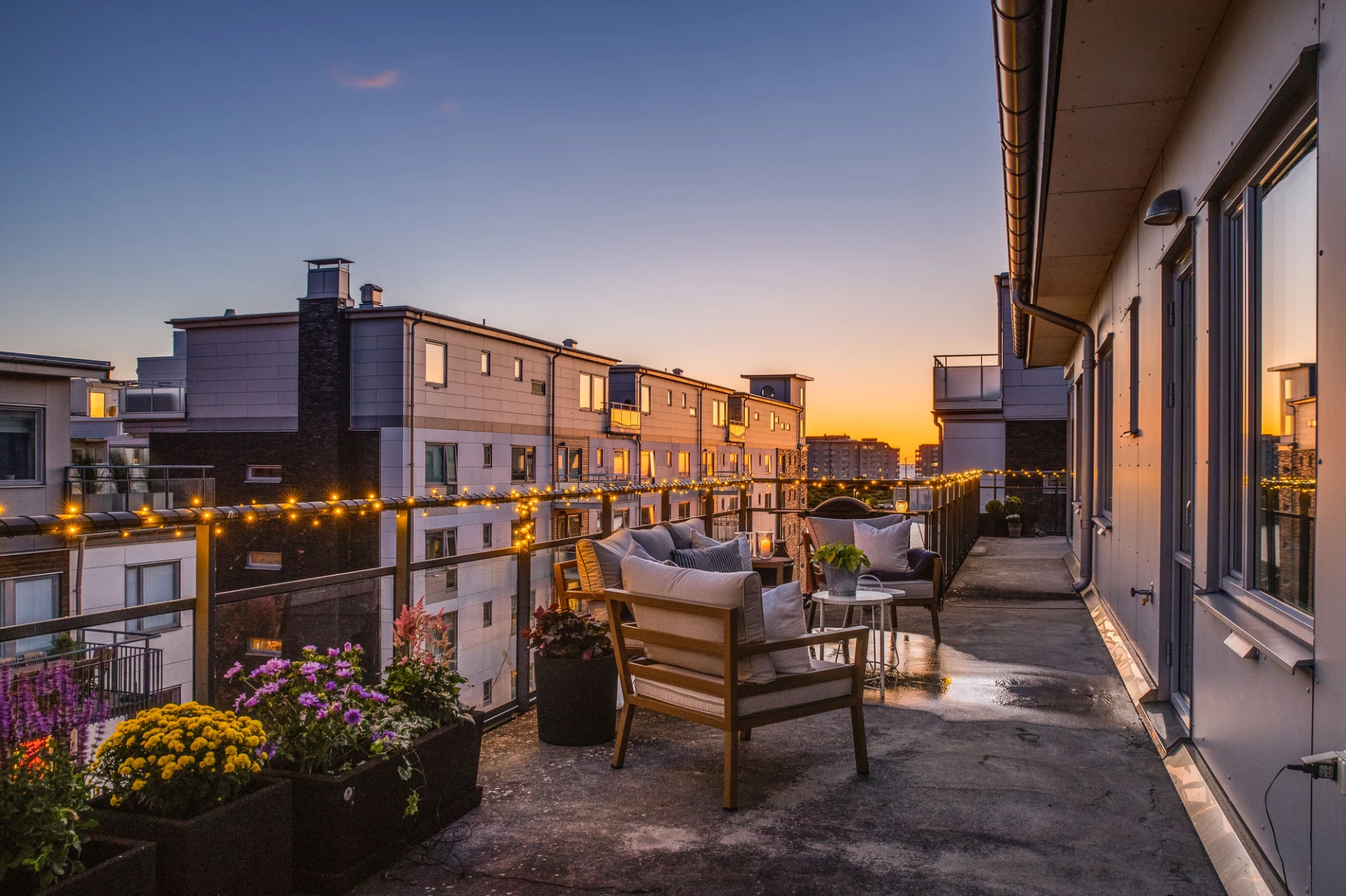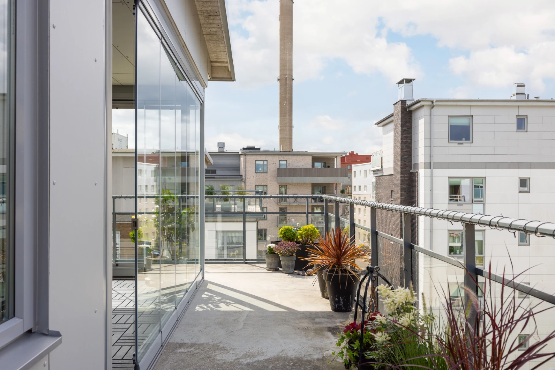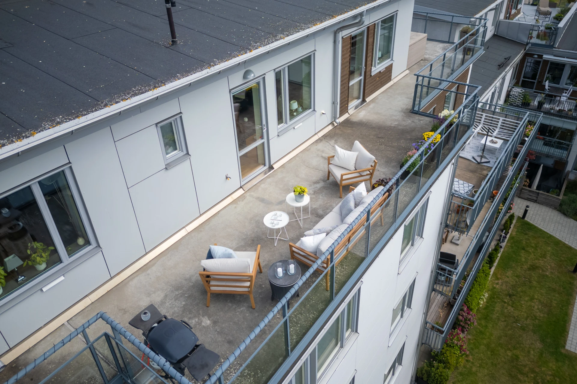 Skeppsgolv och vita väggar. Utgång till inglasad del av terrass.
