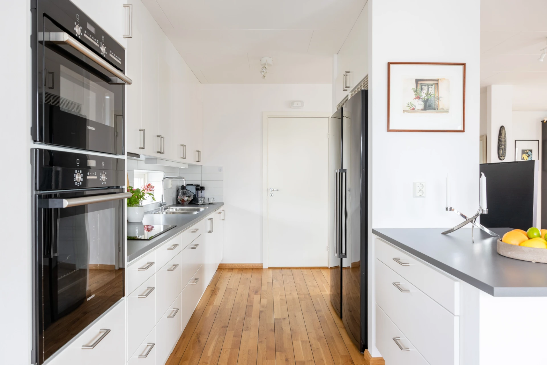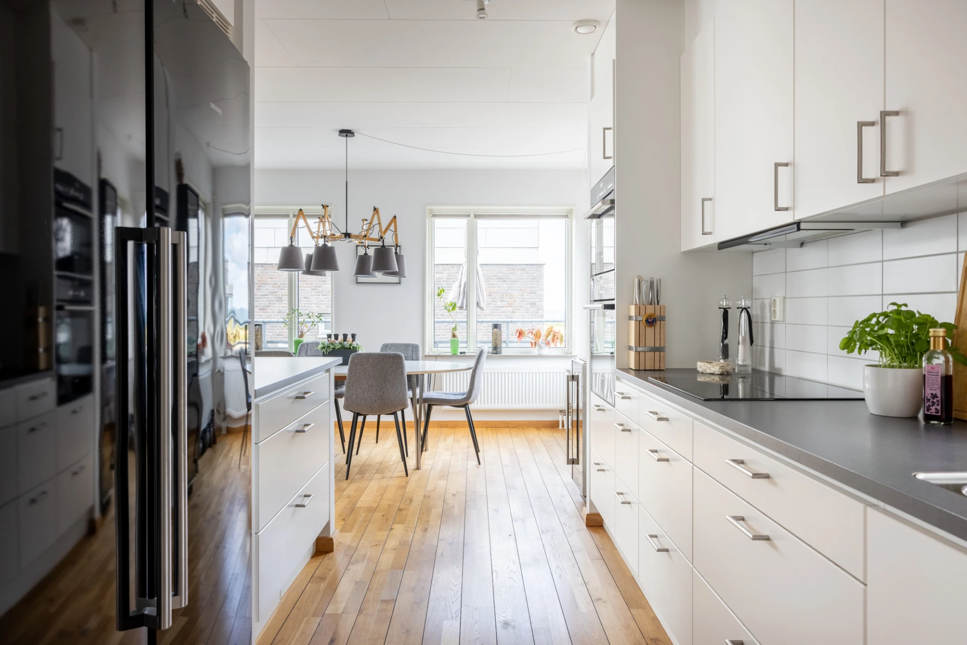 Skeppsgolv och vita väggar. Vit köksinredning, vitt kakel och grå bänkskiva i laminat. Utrustat med kyl och frys i fullhöjd, spishäll, inbyggd fläkt, inbyggd ugn, inbyggd mikrovågsugn och integrerad diskmaskin. Matplats i burspråk.
