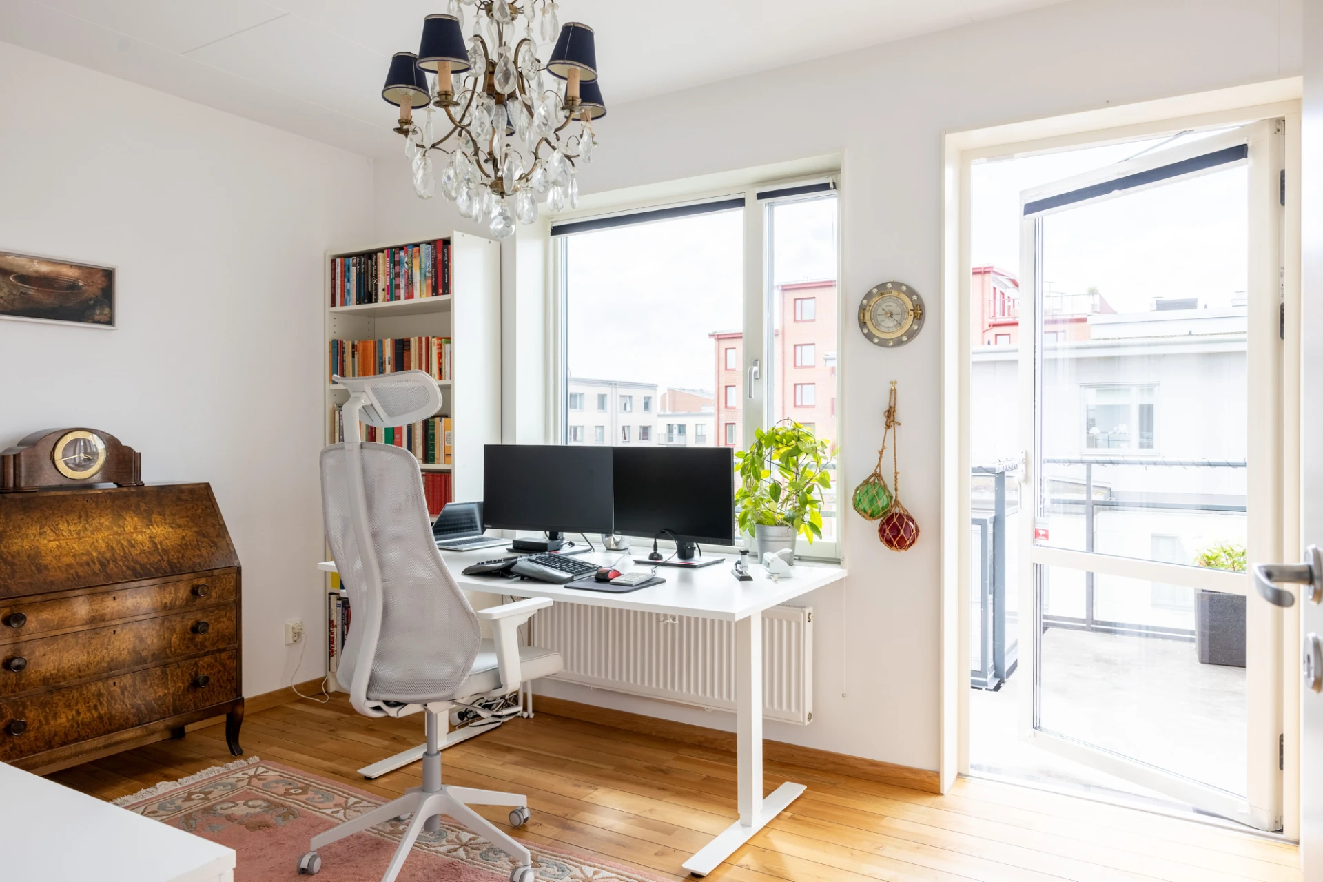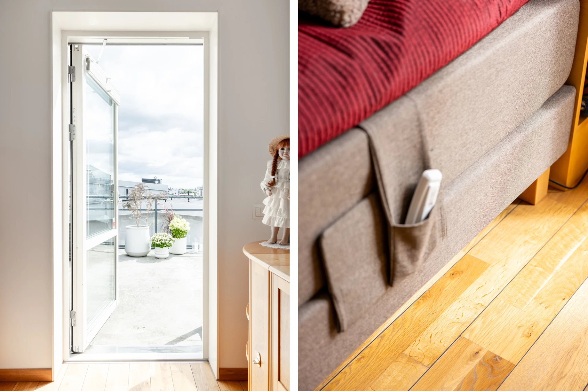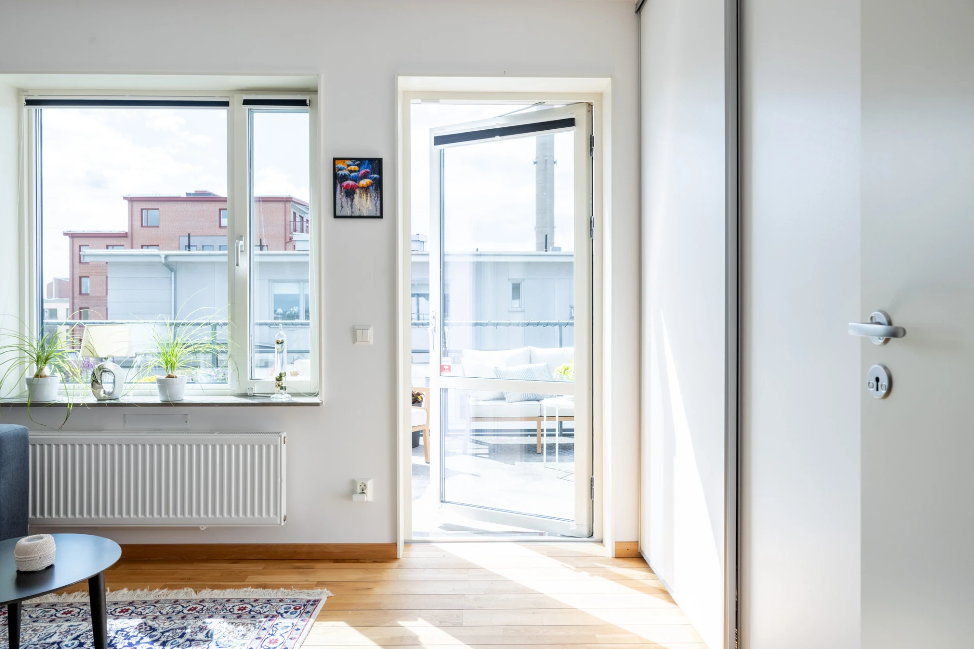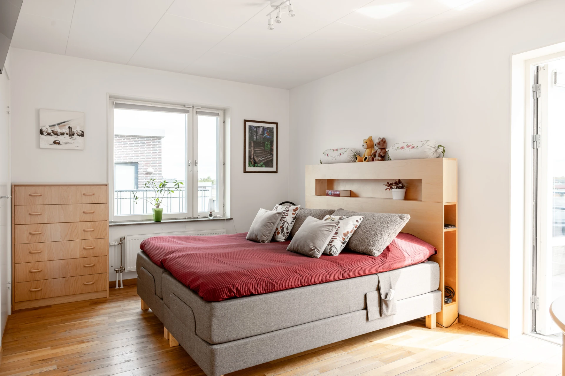 Skeppsgolv och vita väggar. Förvaring i skjutdörrsgarderob. Utgång till terrass.