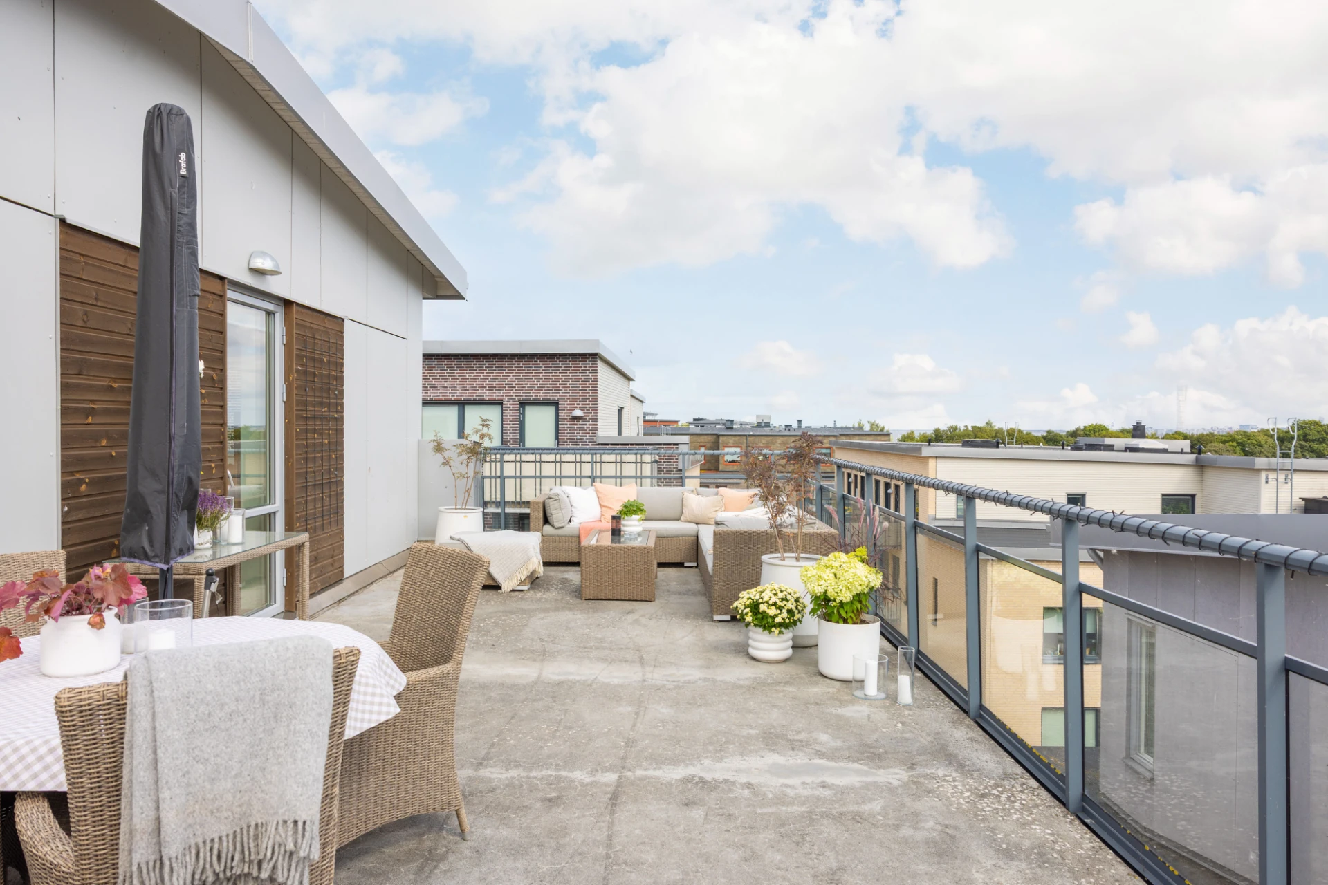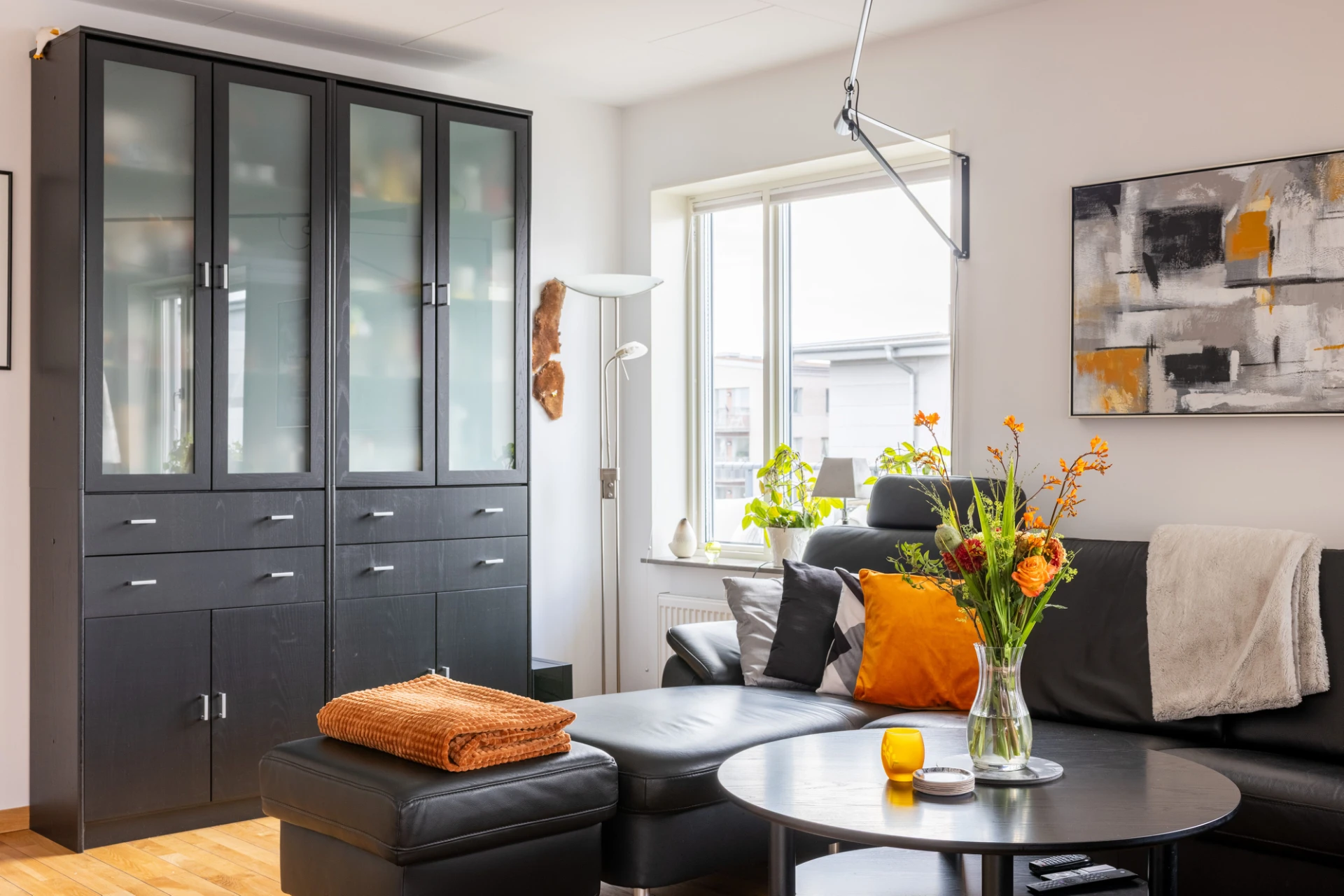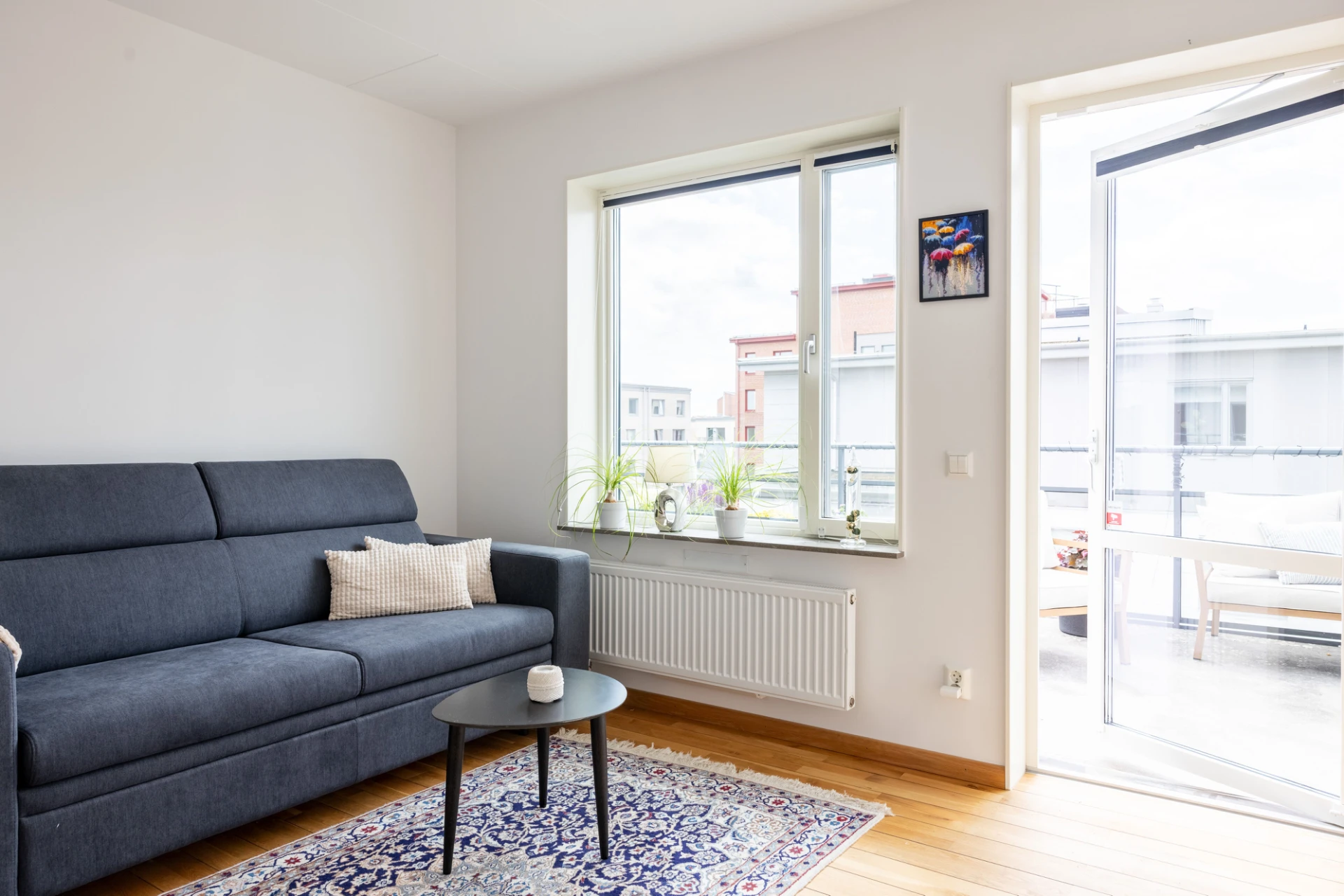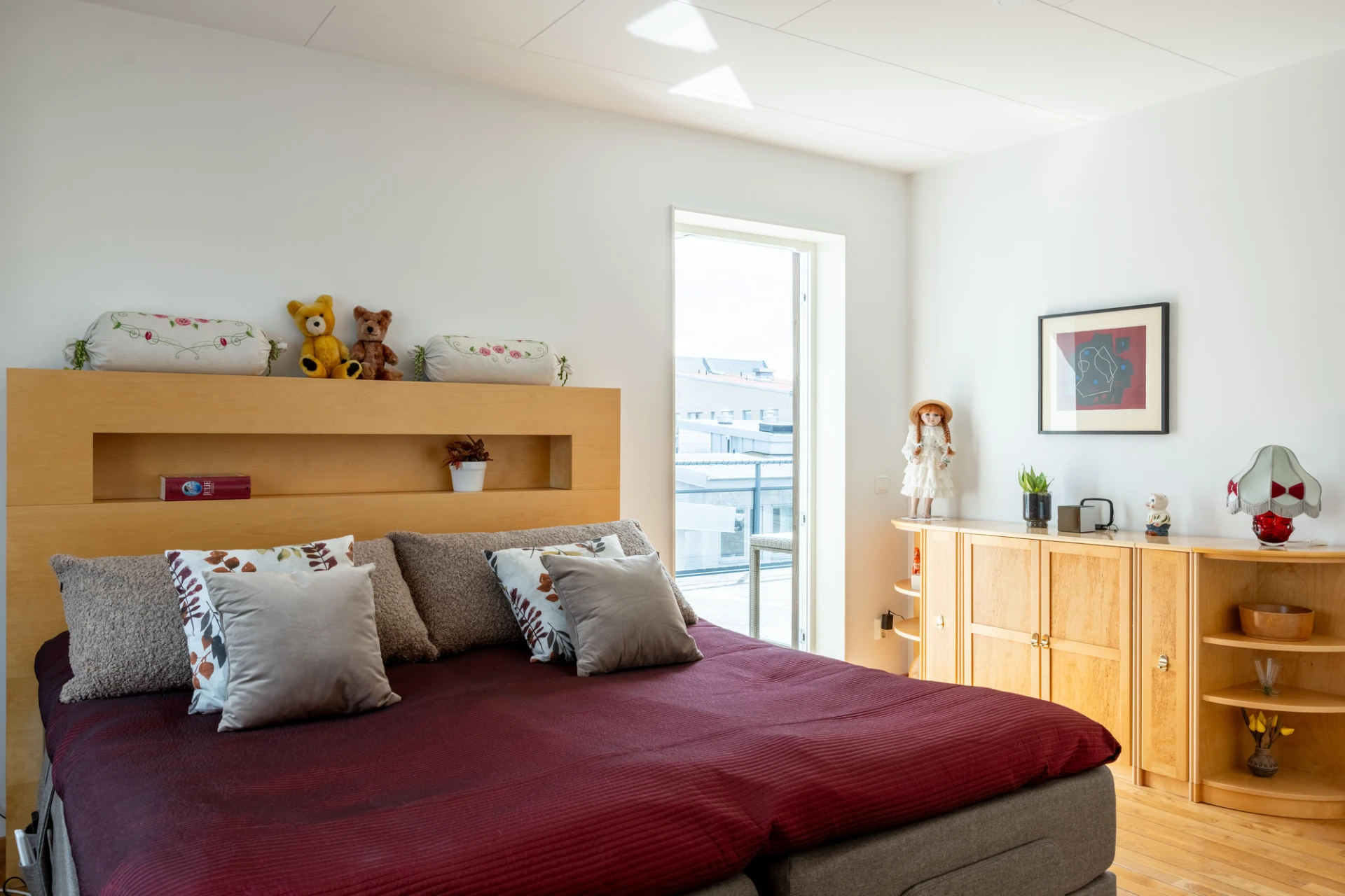 Skeppsgolv och vita väggar. Förvaring i skjutdörrsgarderob. Utgång till terrass.
