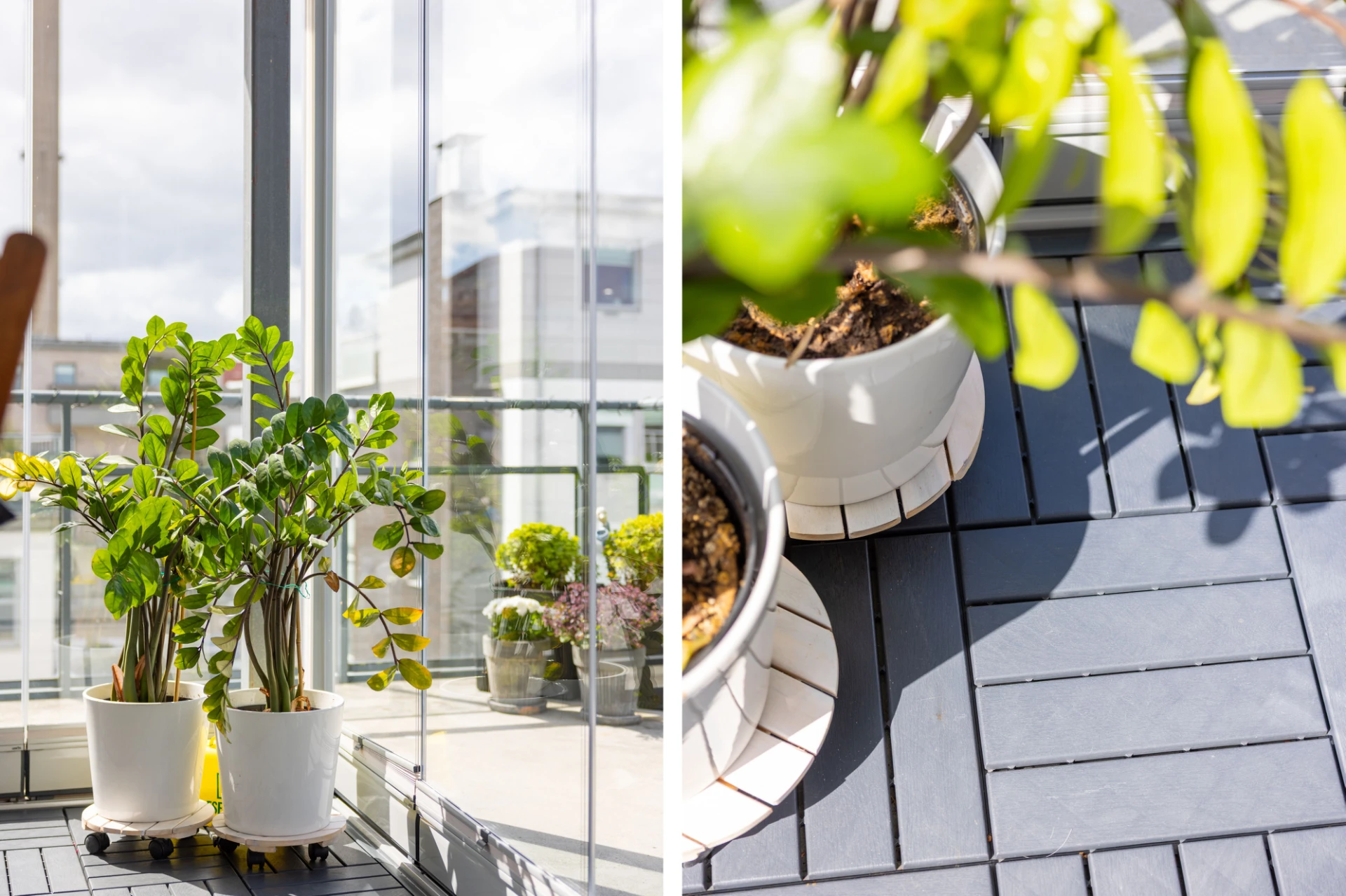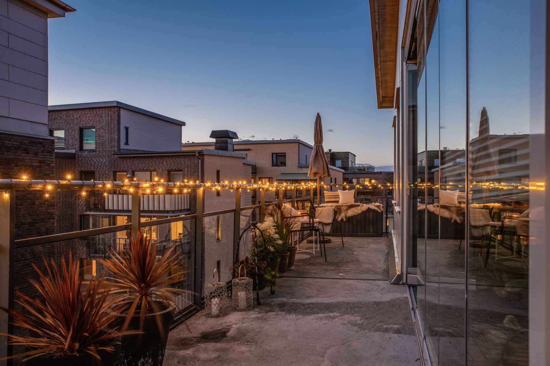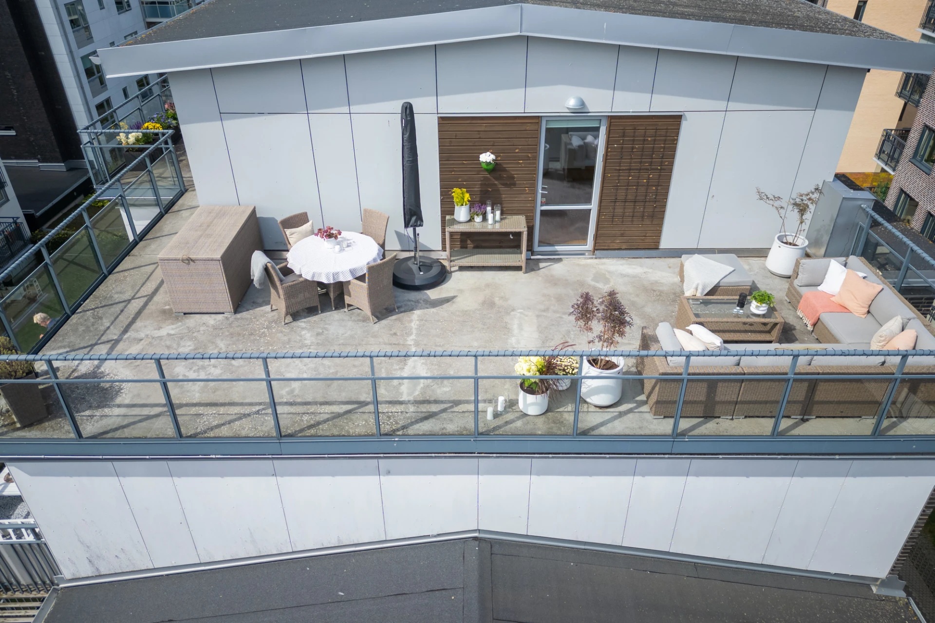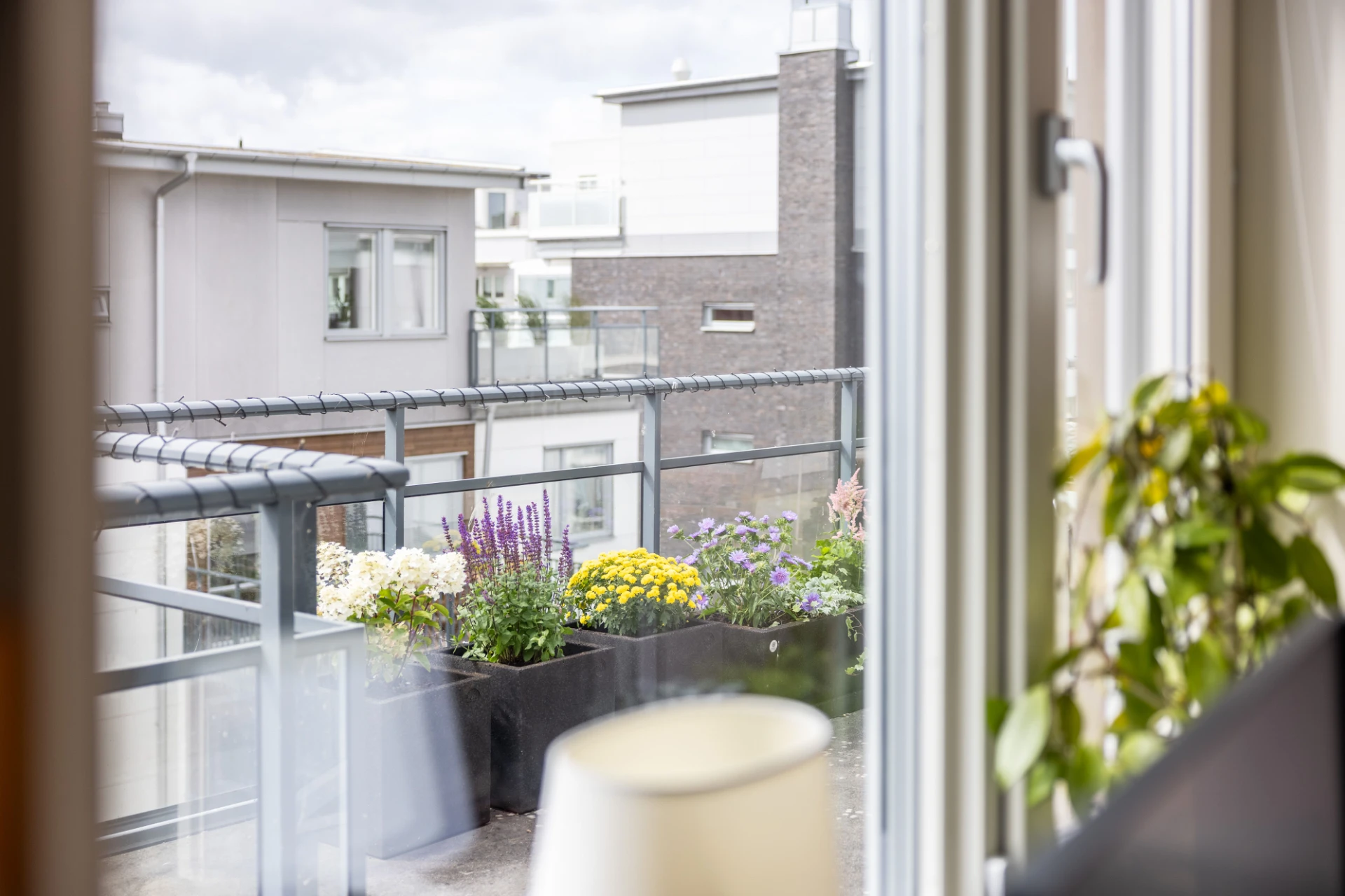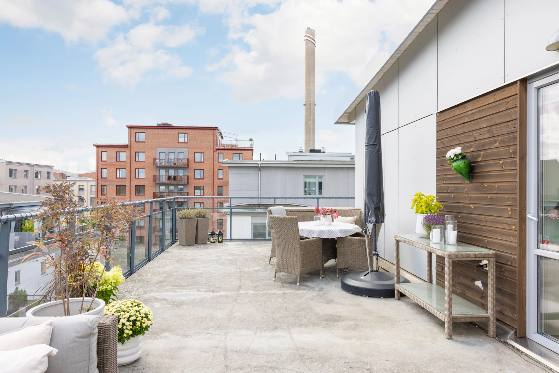 Skeppsgolv och vita väggar. Förvaring i skjutdörrsgarderob. Utgång till terrass.