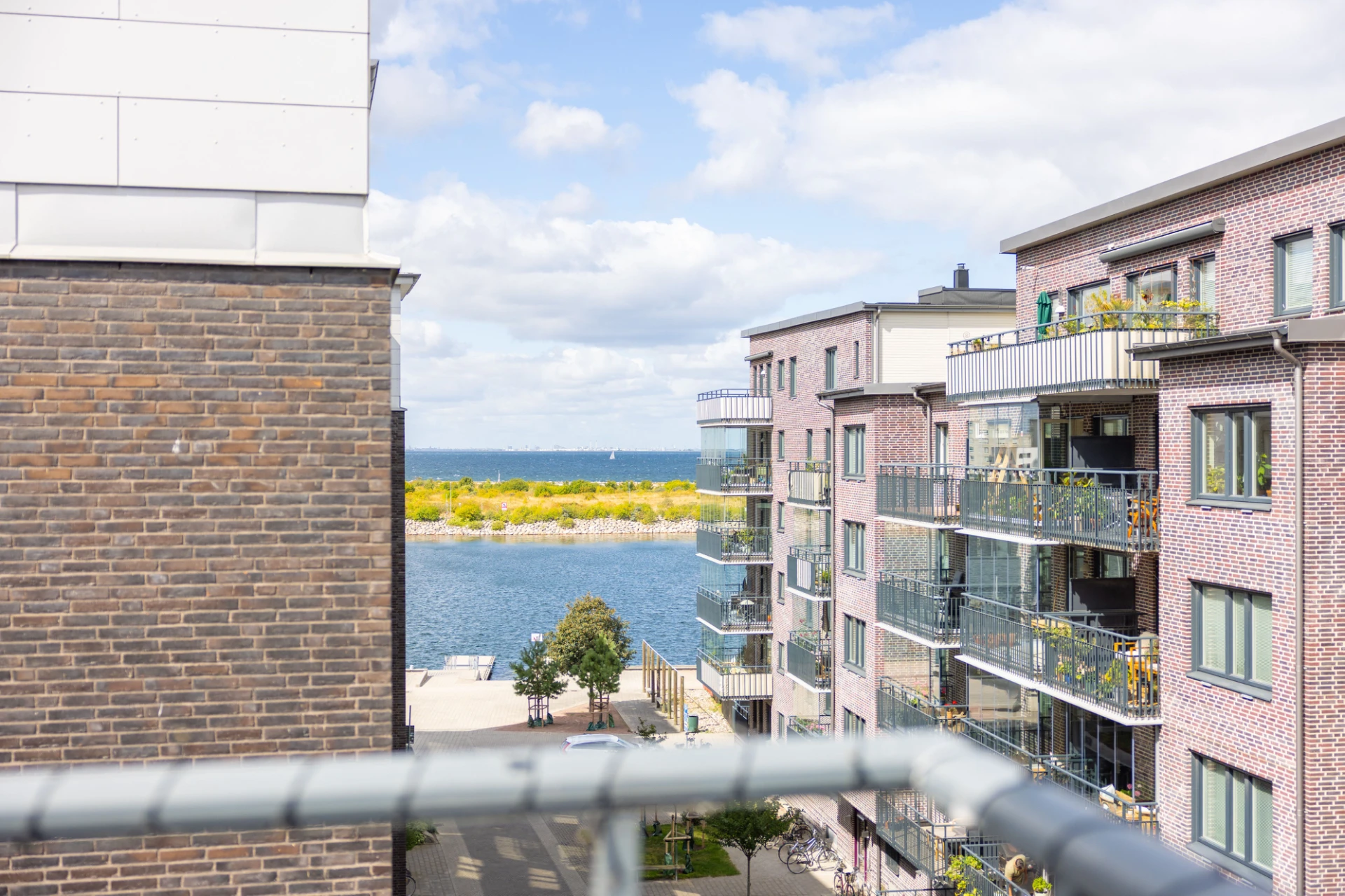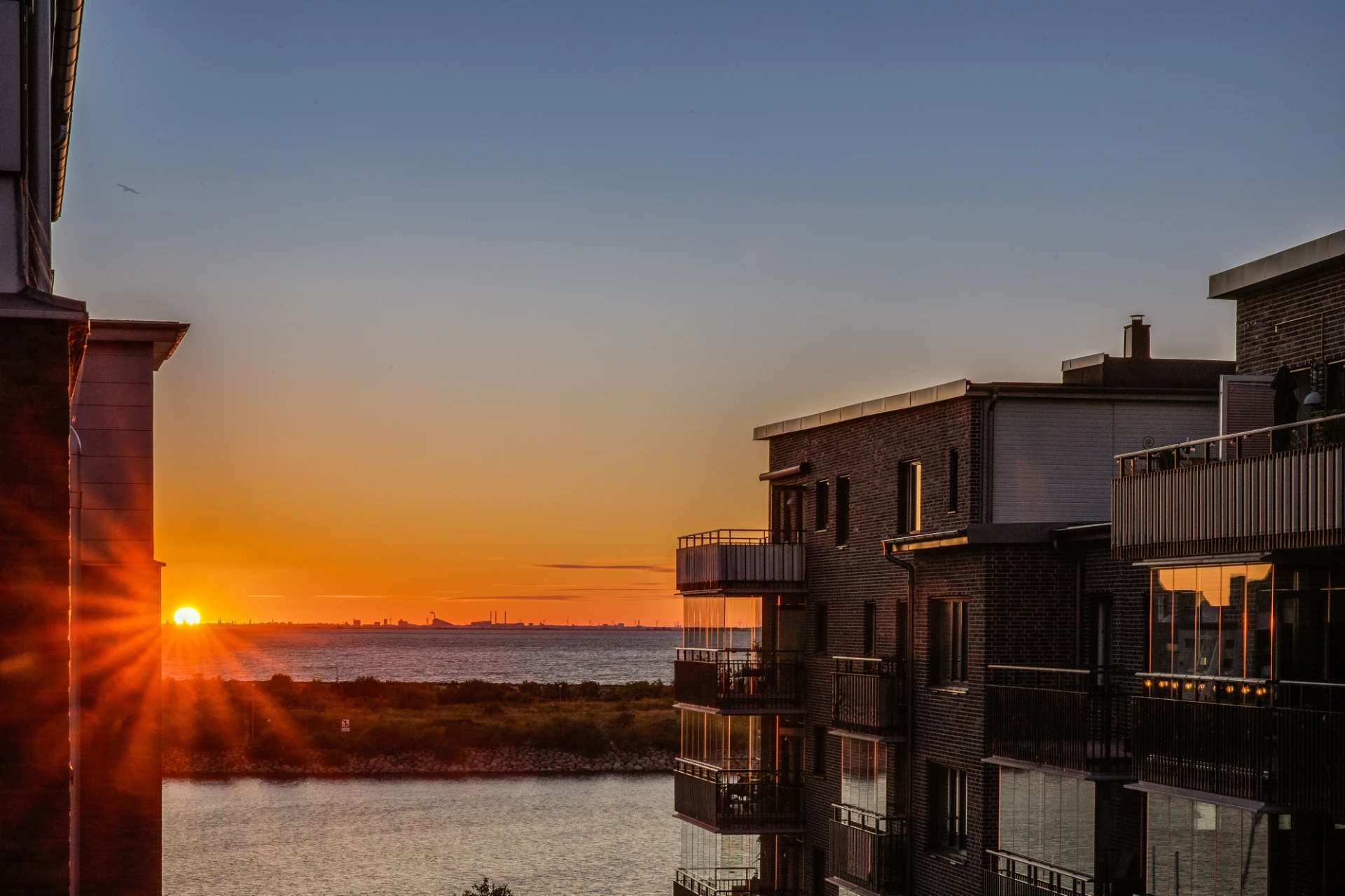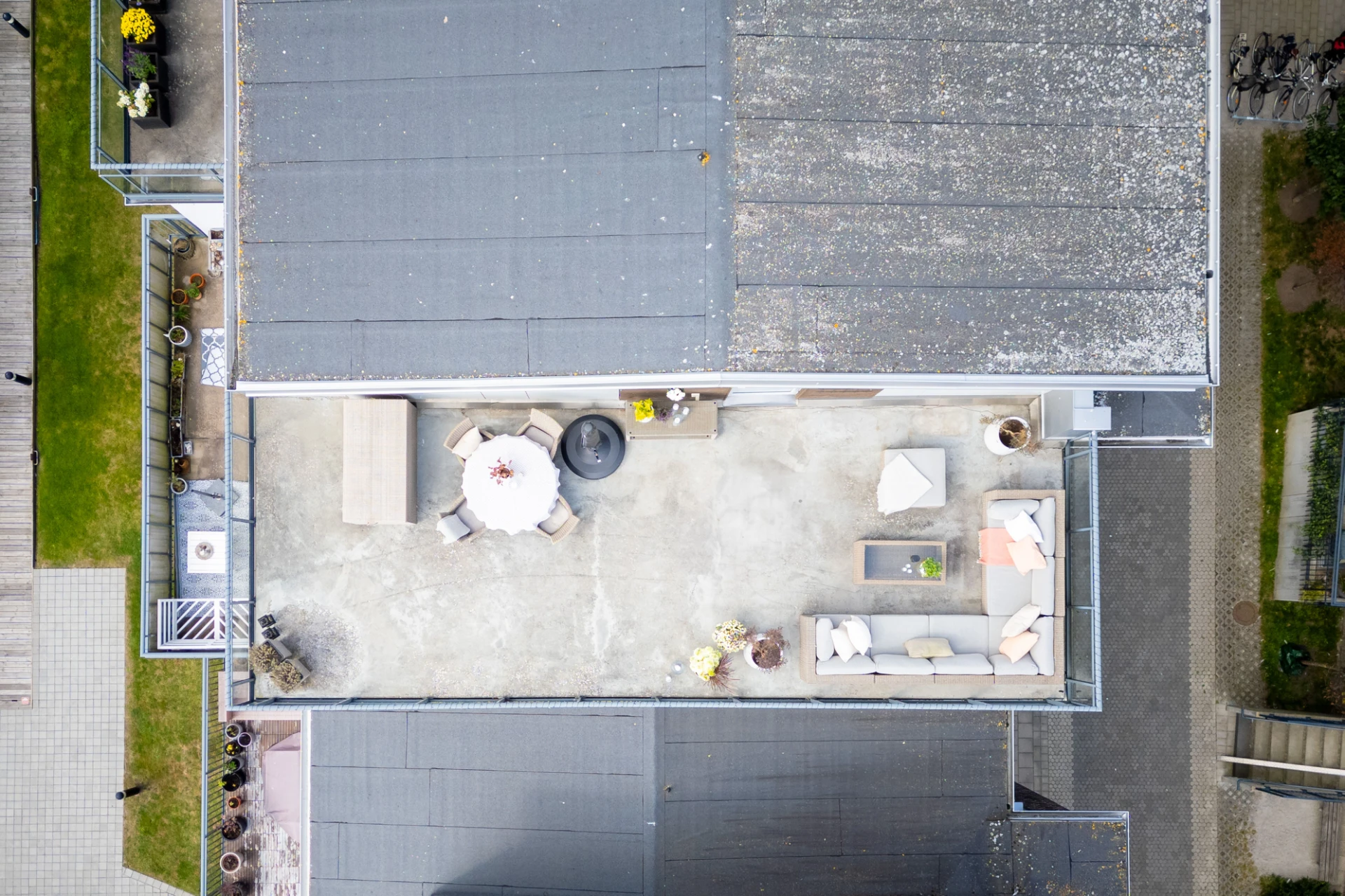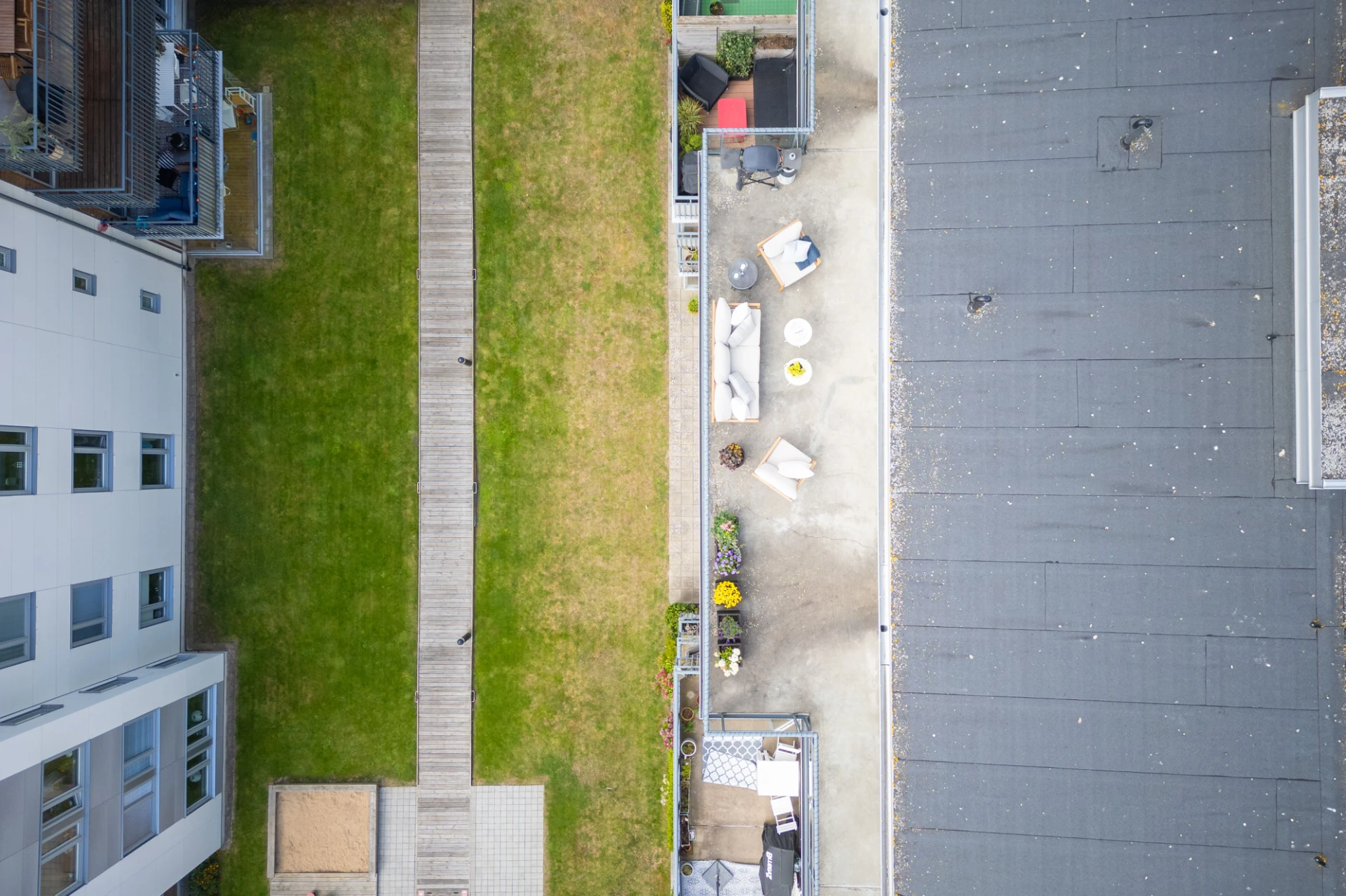 Skeppsgolv och vita väggar. Förvaring i skjutdörrsgarderob. Utgång till terrass.