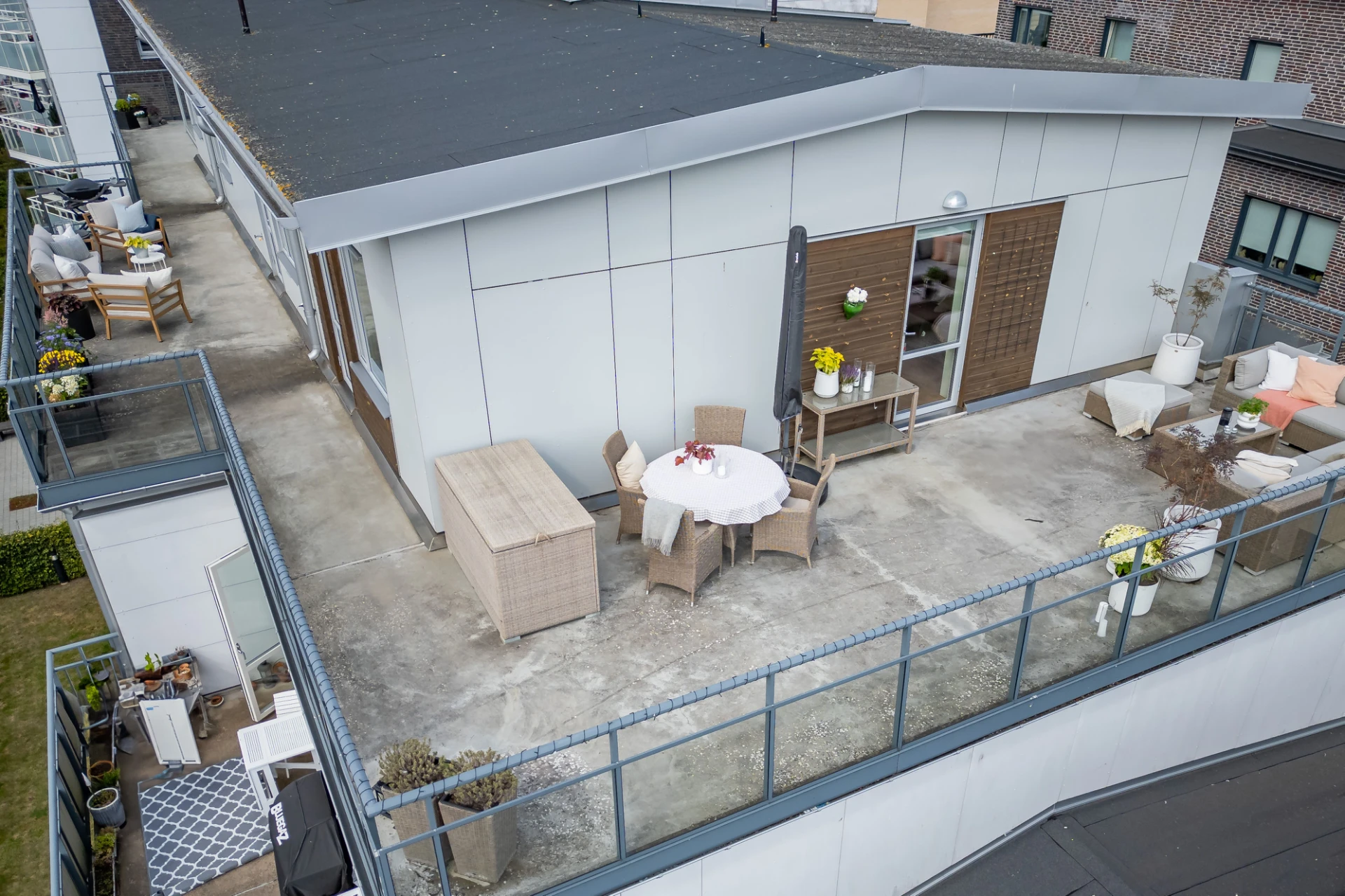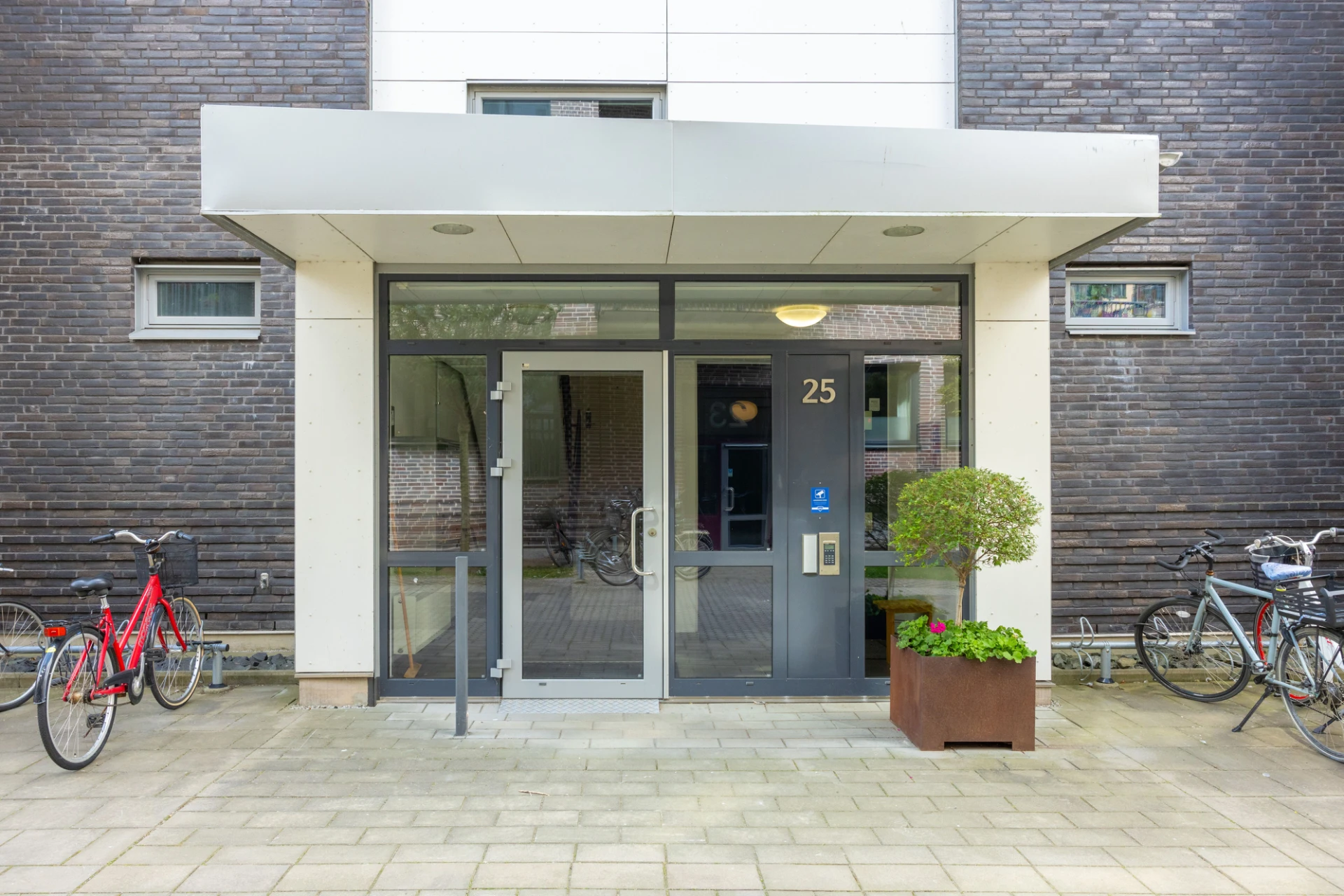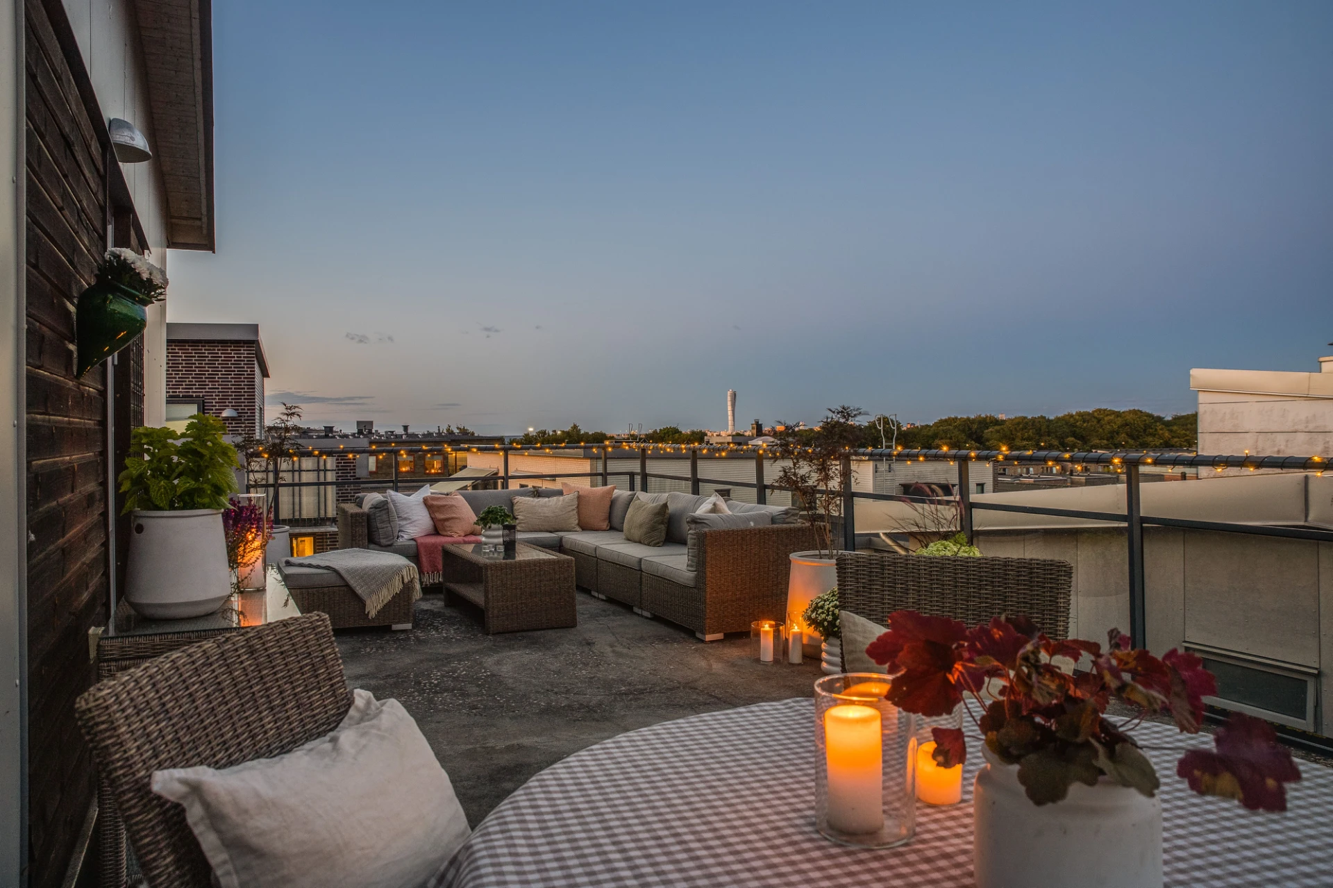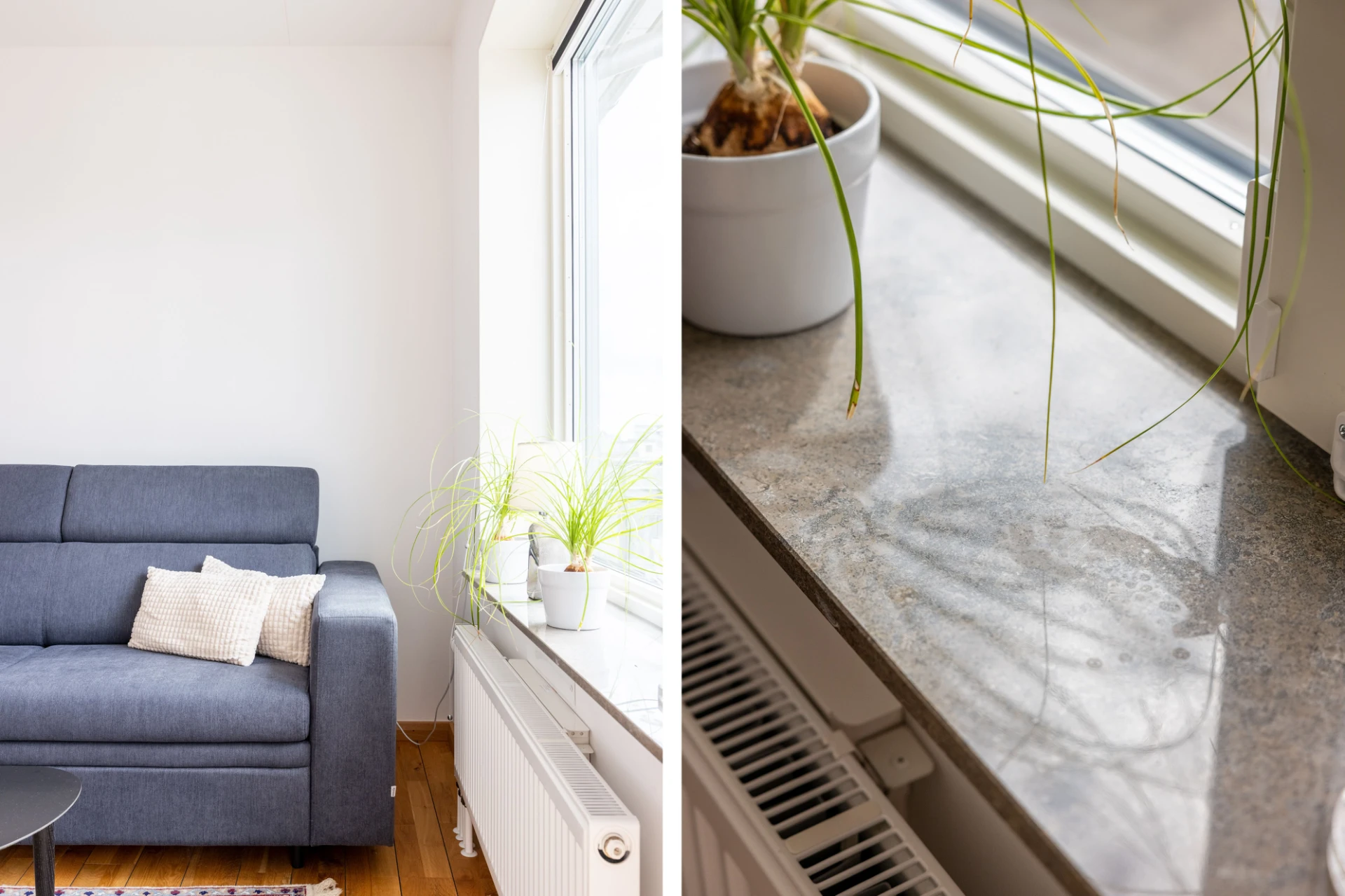 Skeppsgolv och vita väggar. Förvaring i skjutdörrsgarderob. Utgång till terrass.