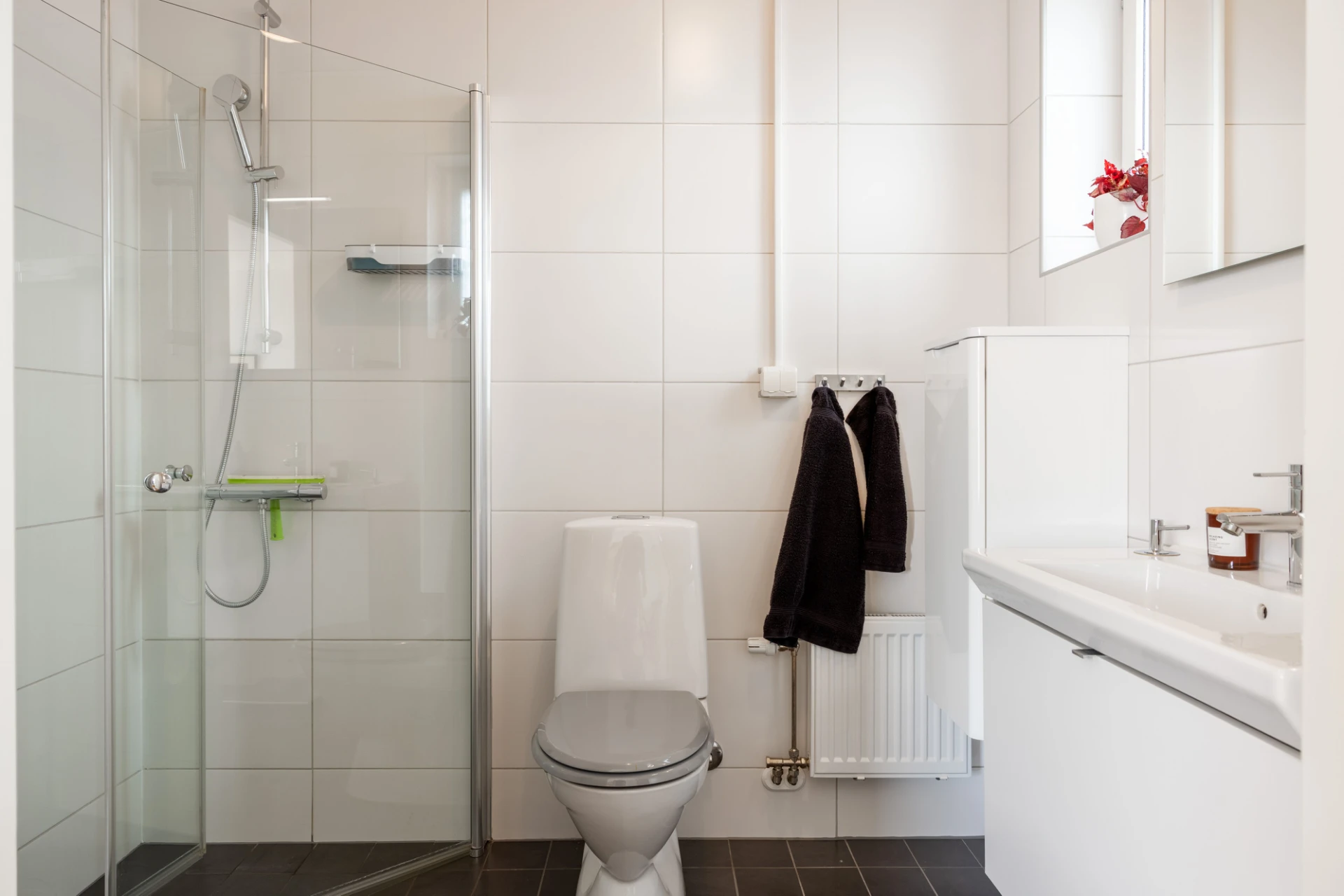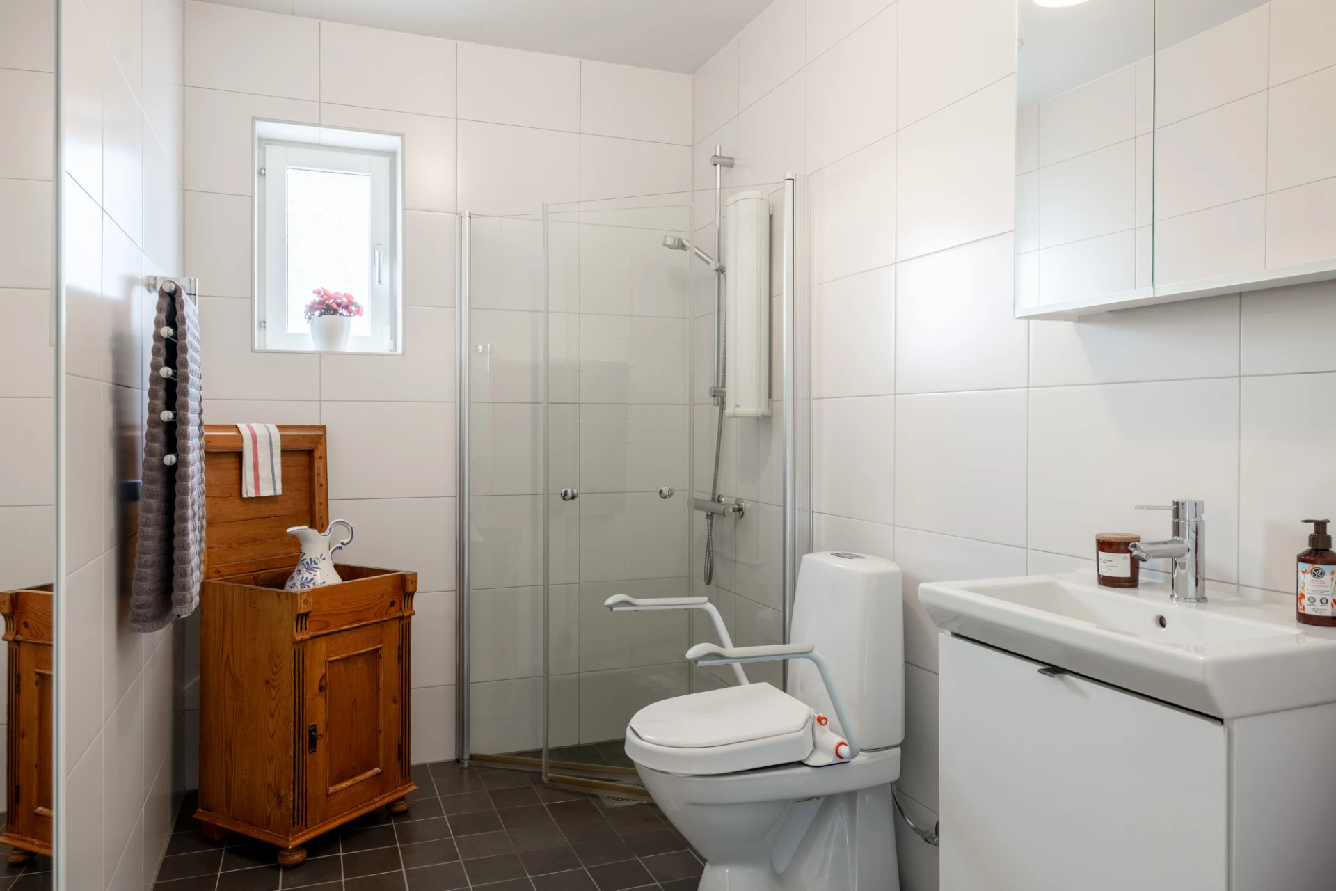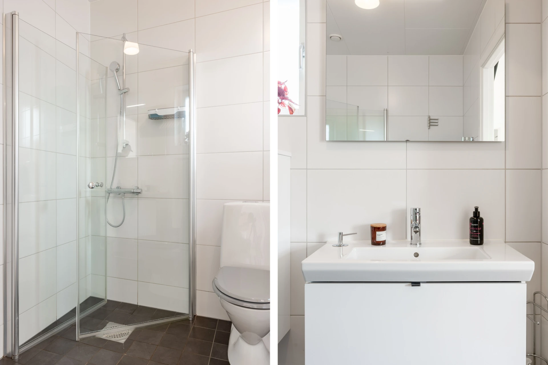 Mörk klinker och vitt kakel. Utrustat med dusch med vikbara duschväggar, wc, handfat med kommod, spegel och väggskåp.
