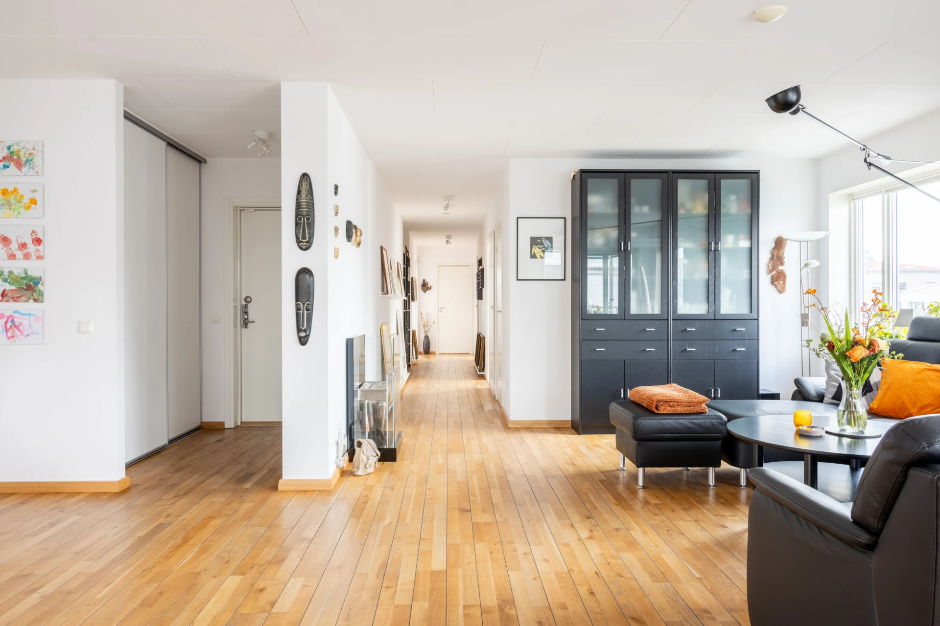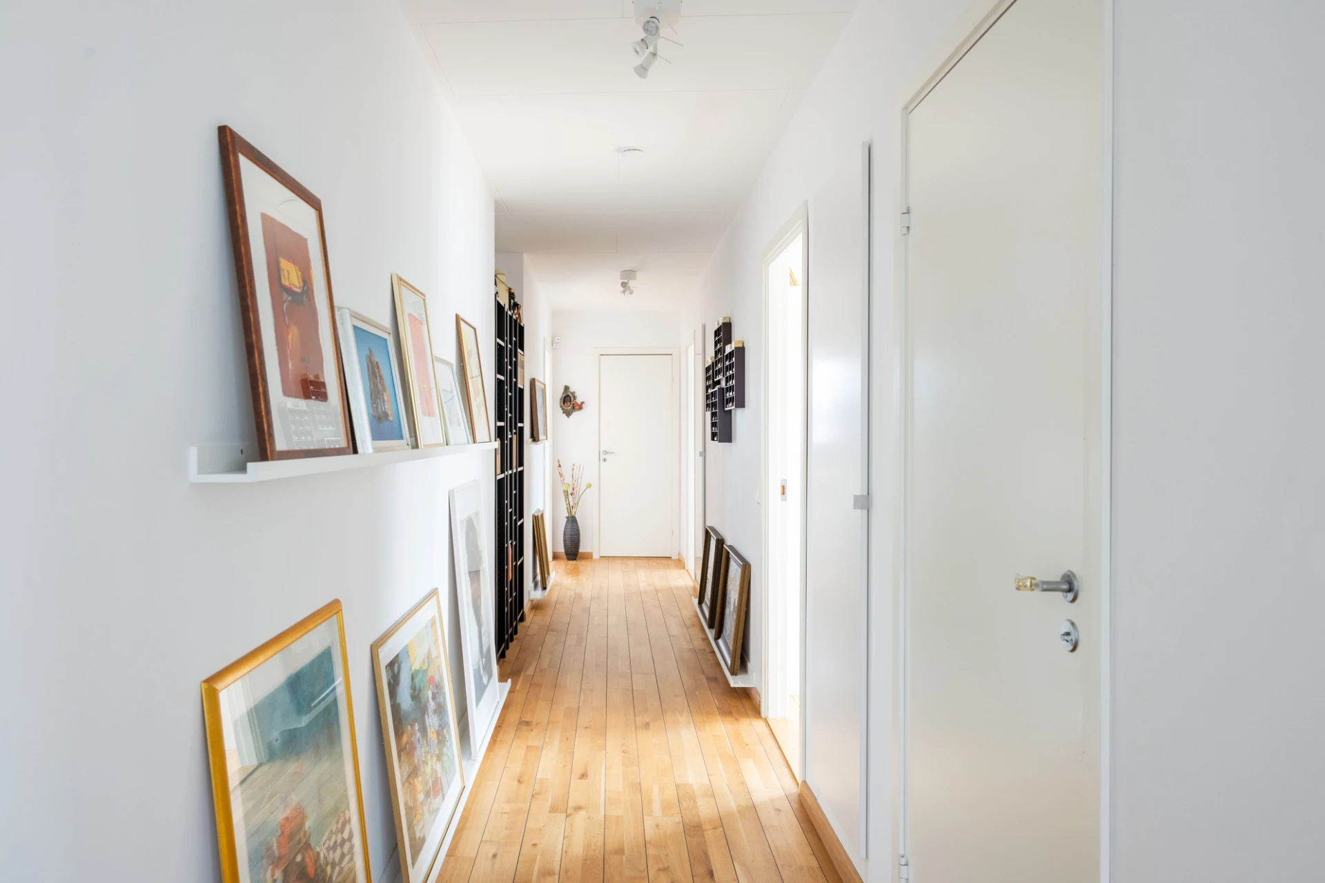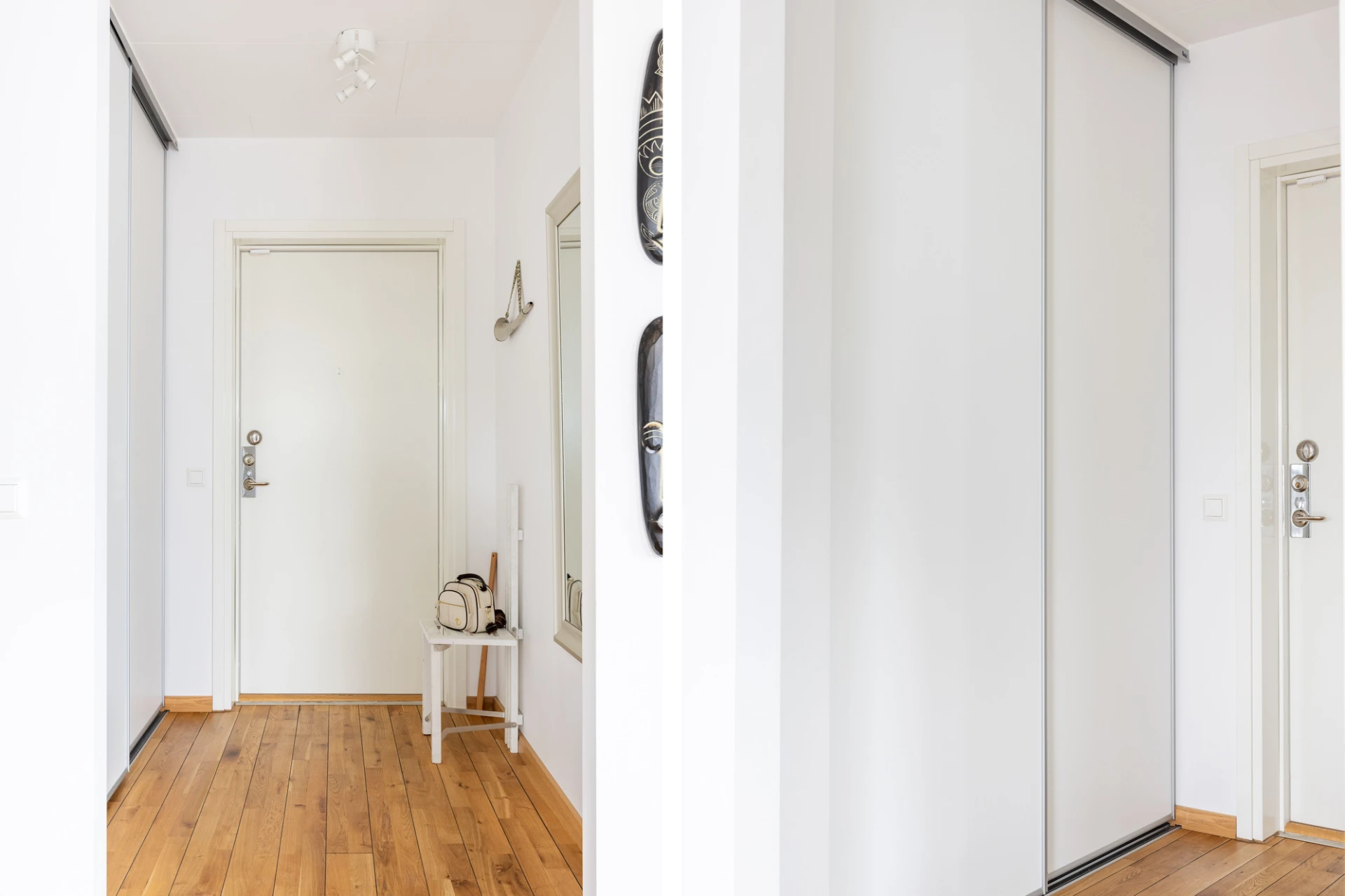 Skeppsgolv och vita väggar. Förvaring i skjutdörrsgarderob.