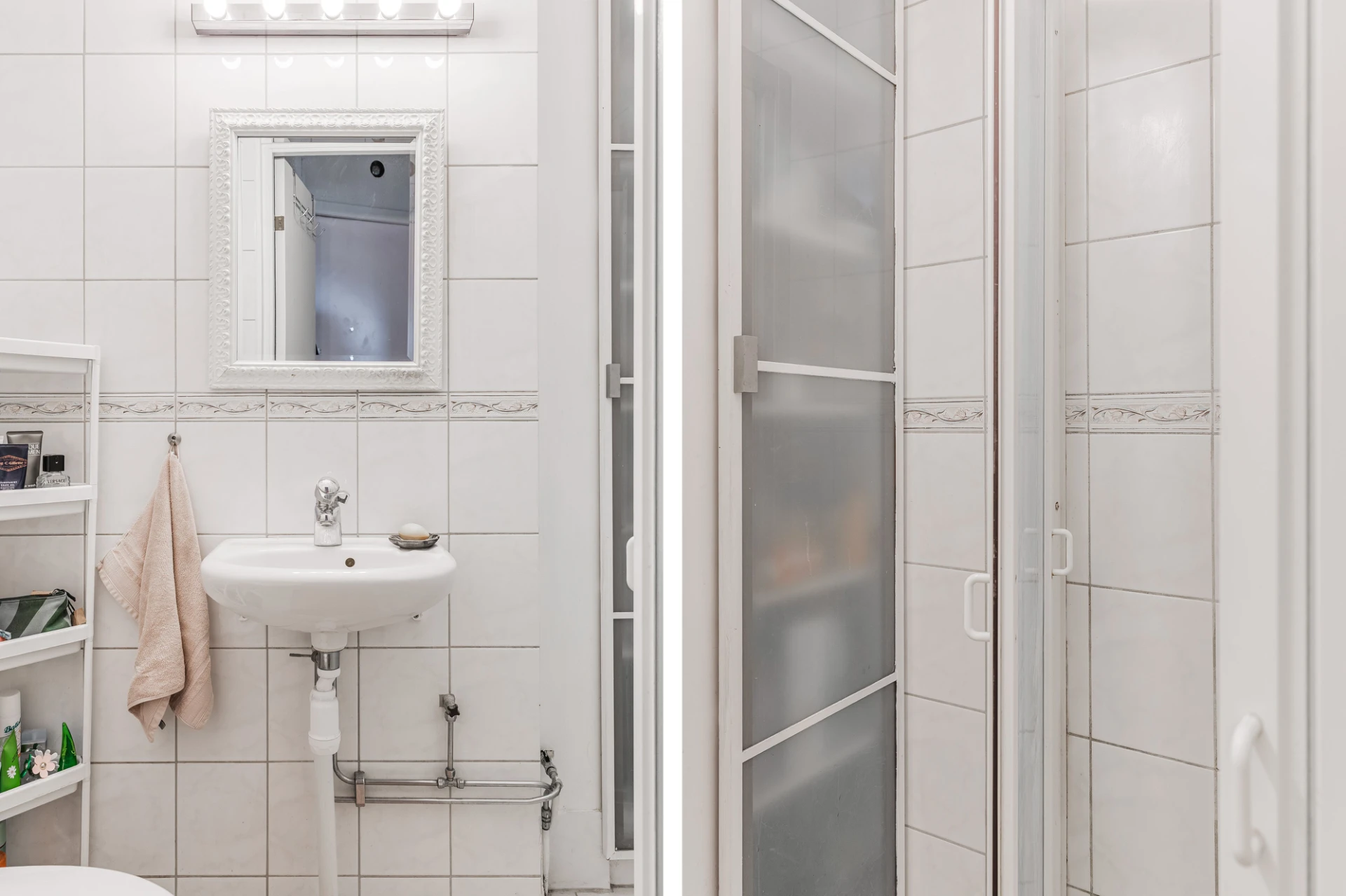Helkaklat badrum, utrustat med dusch, handfat, wc och förvaringsskåp.