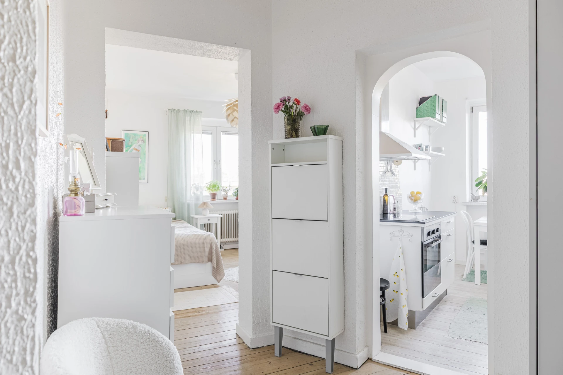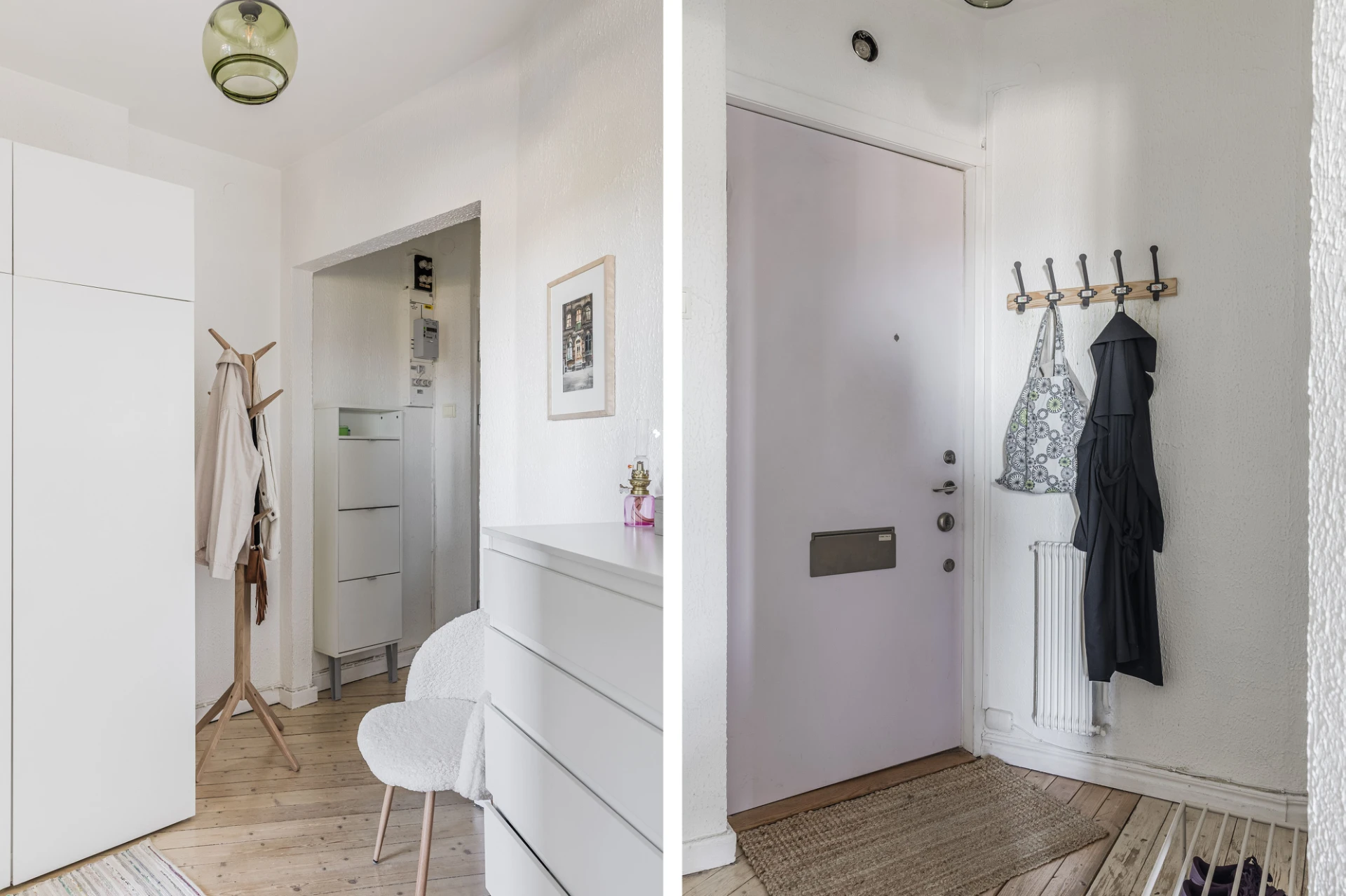 Välkomnande hall med plats för avhängning samt förvaring i garderober. Vita väggar och brädgolv.