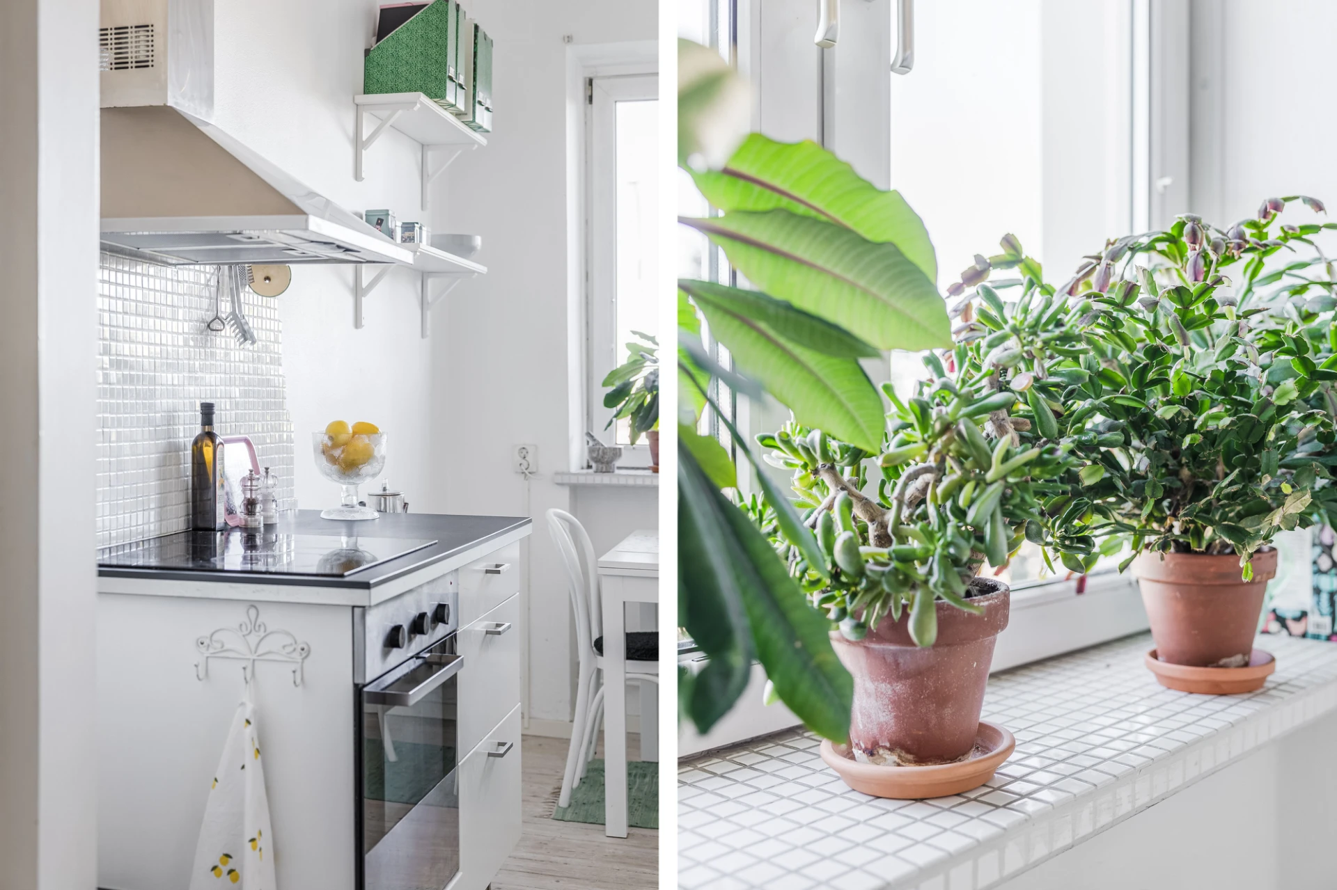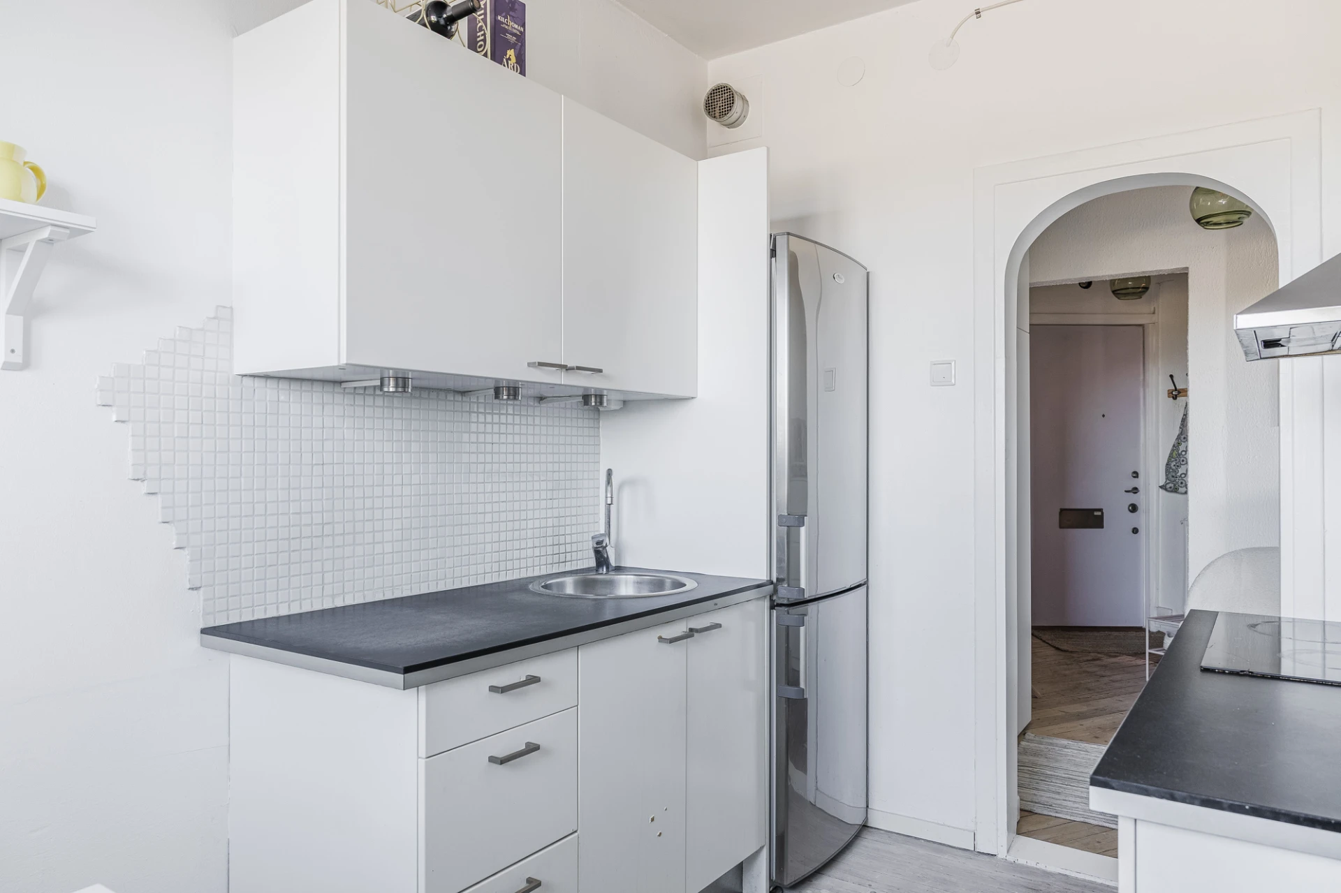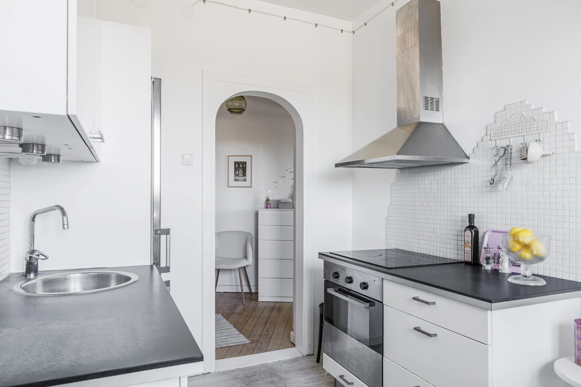 Stilrent kök med vit köksinredning, vitt mosaik som stänkskydd ovan bänkskivan i svart laminat. Arbetsyta ges på båda sidorna av köket. Utrustningen består av spis, ugn, fläkt, kyl och frys. Matplats för två-tre personer. Vita väggar och brädgolv.