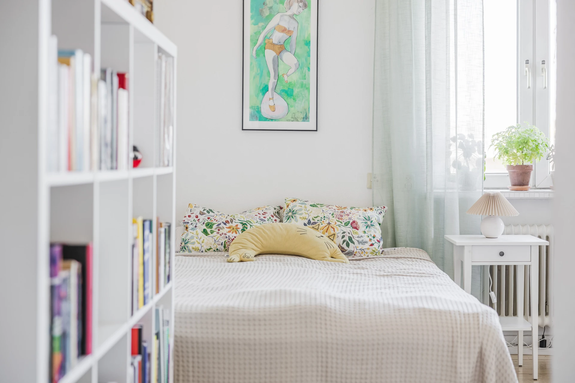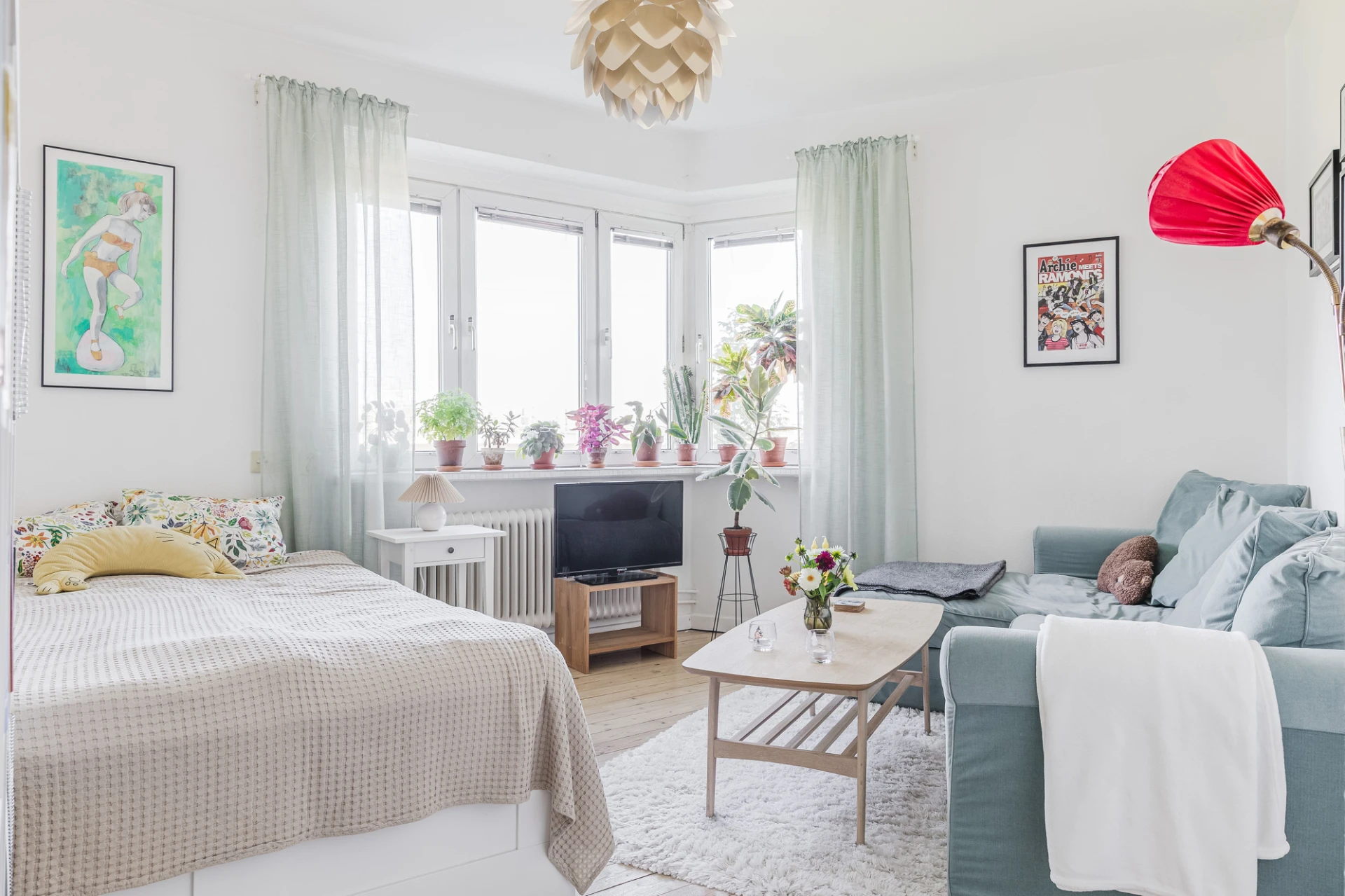 Väl tilltaget allrum beläget på hörnläge med fönster i två väderstreck. Här ryms sovdel och soffgrupp. Vita väggar och brädgolv.