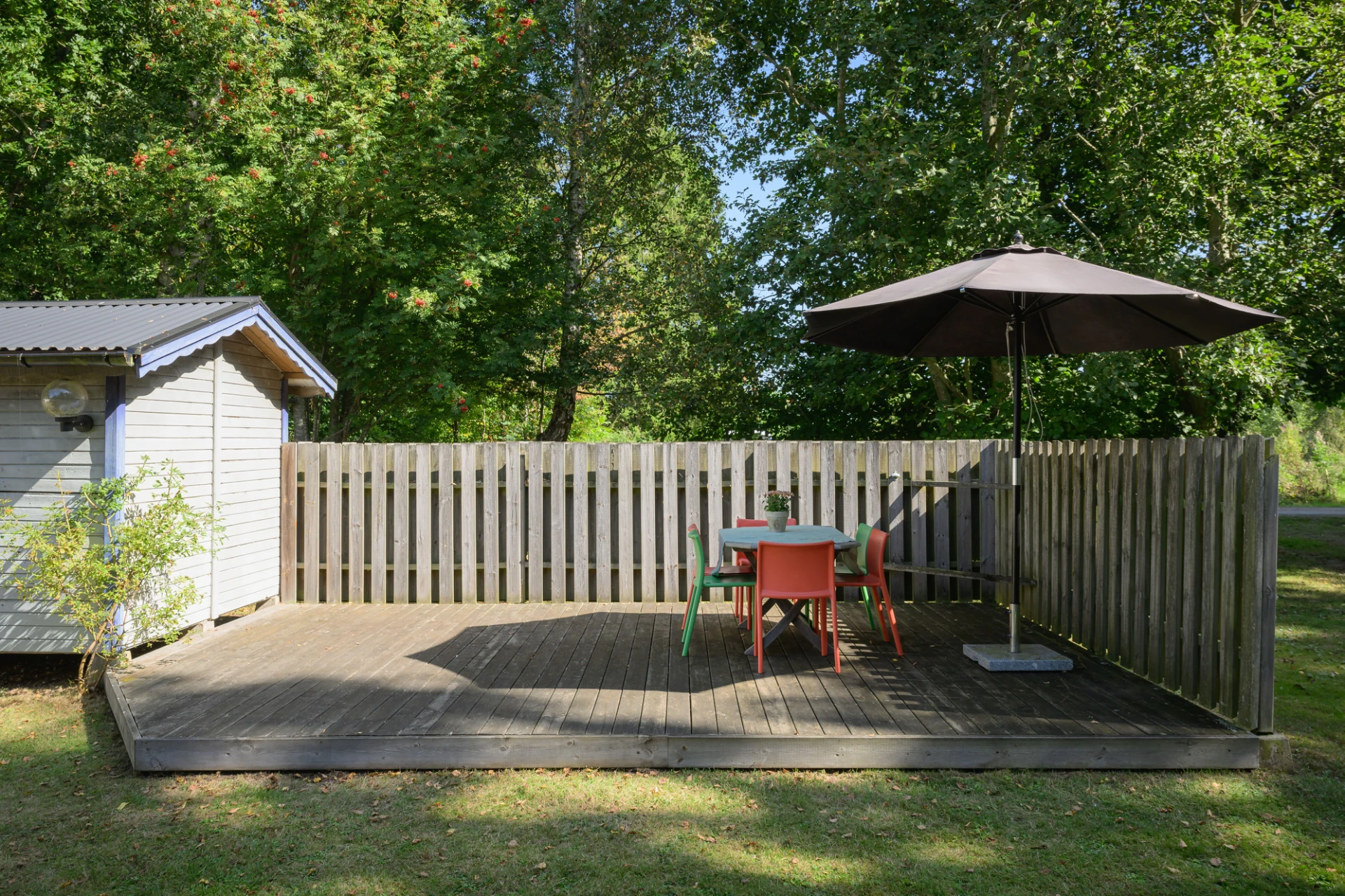 Beskrivning uteplats: Terrass vid huset med solchans från morgon till kväll samt terrass söder om friggeboden med solchans från förmiddag till kväll (sommartid).