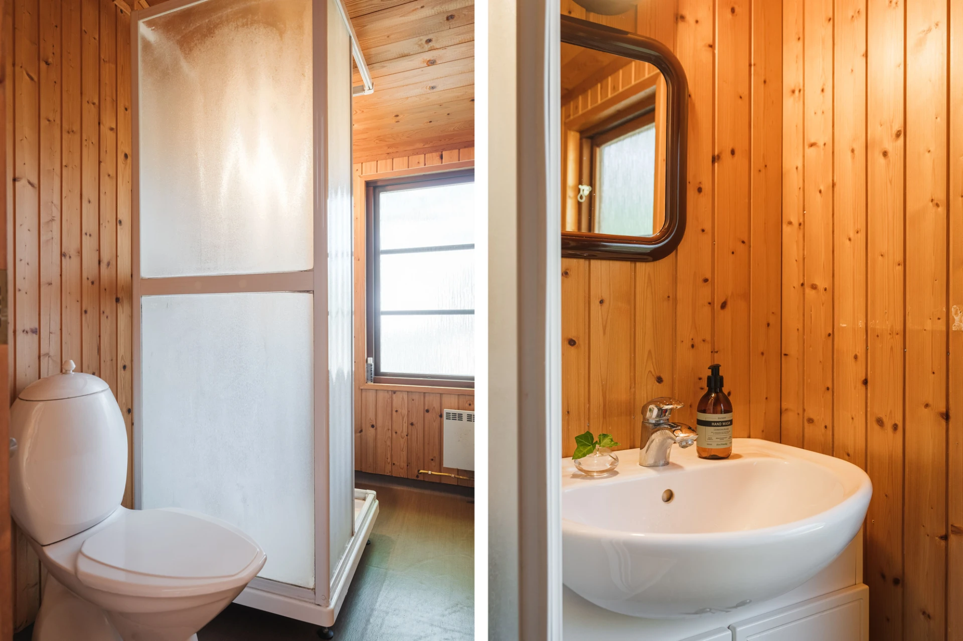 Våtrumsmatta och träpanel. Utrustat med duschkabin, wc, handfat med underskåp och spegel.