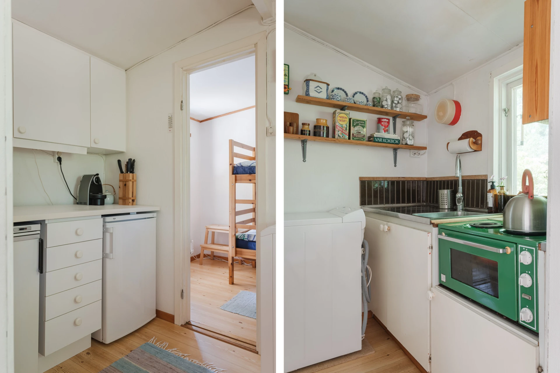 Laminatgolv och vitmålad vävtapet. Utrustat med spis med ugn (Kockum), kyl (Upo) och frys (ElektroHelios) i halvhöjd samt toppmatad tvättmaskin (Elvita 2004).
