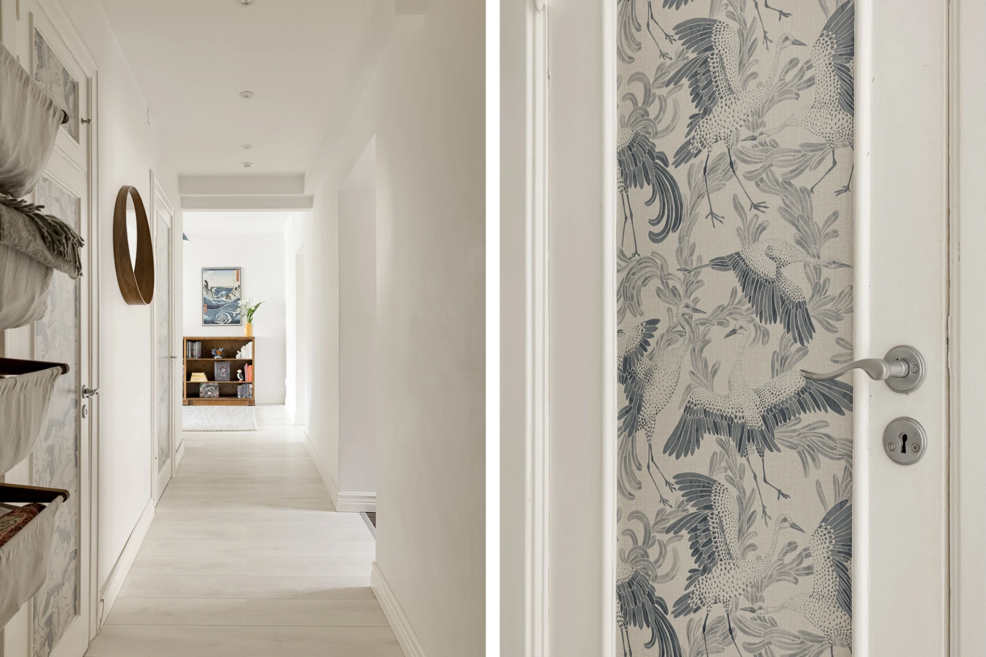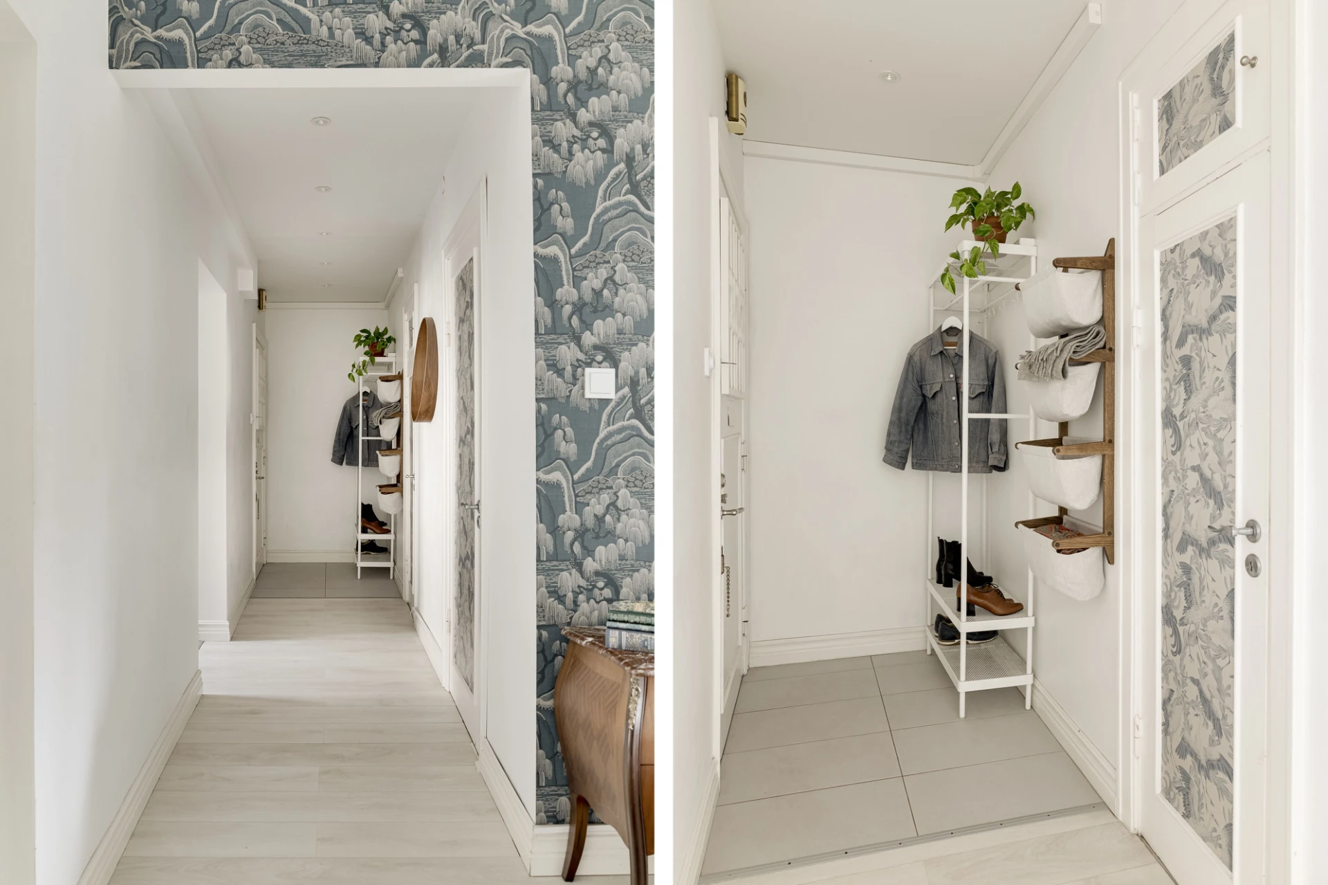 Vitt klinker som övergår till laminat golv i vit ask, vitta väggar med inslag av tapetdetaljer
