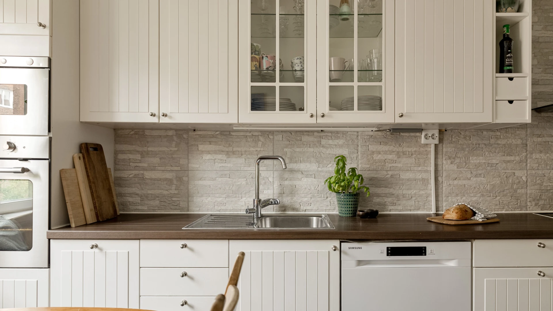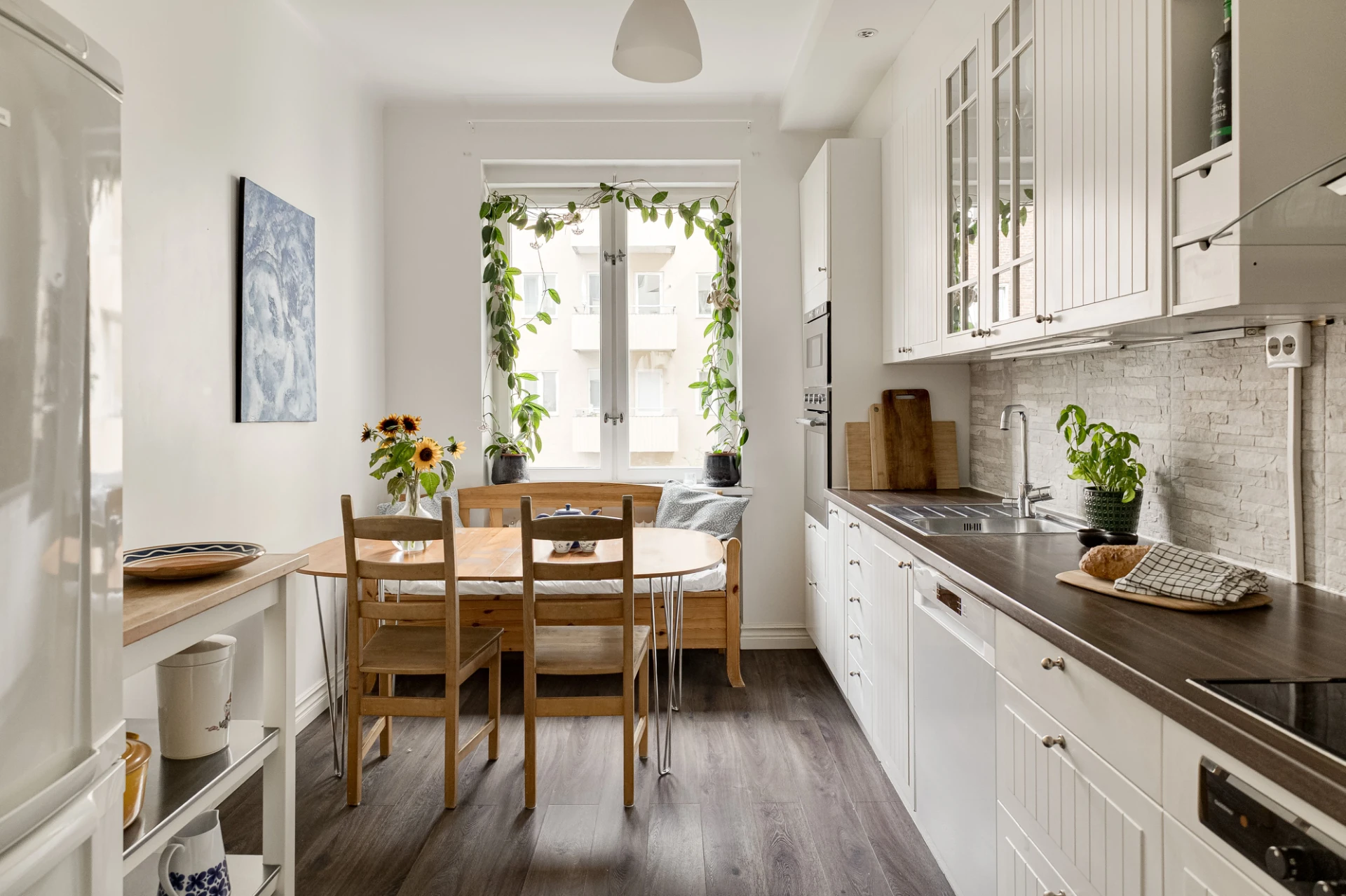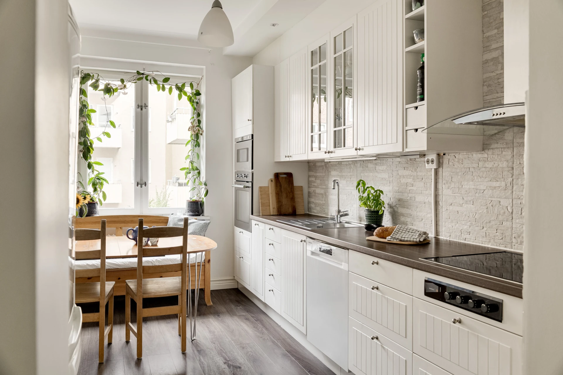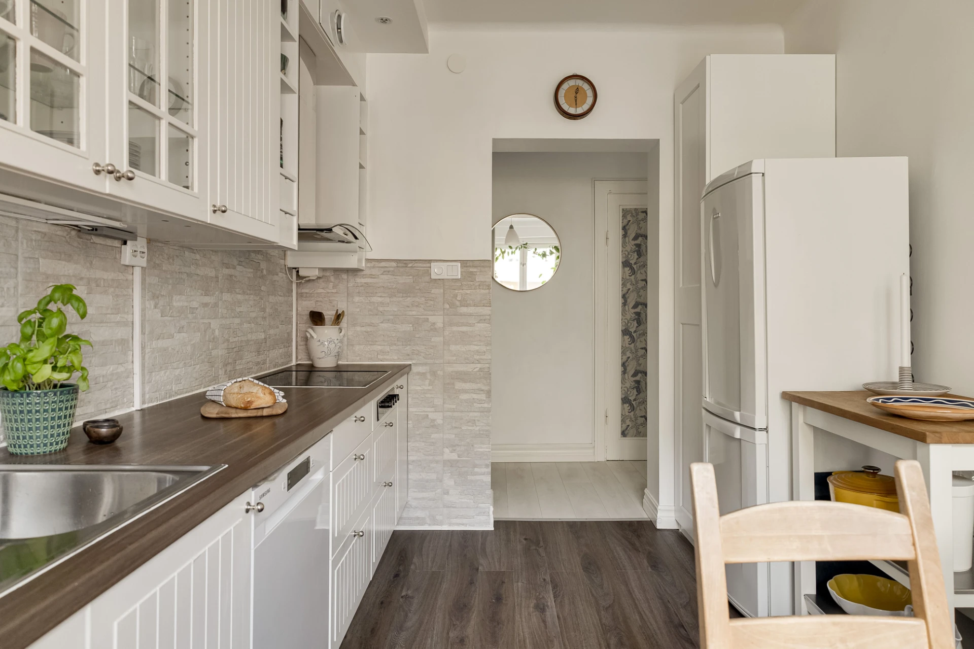 Mörkt laminatgolv med vita väggar, vit köksinredning, stenpartier ovan mörk bänkskiva i träimitation. Ugnen är nyinstallerad 2024.