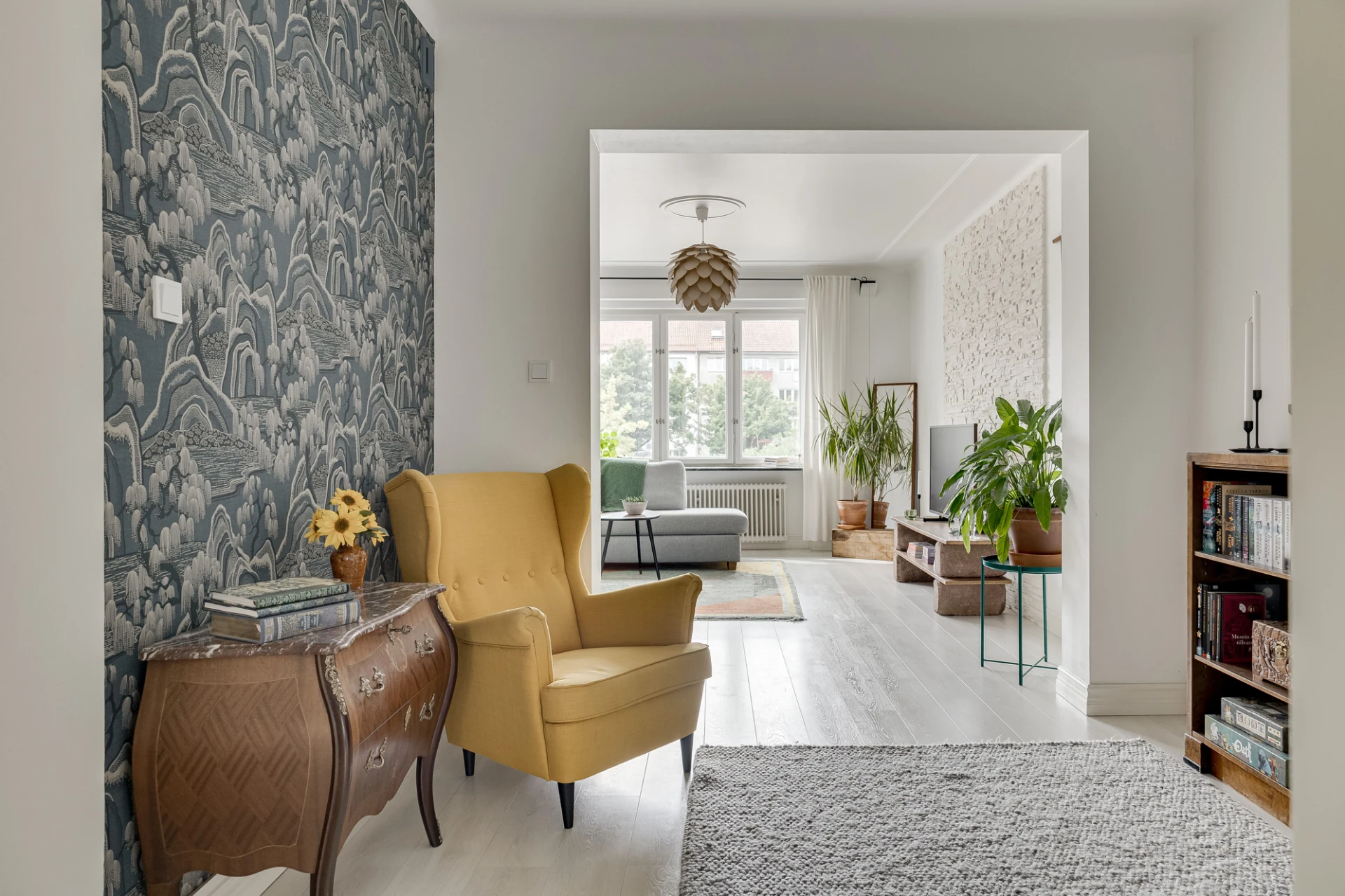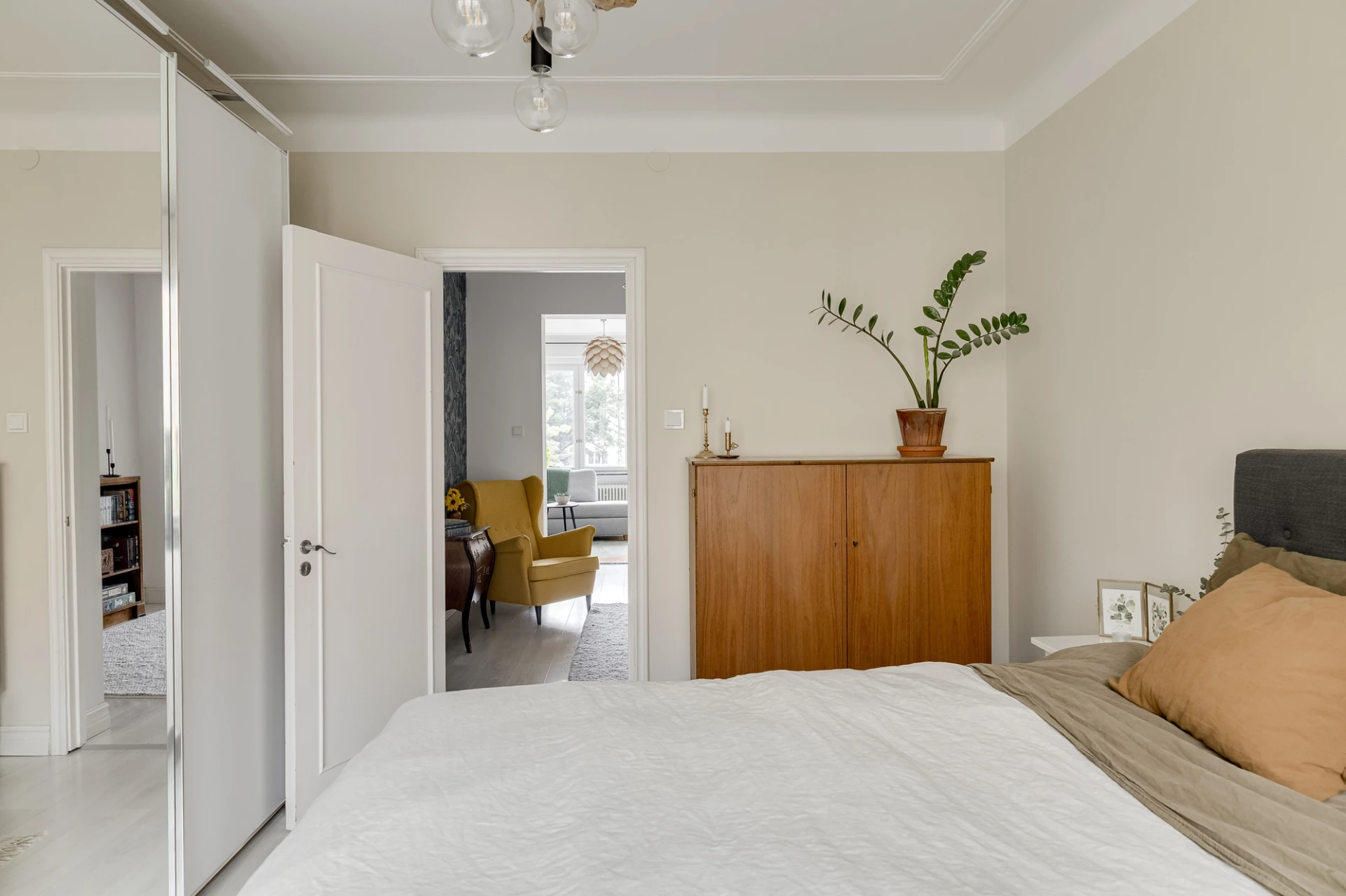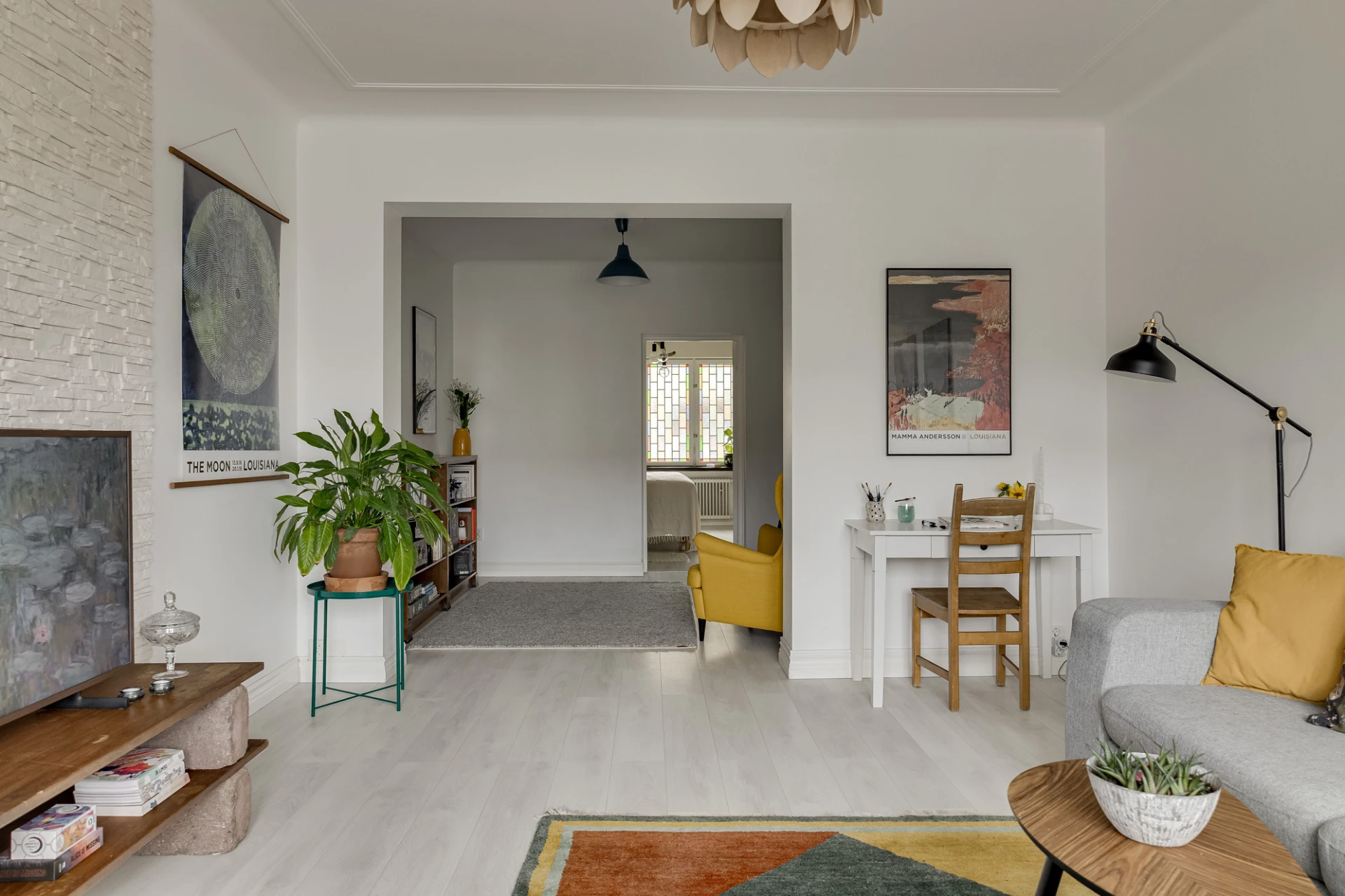 Bostaden är inflyttningsklar med fina ytskikt och en planlösning som bjuder på både rymd och funktion. Det stora vardagsrummet ramas in av tidstypiska detaljer och härifrån har du vy över nobeltorget. Den praktiska halvan erbjuder extra yta som enkelt kan användas som hemmakontor, läshörna eller matsal.