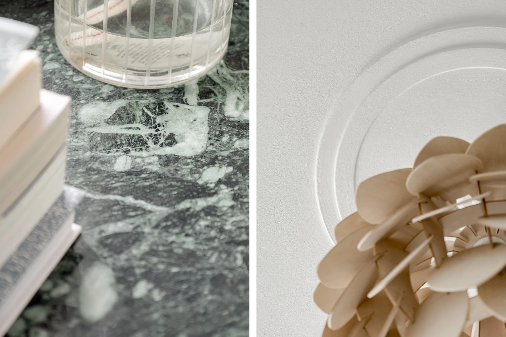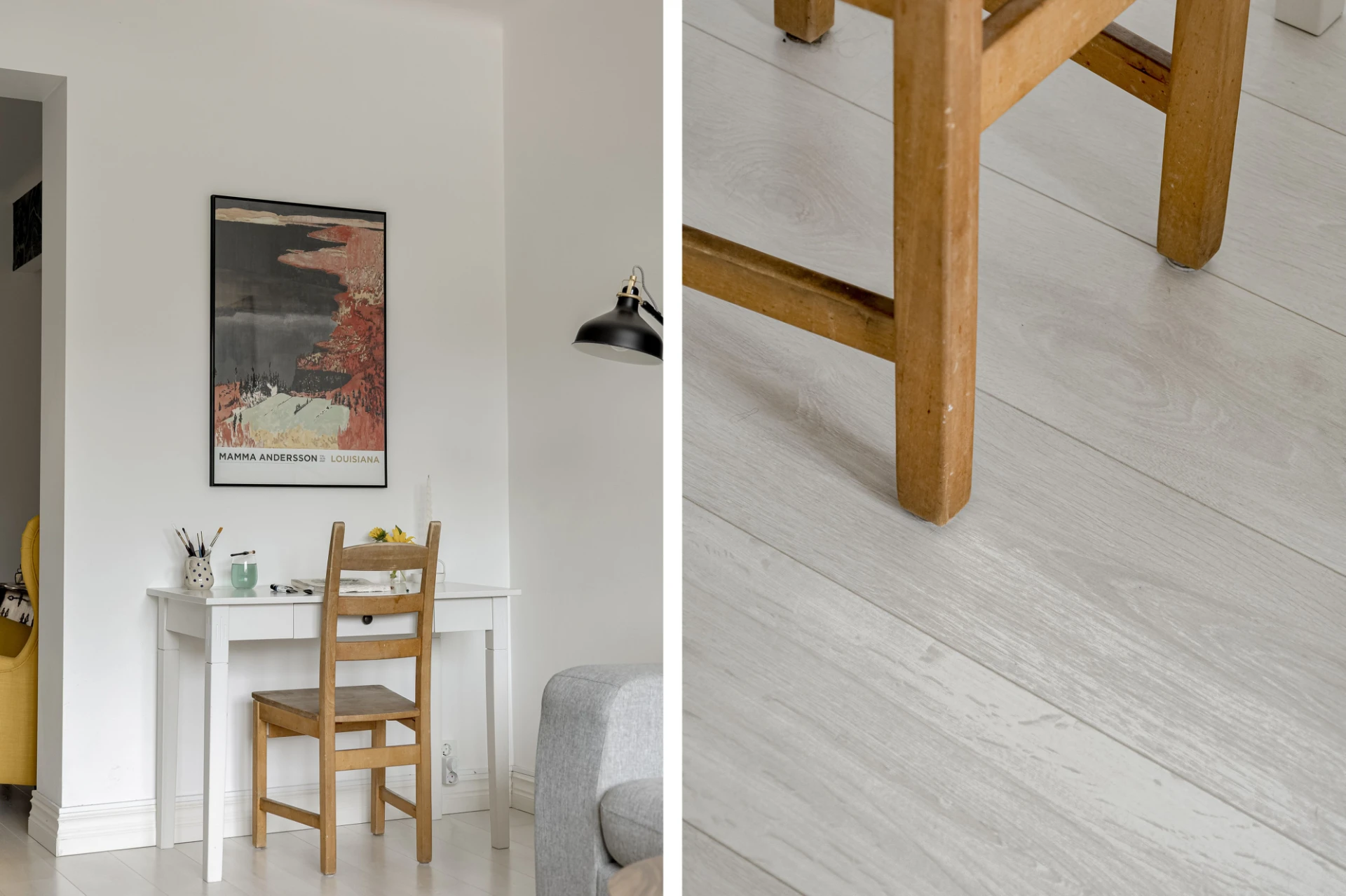 Laminat golv i vit ask och vaniljfärgade väggar, väggarna målade 2023, takstukatur och lamprosett