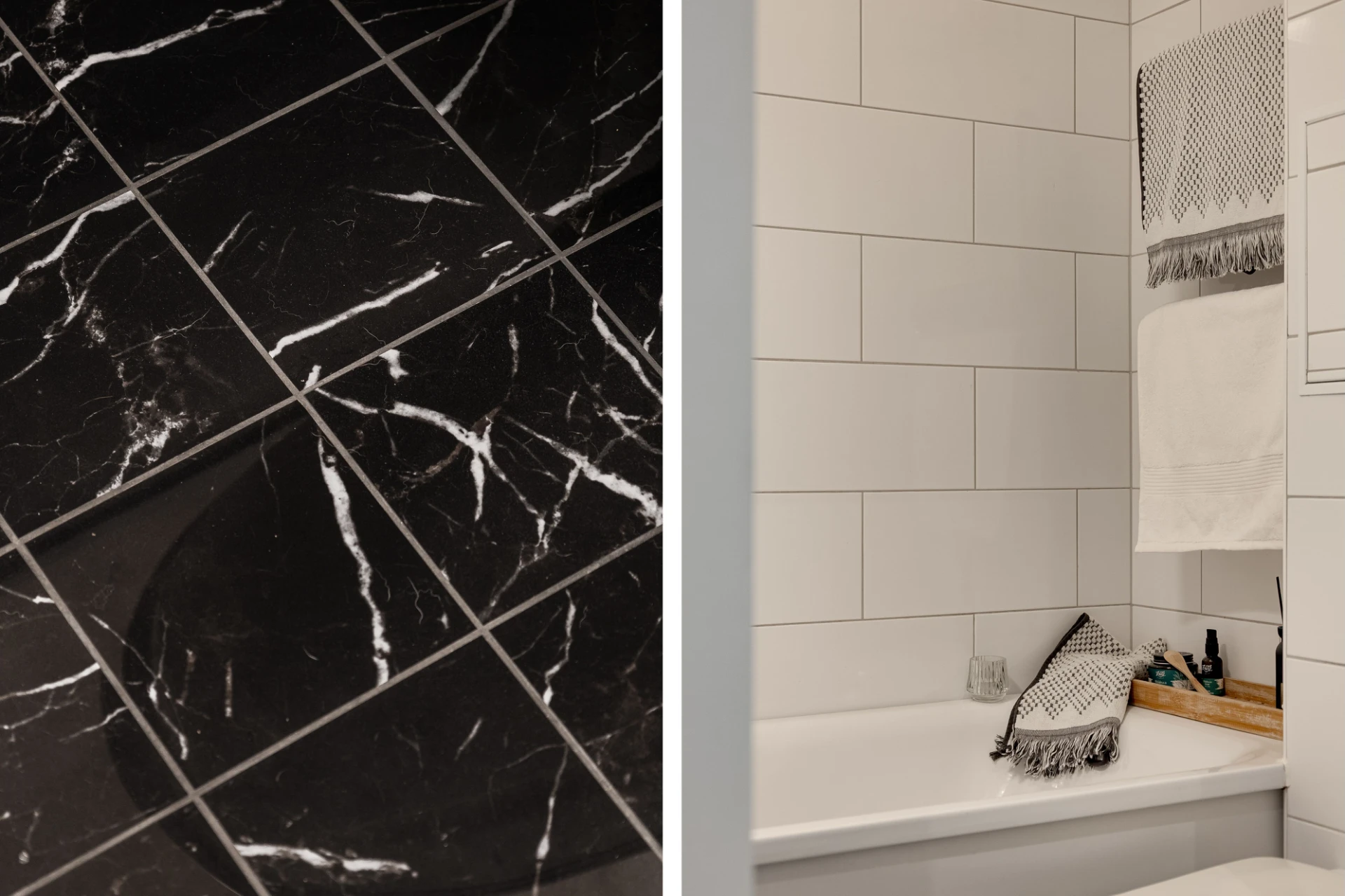 Svart marmorerat klinker på golv med vitt kakel på väggar, badrummet är utrustat med wc, tvättställ med kommod, spegelskåp och badkar med vägghängd dusch