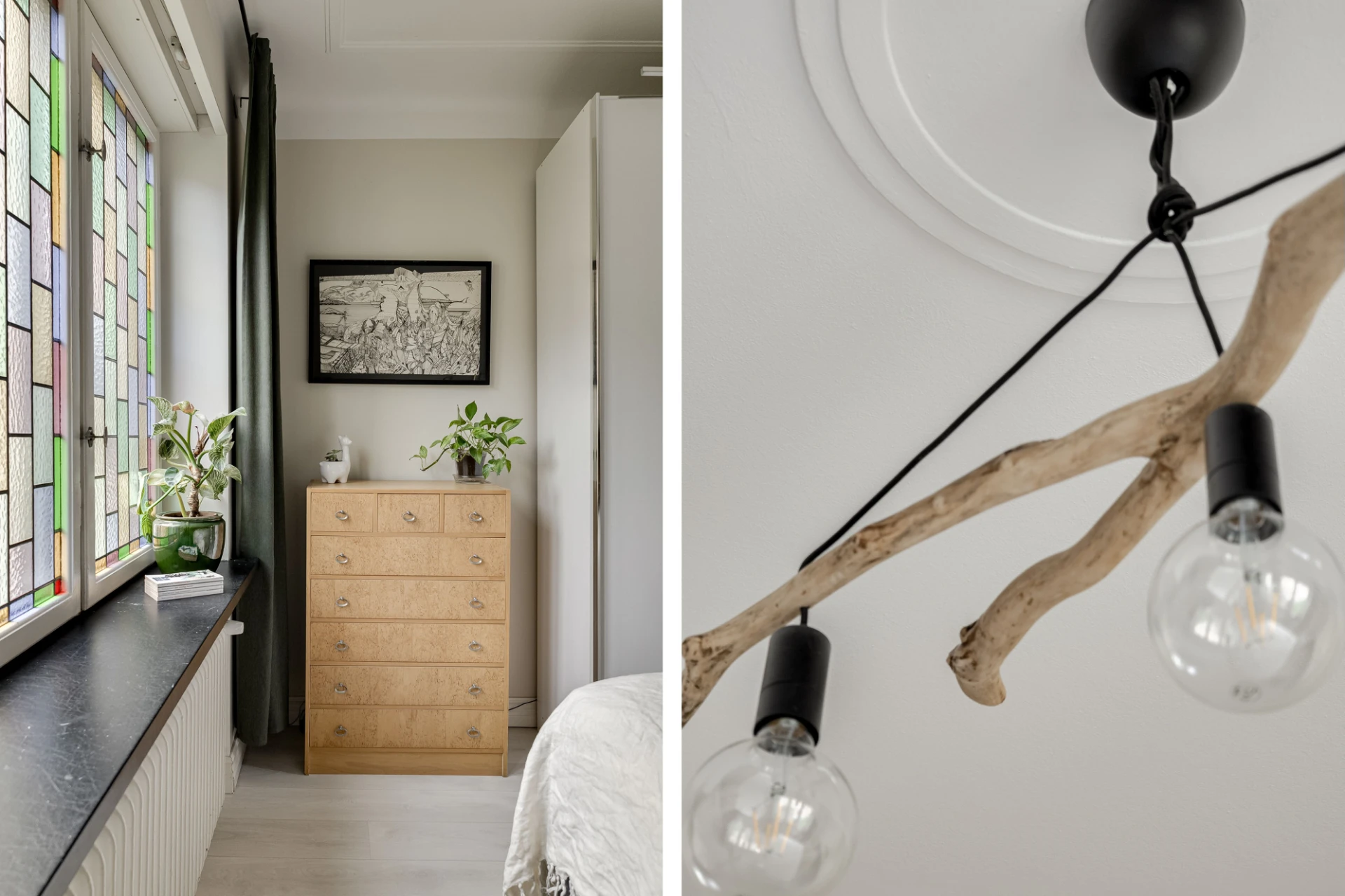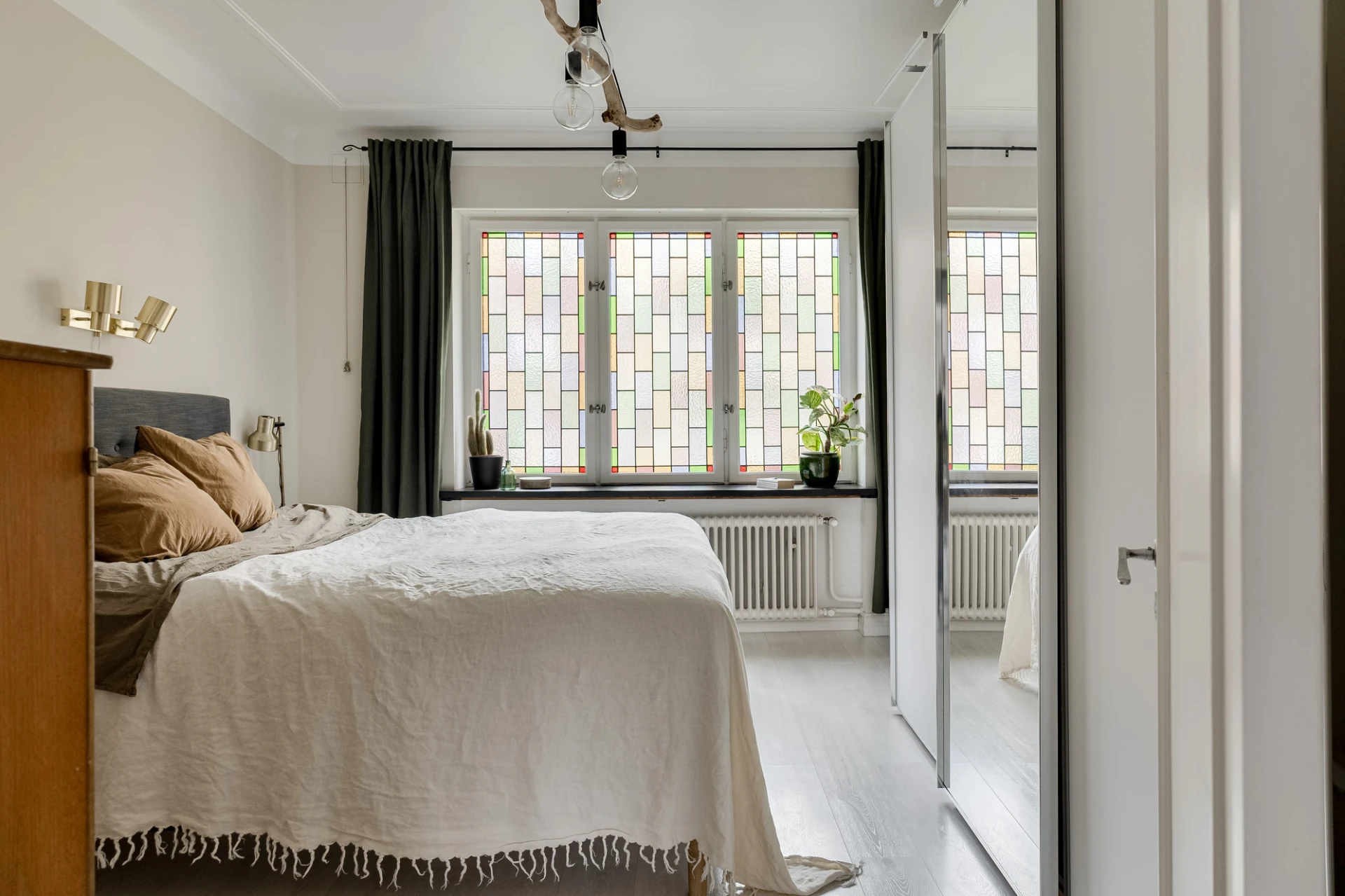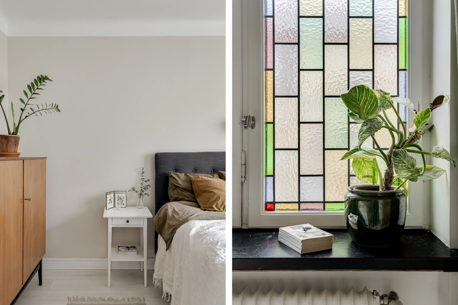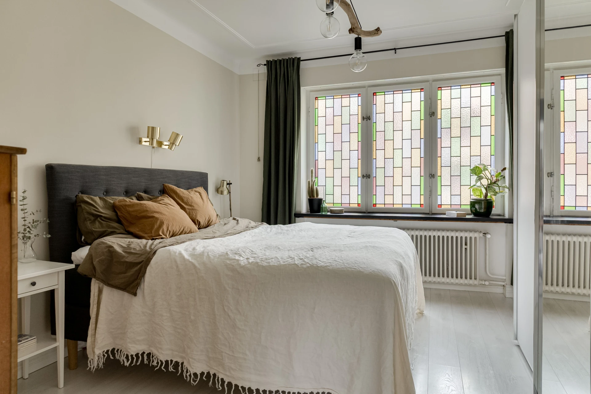 Sovrummet lyses upp genom det fantastiskt färgglada fönsterpartiet, här finns plats för stor säng och erbjuder förvaring.