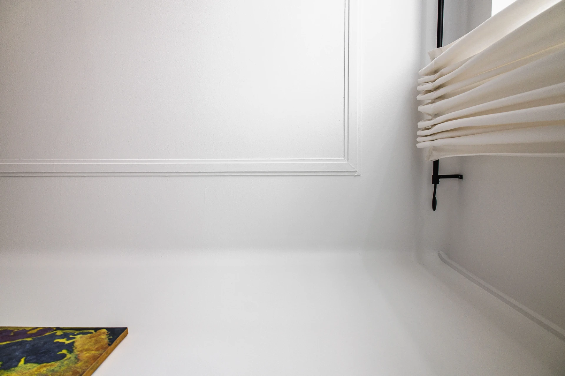 Laminat golv i vit ask och vita väggar, takstukatur och lamprosett
