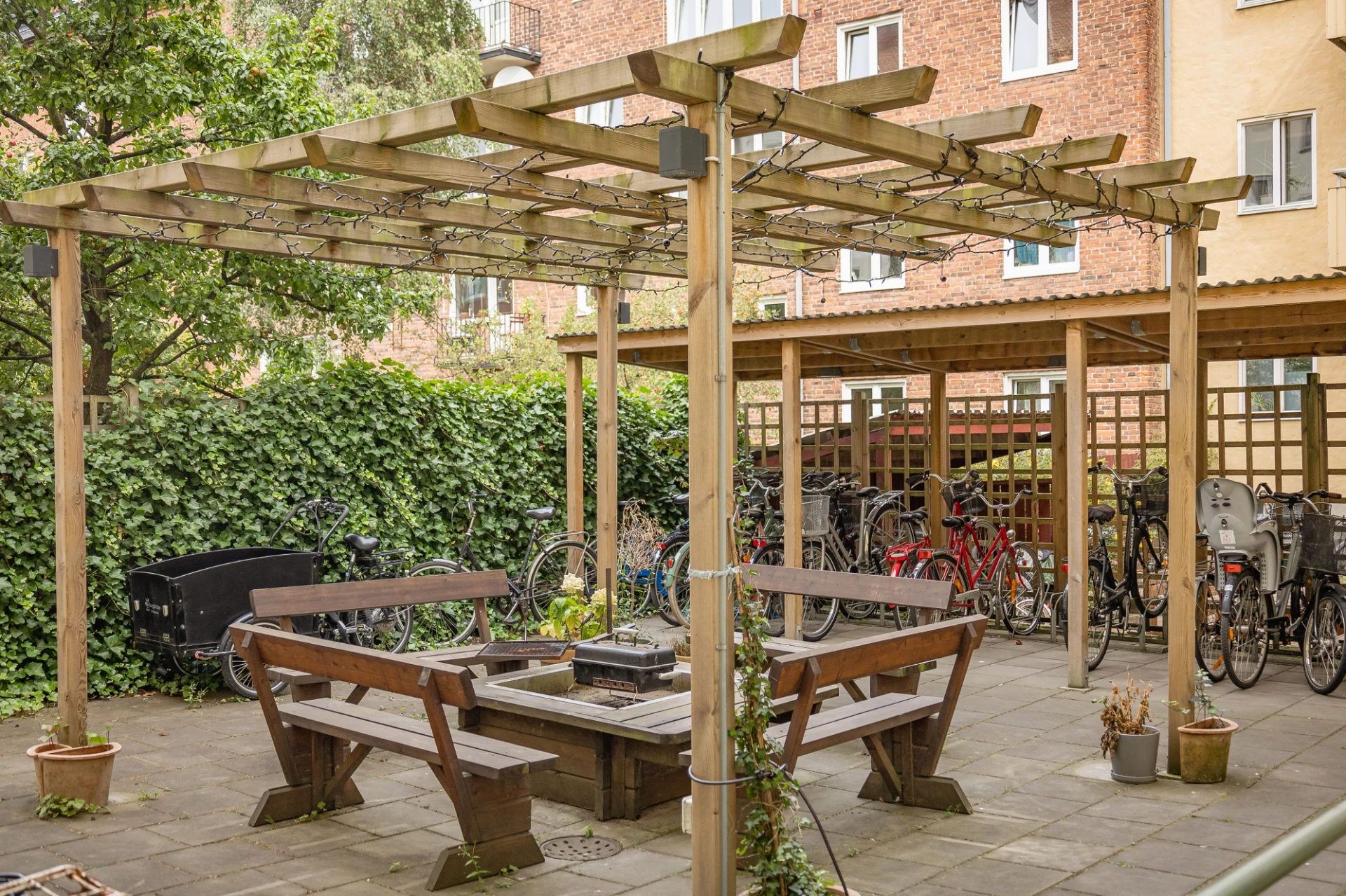 Föreningen har en fin stenbelagd innergård med pergola, gemensamma utemöbler och grill. Här finns även parkering för cyklar.