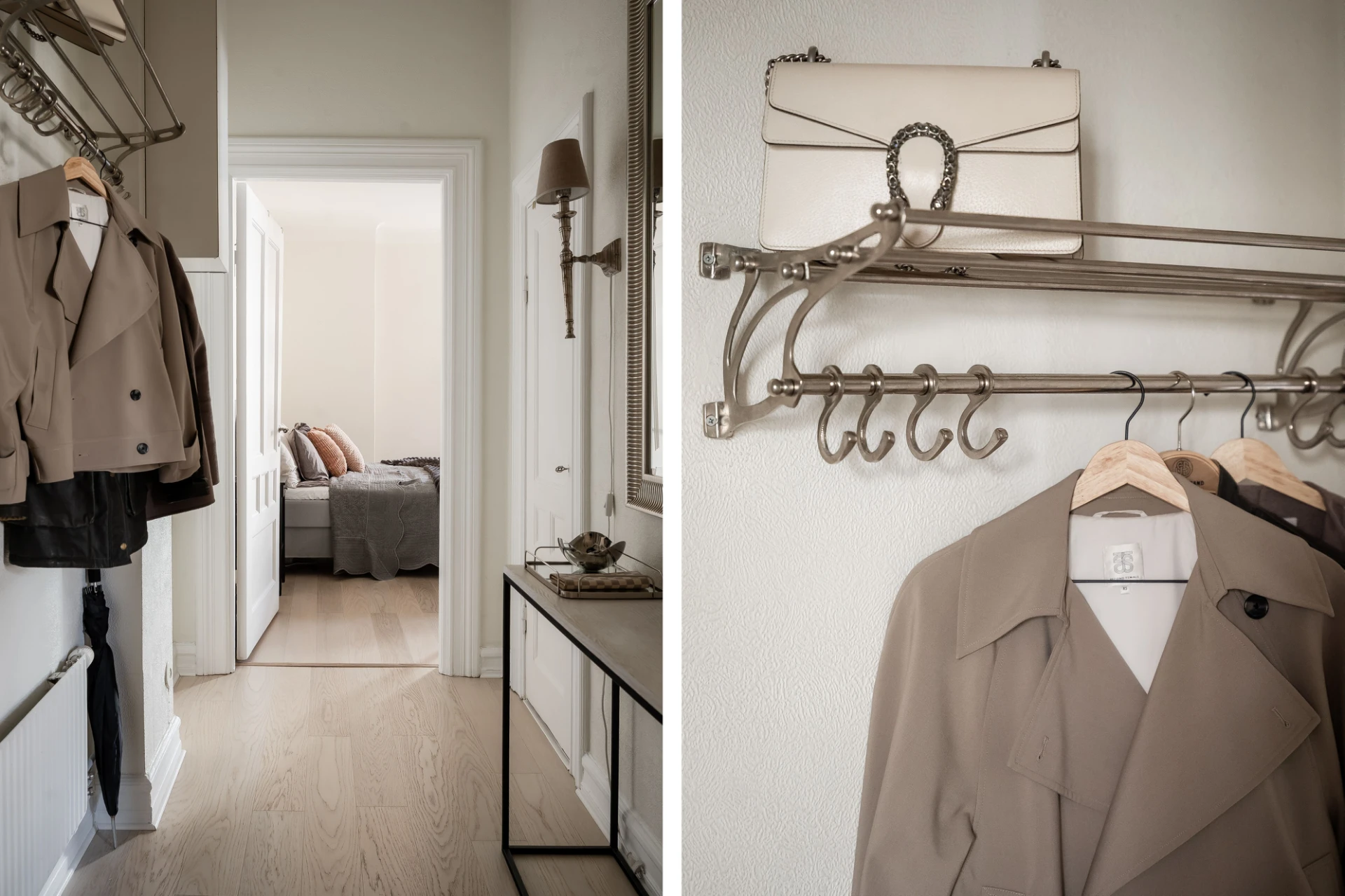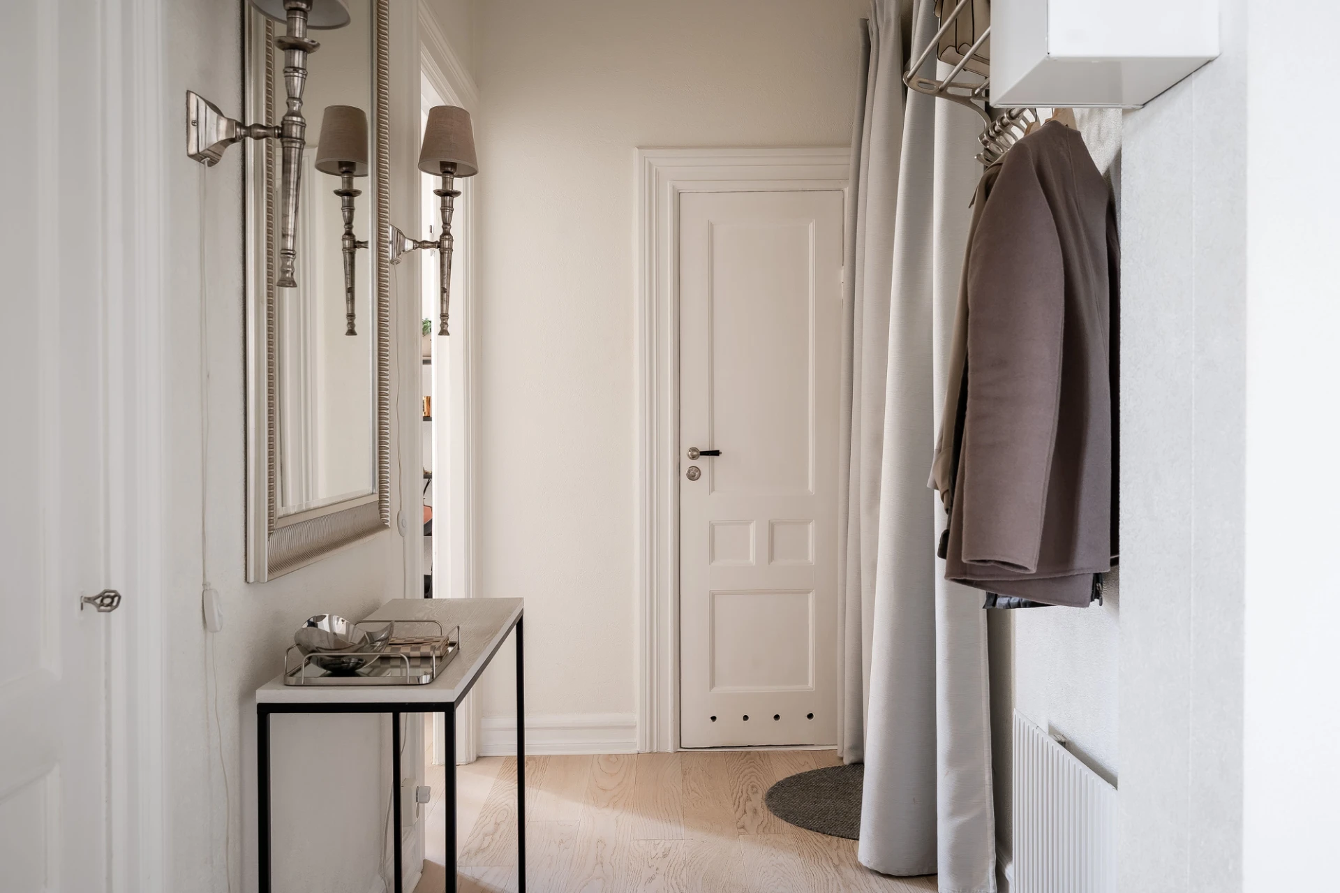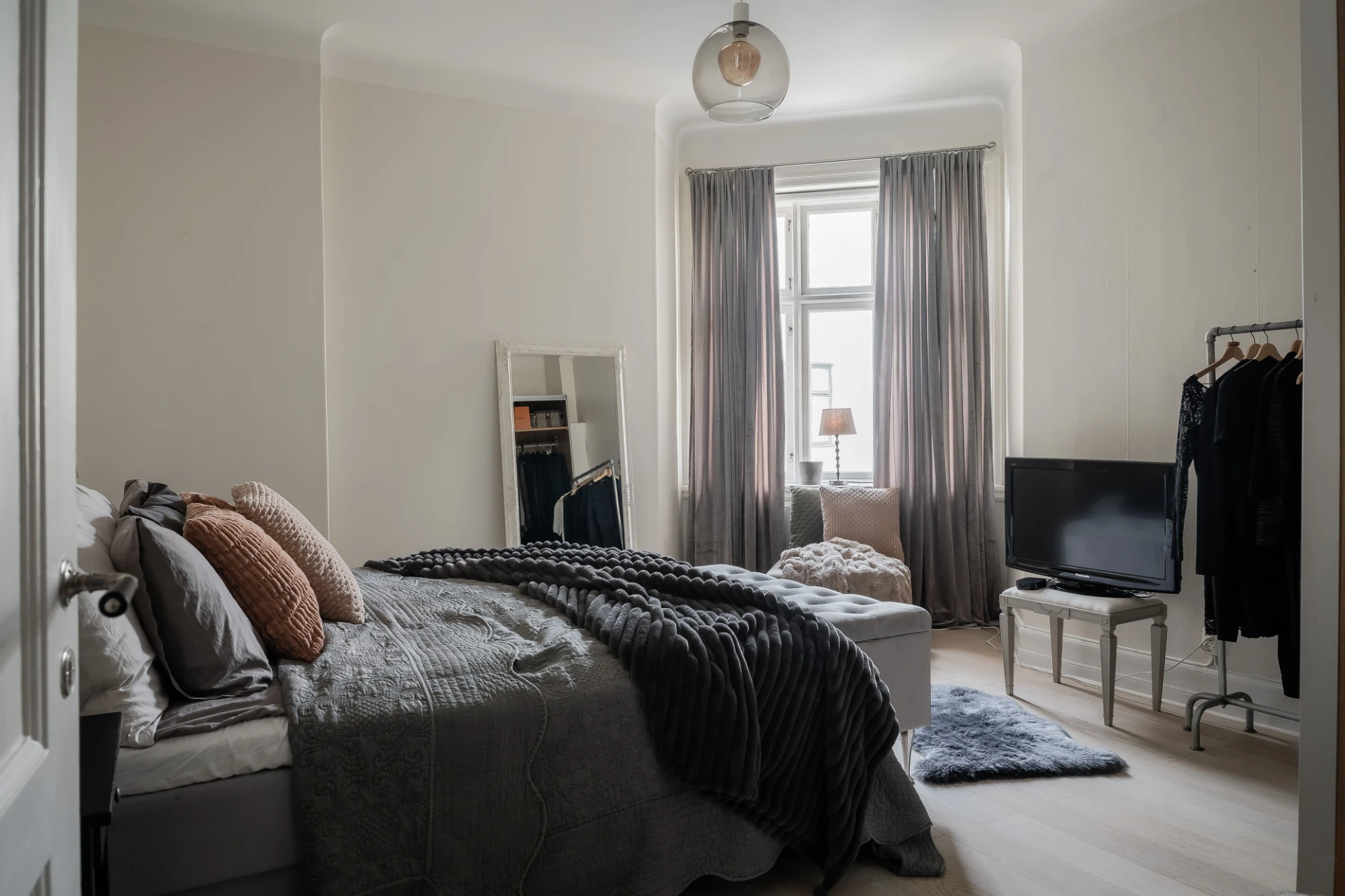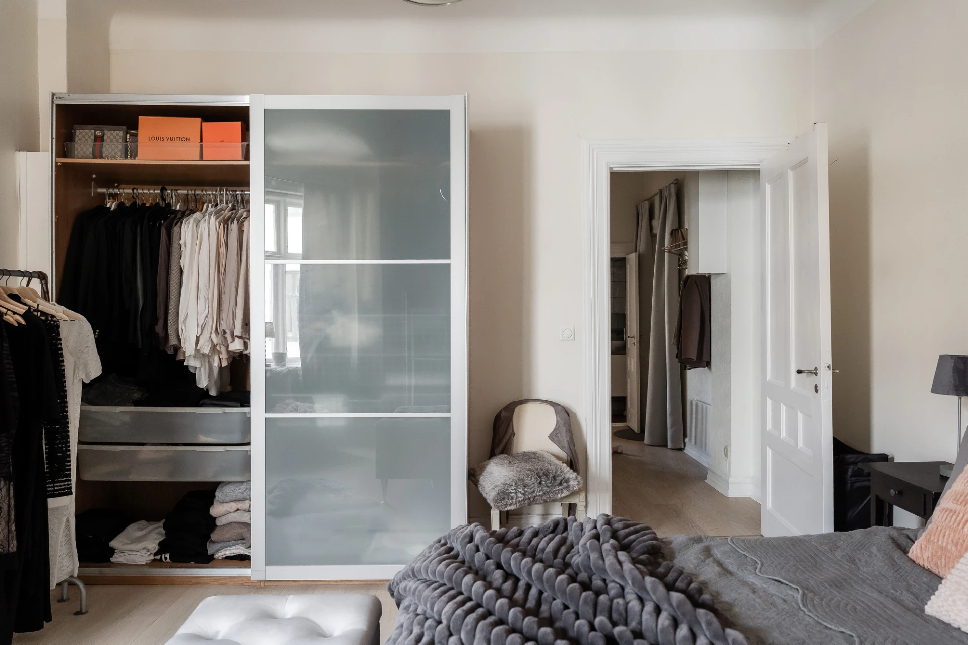 Ljus ekparkett och vita väggar. Goda avhängningsmöjligheter och förvaring i rymlig klädkammare.