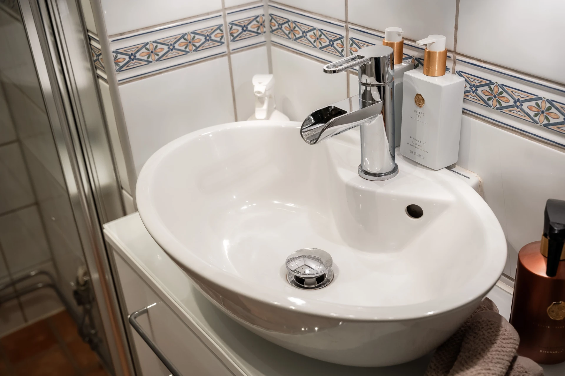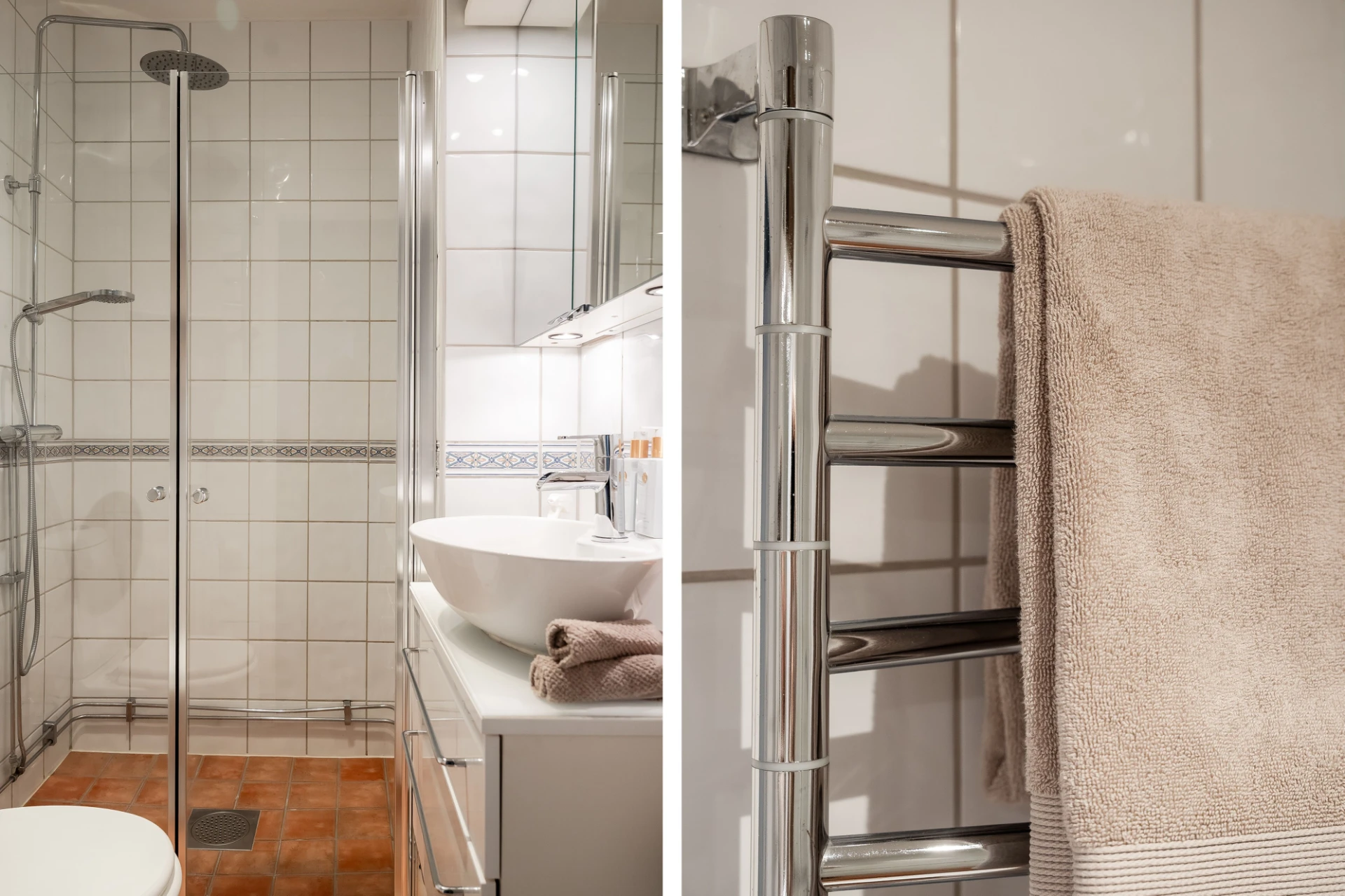 Brun klinker och vitt kakel med smal mönstrad bård. Badrummet är utrustat med wc, ovanpåliggande handfat med vit kommod, spegelskåp med belysning och dusch.