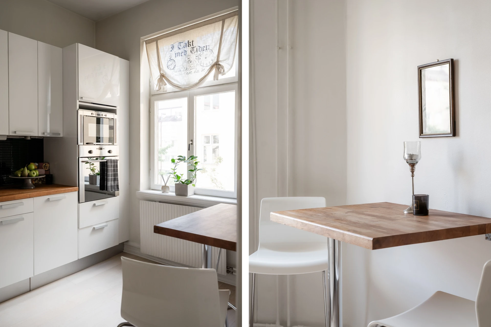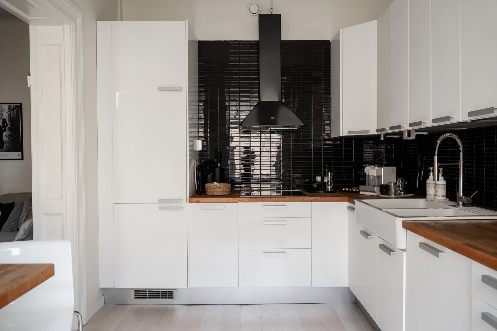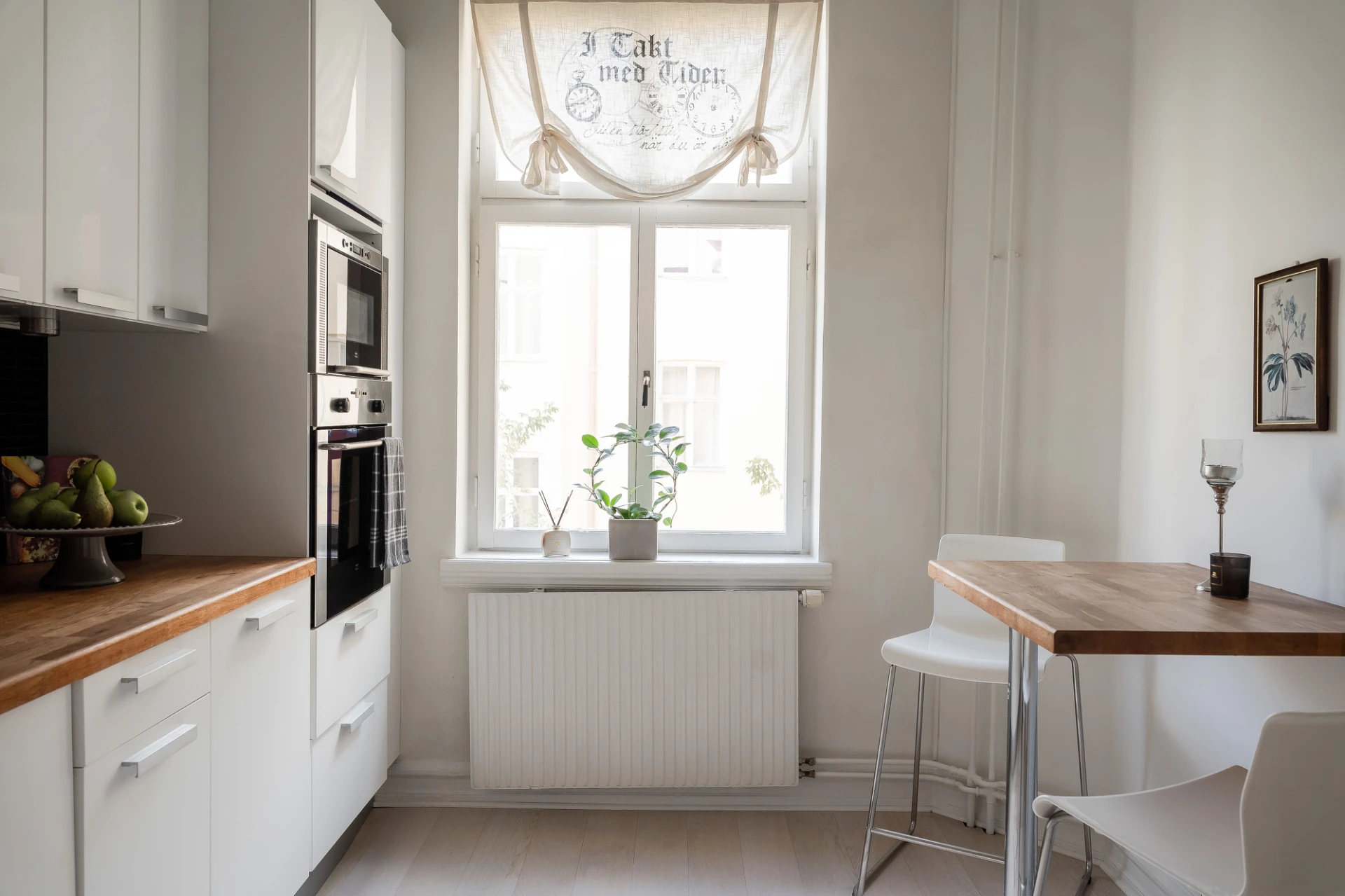 Ljus ekparkett och vita väggar. Vit köksinredning med svart kakel ovan bänkskiva i trä. Köket är utrustat med häll, fläkt, integrerad diskmaskin, inbyggd mikrovågsugn, inbyggd ugn och integrerad kyl/frys. Höga golvlister och vackra breda dörrposter.