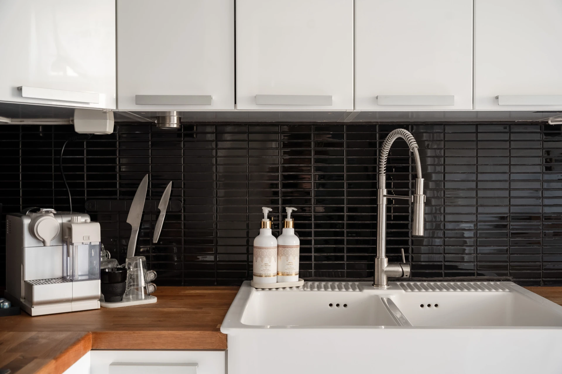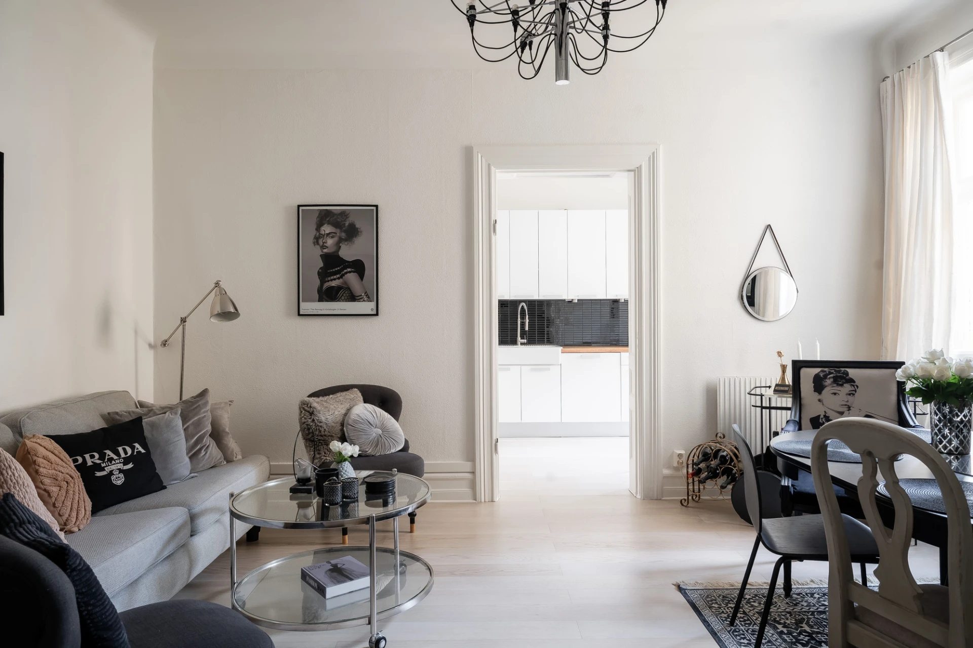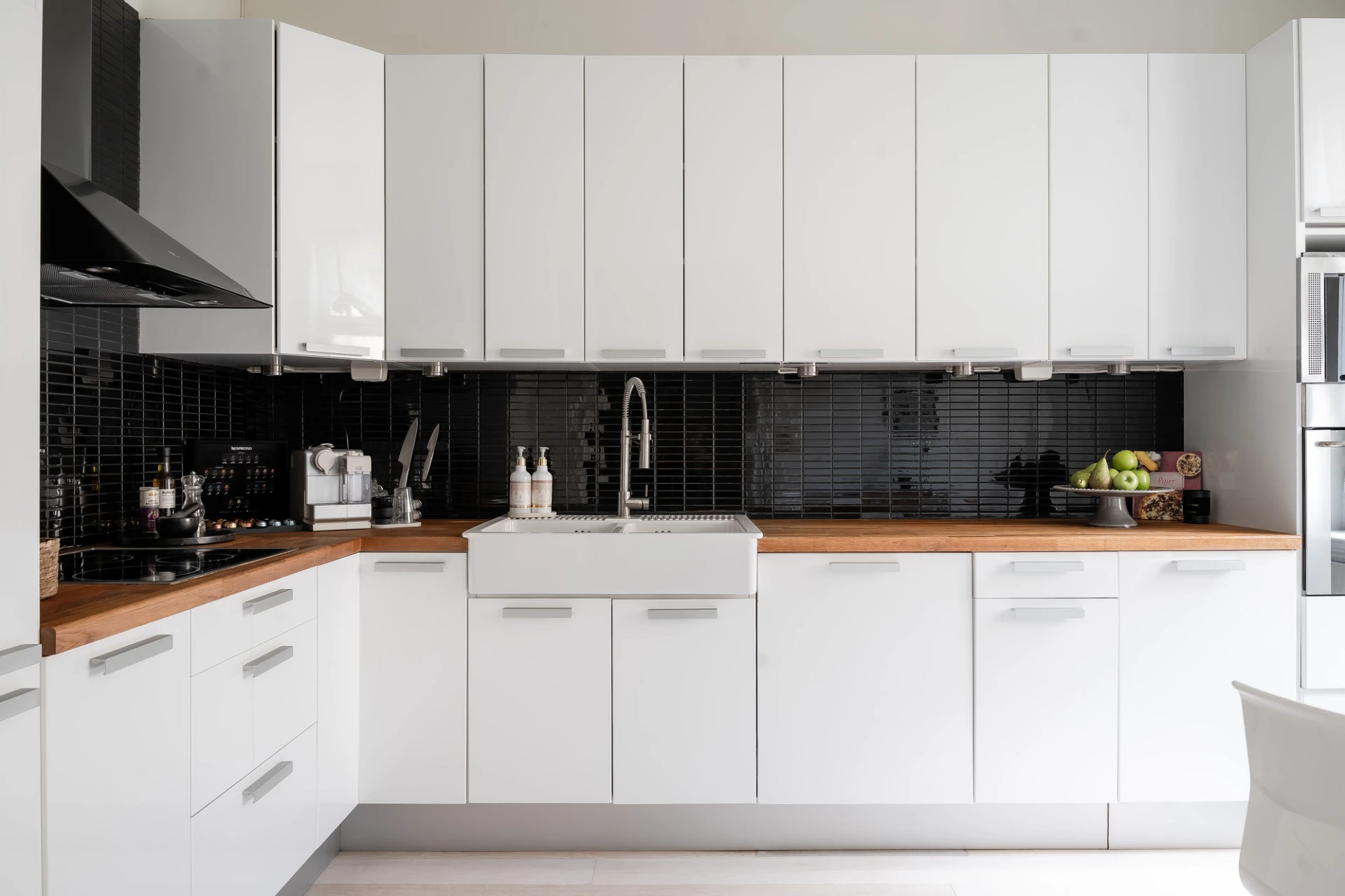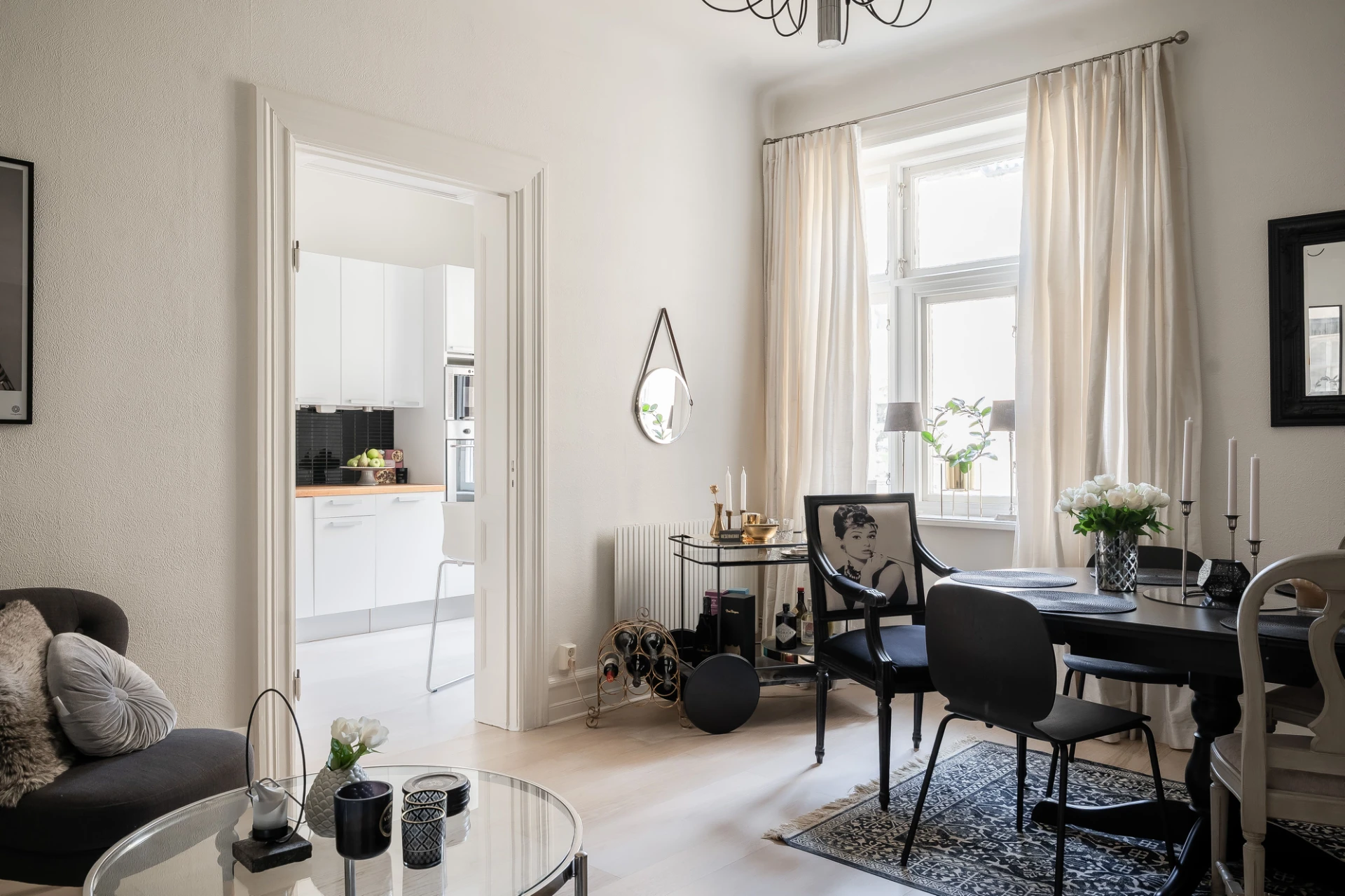 Ljus ekparkett och vita väggar. Vit köksinredning med svart kakel ovan bänkskiva i trä. Köket är utrustat med häll, fläkt, integrerad diskmaskin, inbyggd mikrovågsugn, inbyggd ugn och integrerad kyl/frys. Höga golvlister och vackra breda dörrposter.