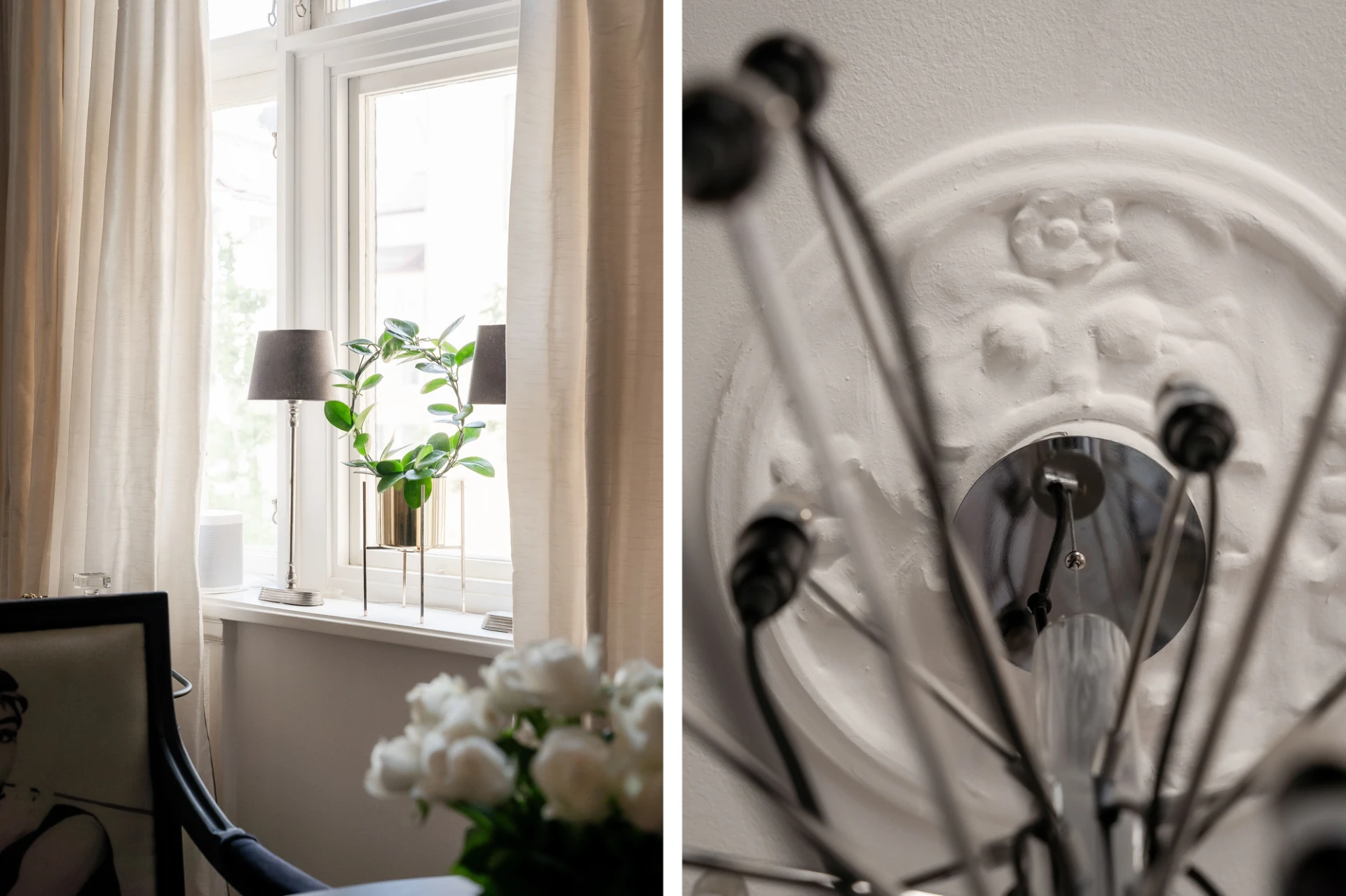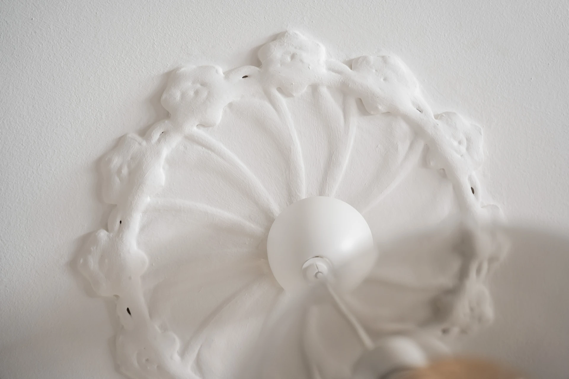 Ljus ekparkett och vita väggar. Här finner vi höga golvlister och charmig takrosett samt breda och dekorativa dörrposter.