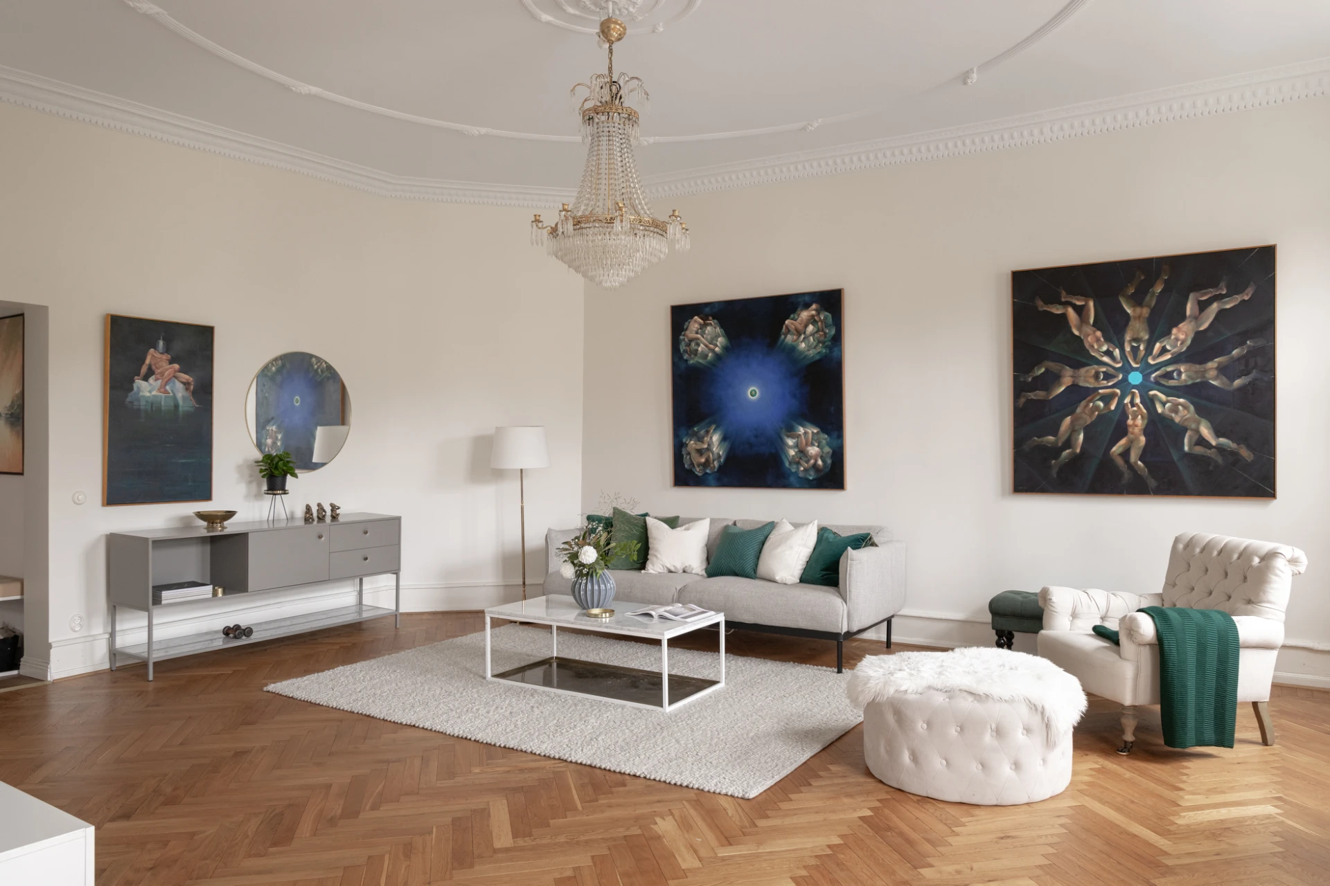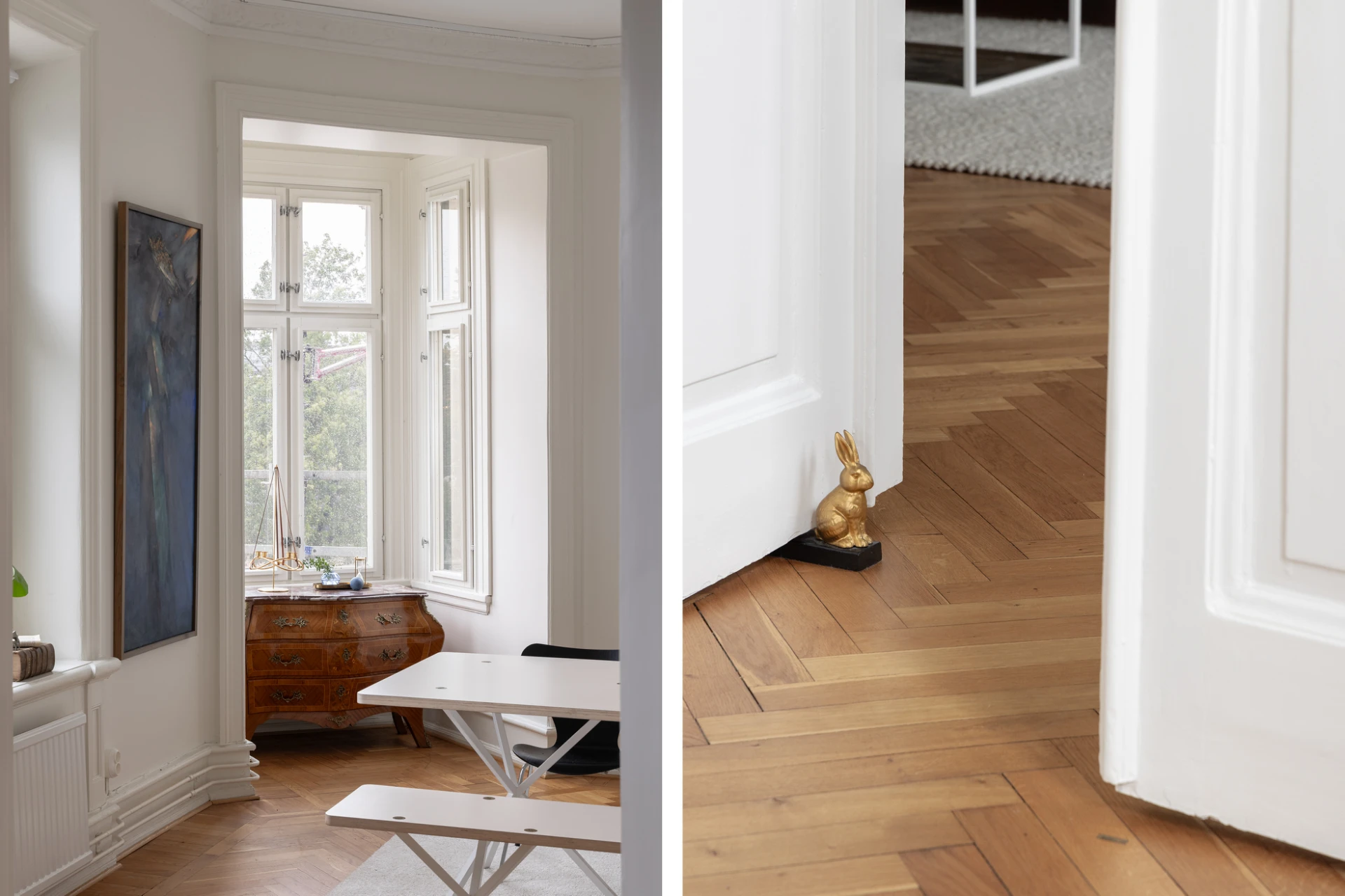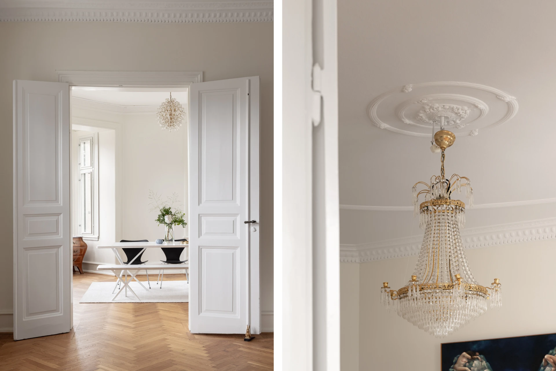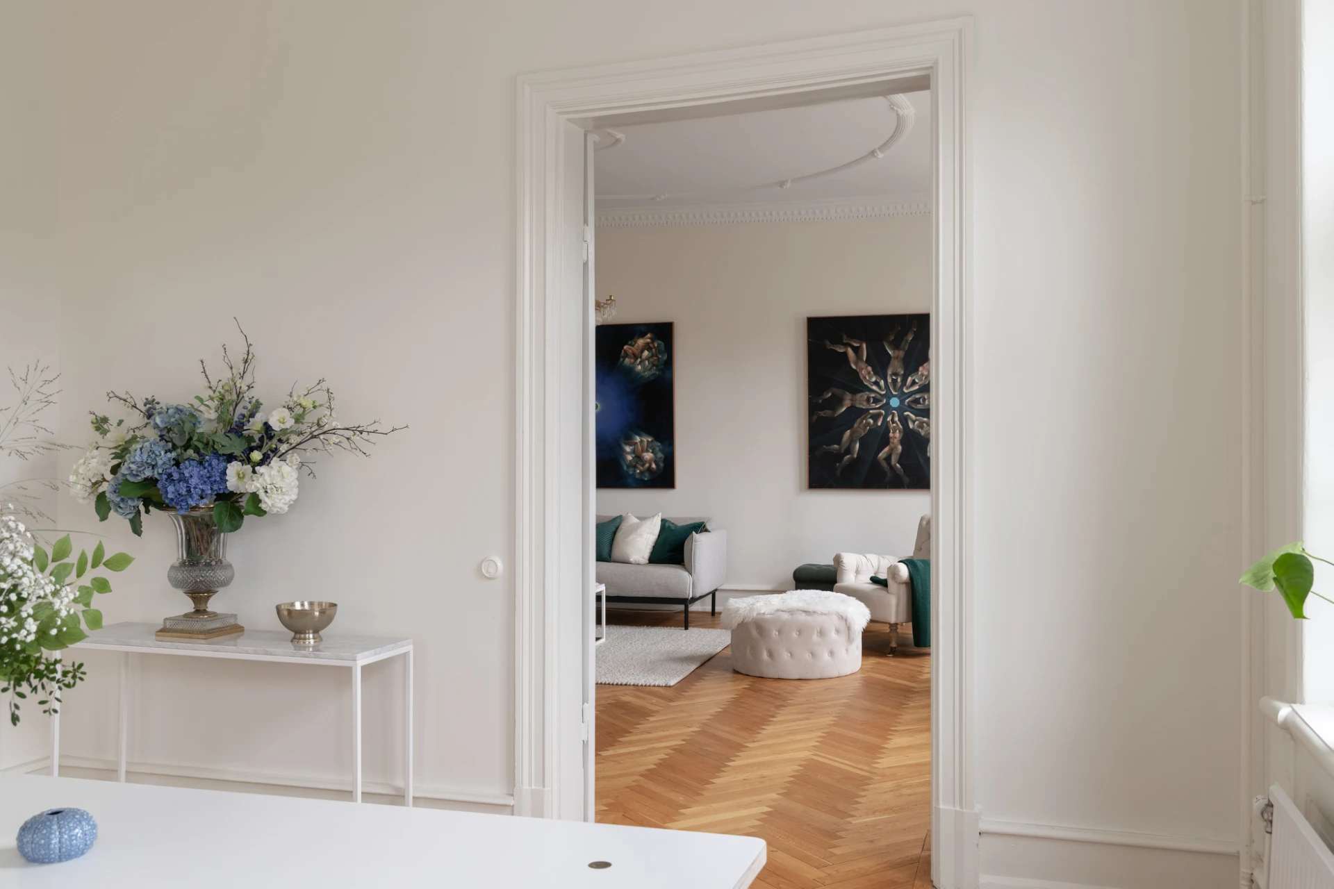 Fiskbensparkett och vita väggar. Takstuckatur.