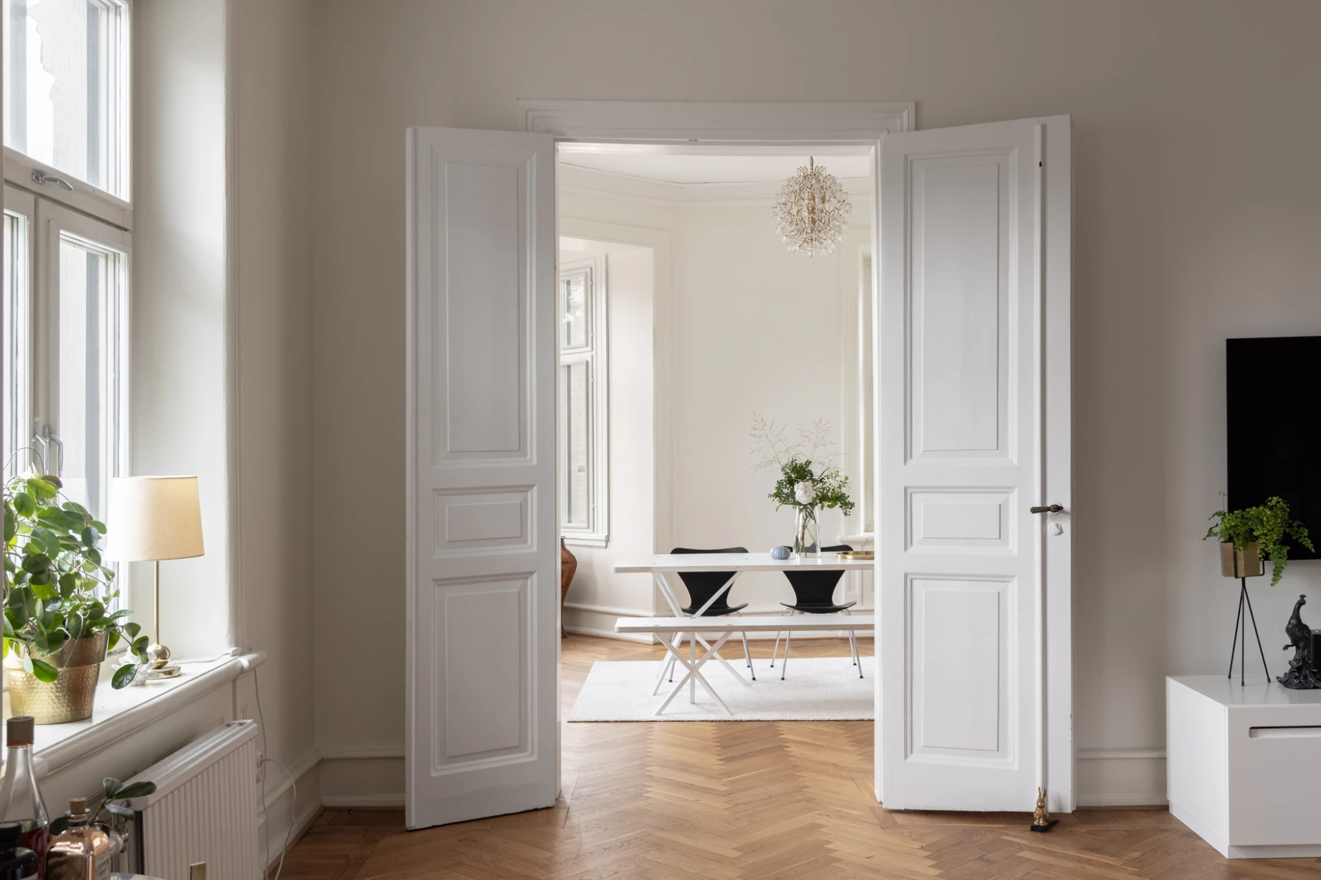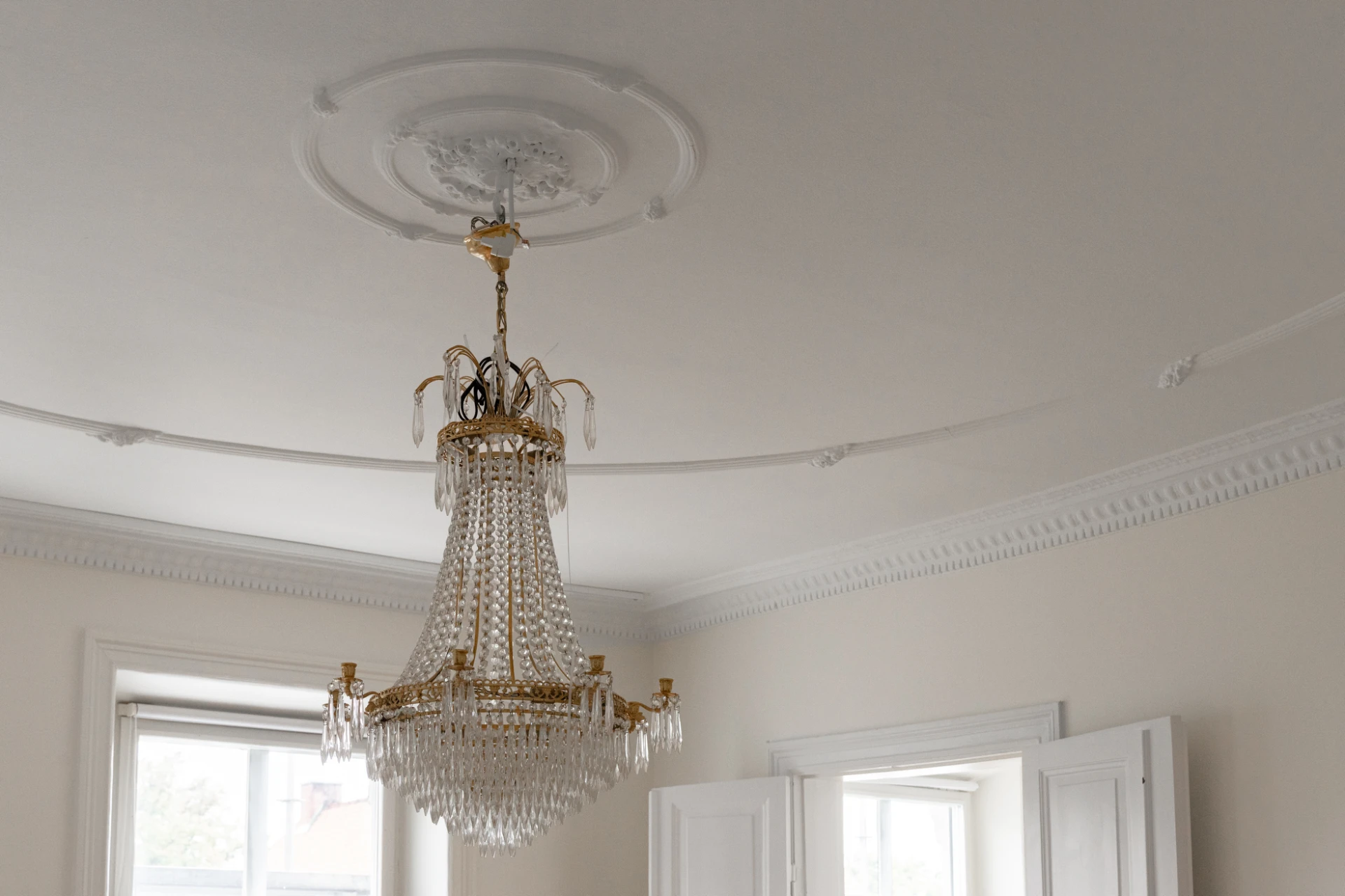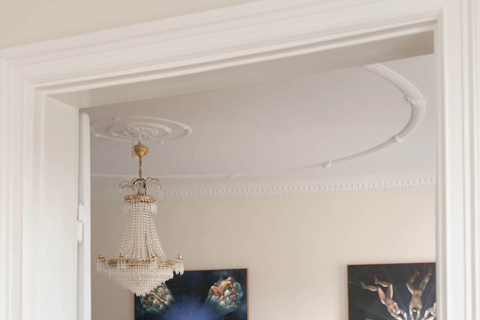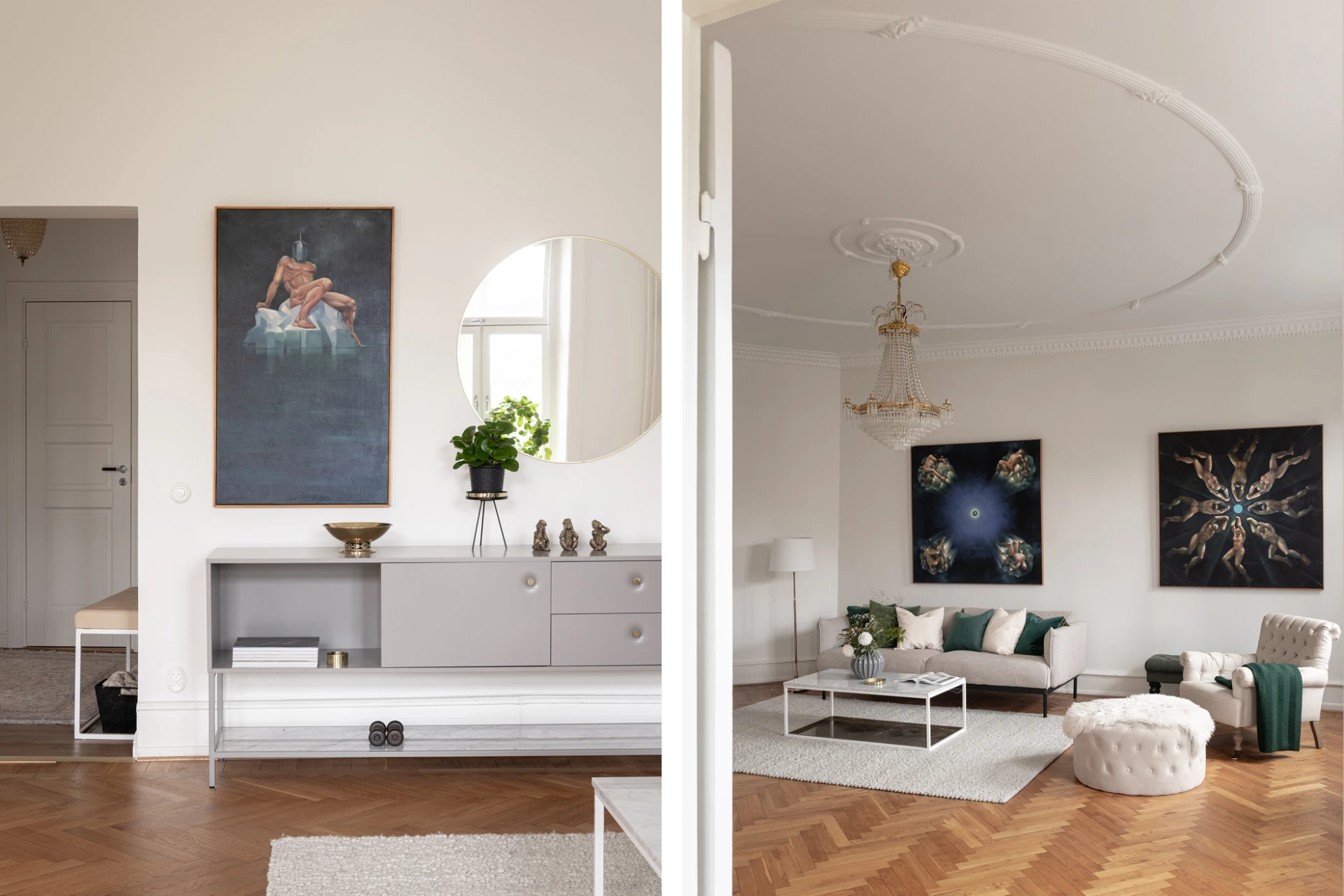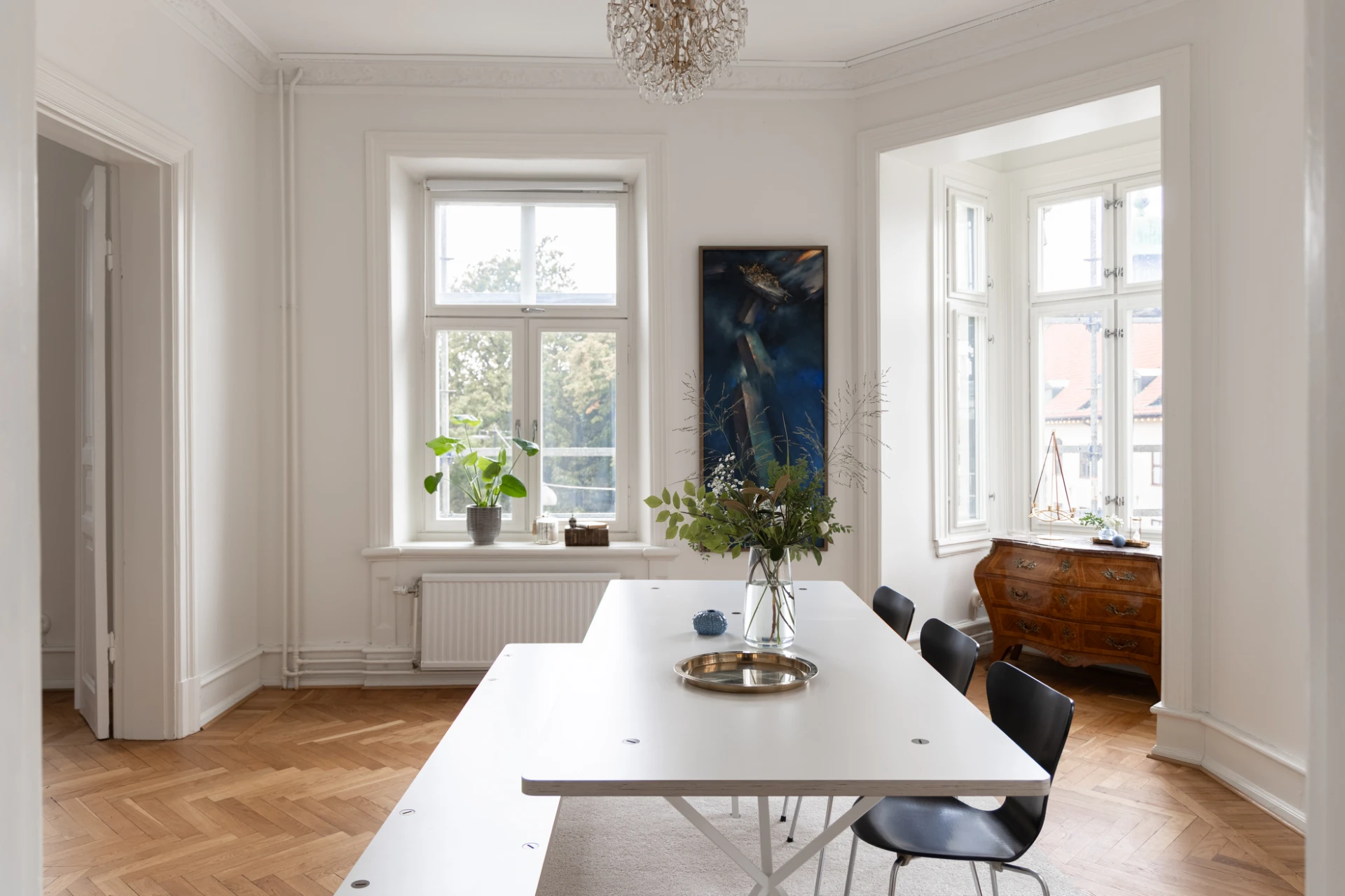 Fiskbensparkett och vita väggar. Takstuckatur.