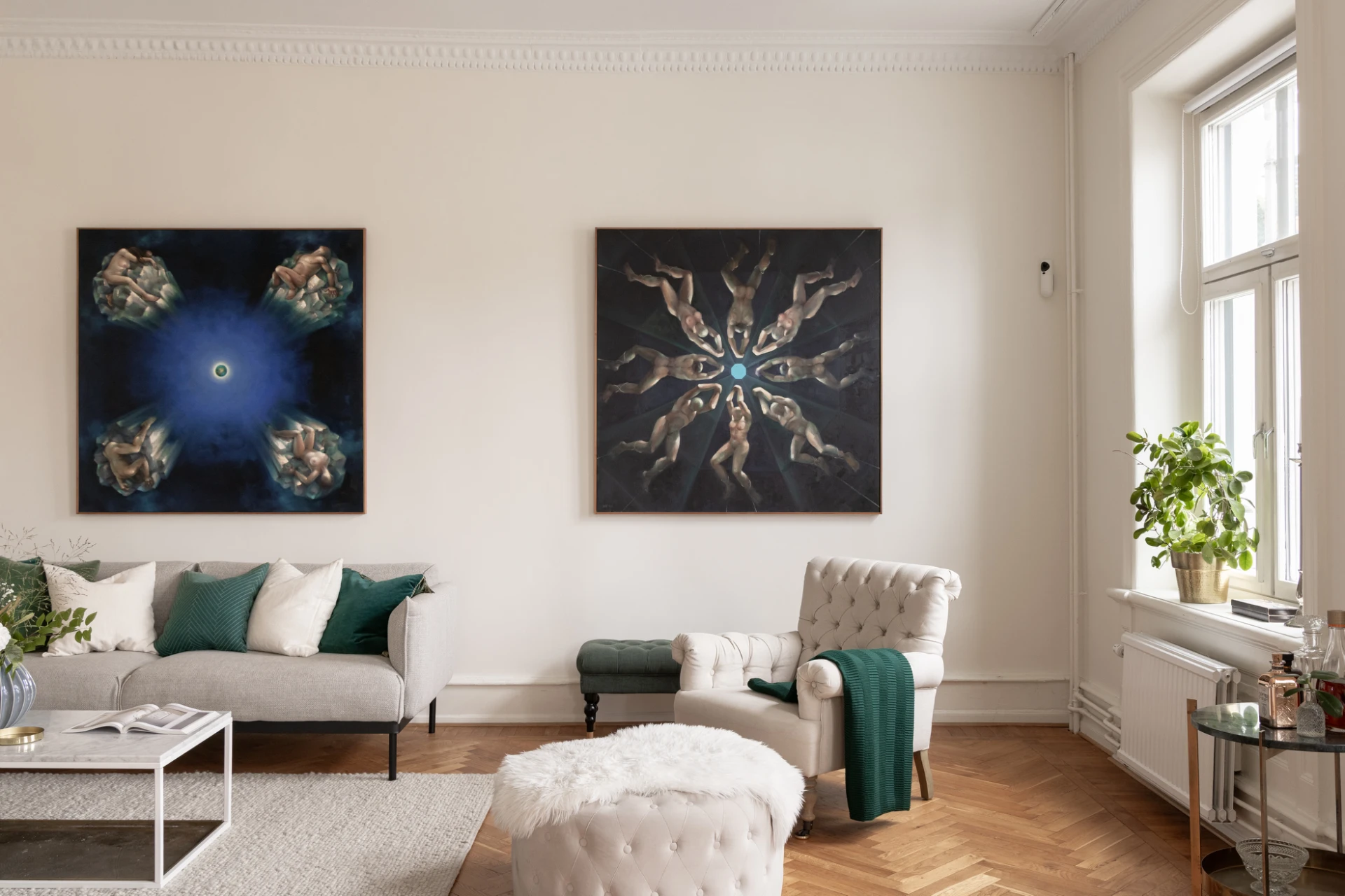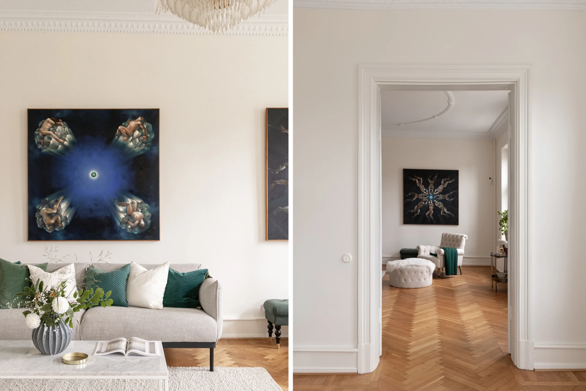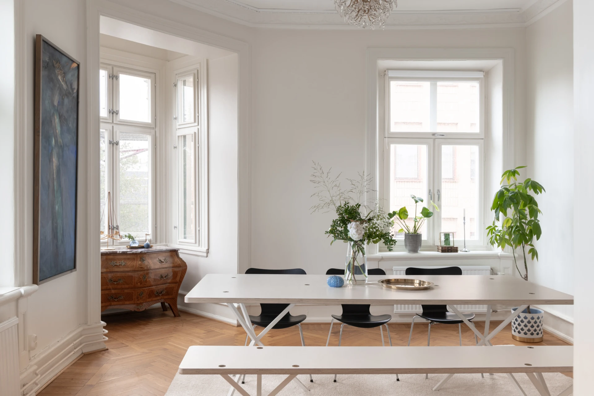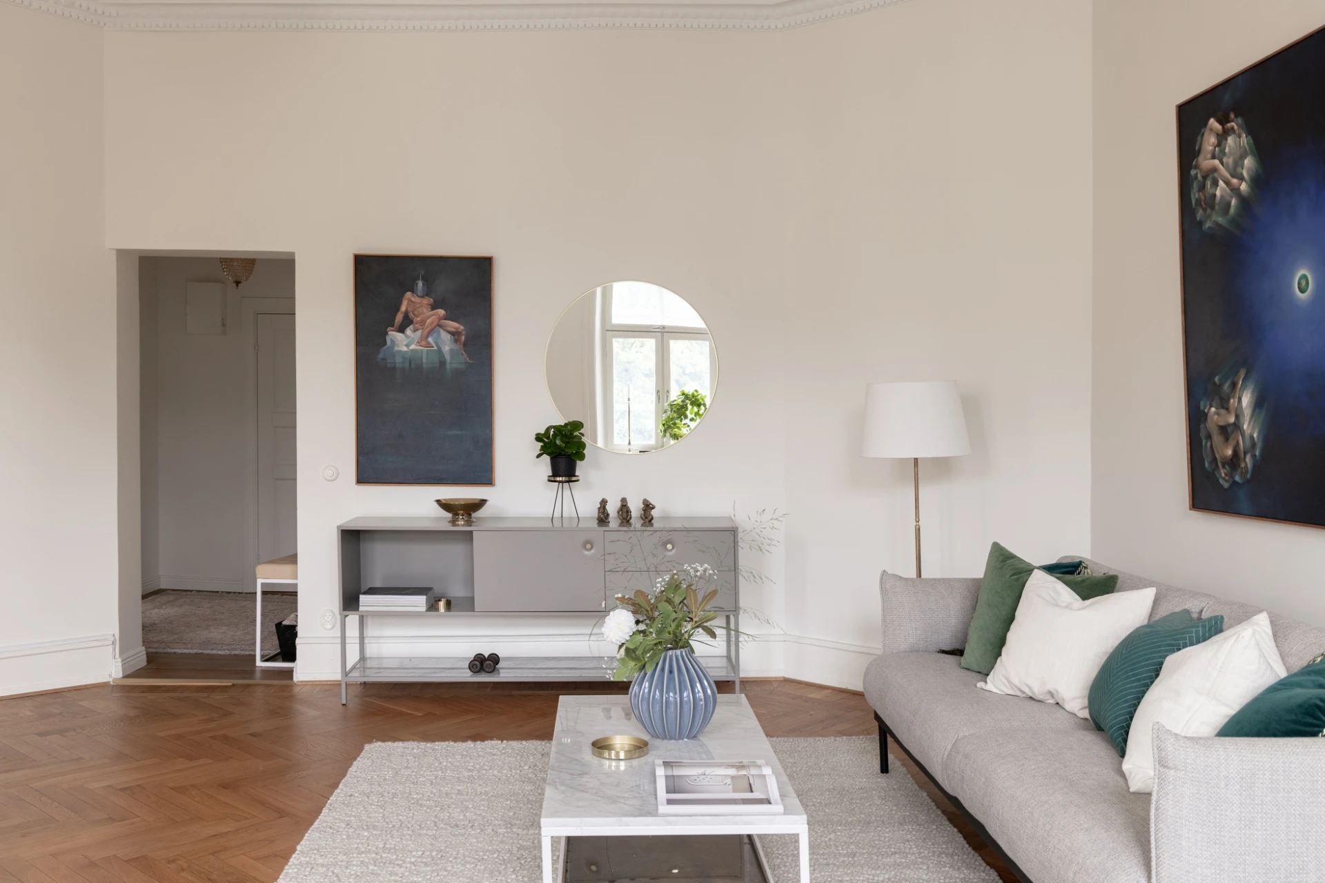 Fiskbensparkett och vita väggar. Takstuckatur.