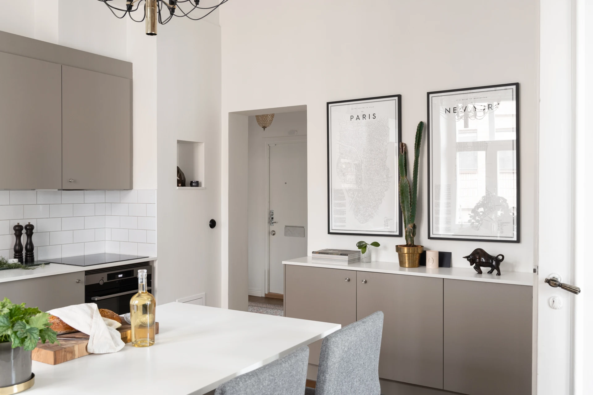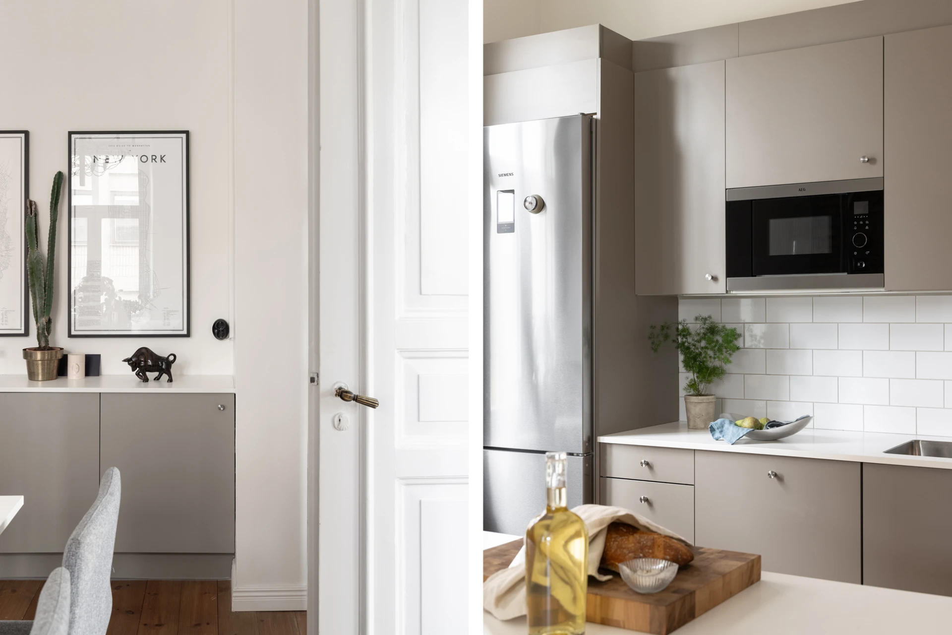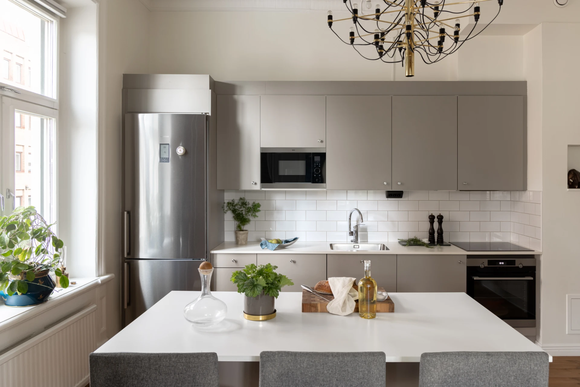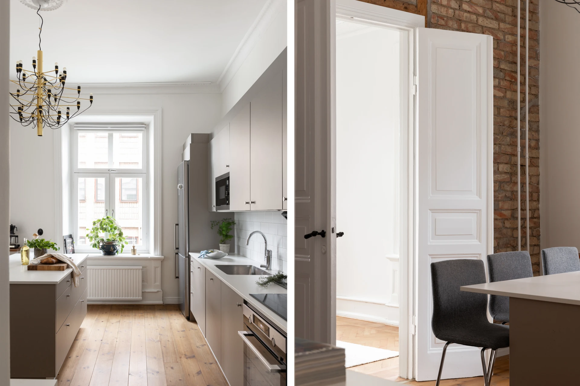 Parkettgolv och vita väggar samt en framtagen tegelvägg. Grå köksinredning, vitt kakel och vit bänkskiva. Utrustat med kyl/frys, spishäll, ugn, fläkt, inbyggd mikrovågsugn samt integrera diskmaskin. Köksö med sittplats och förvaring. Takstuckatur. Pardörrar mot matsal.