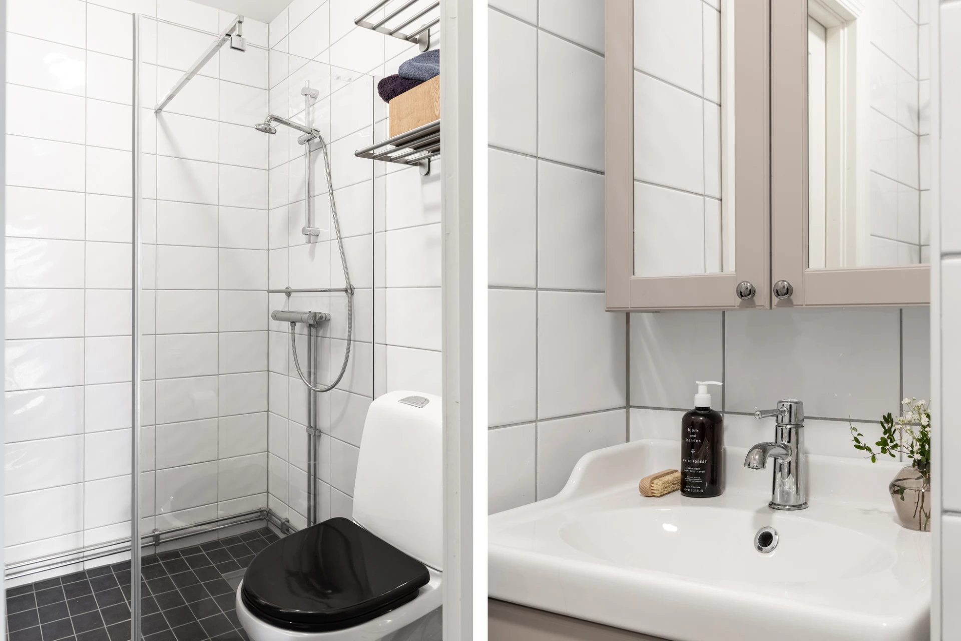 Grå klinker och vitt kakel. Utrustat med dusch med duschvägg i klarglas, wc, handfat med kommod och spegelskåp.