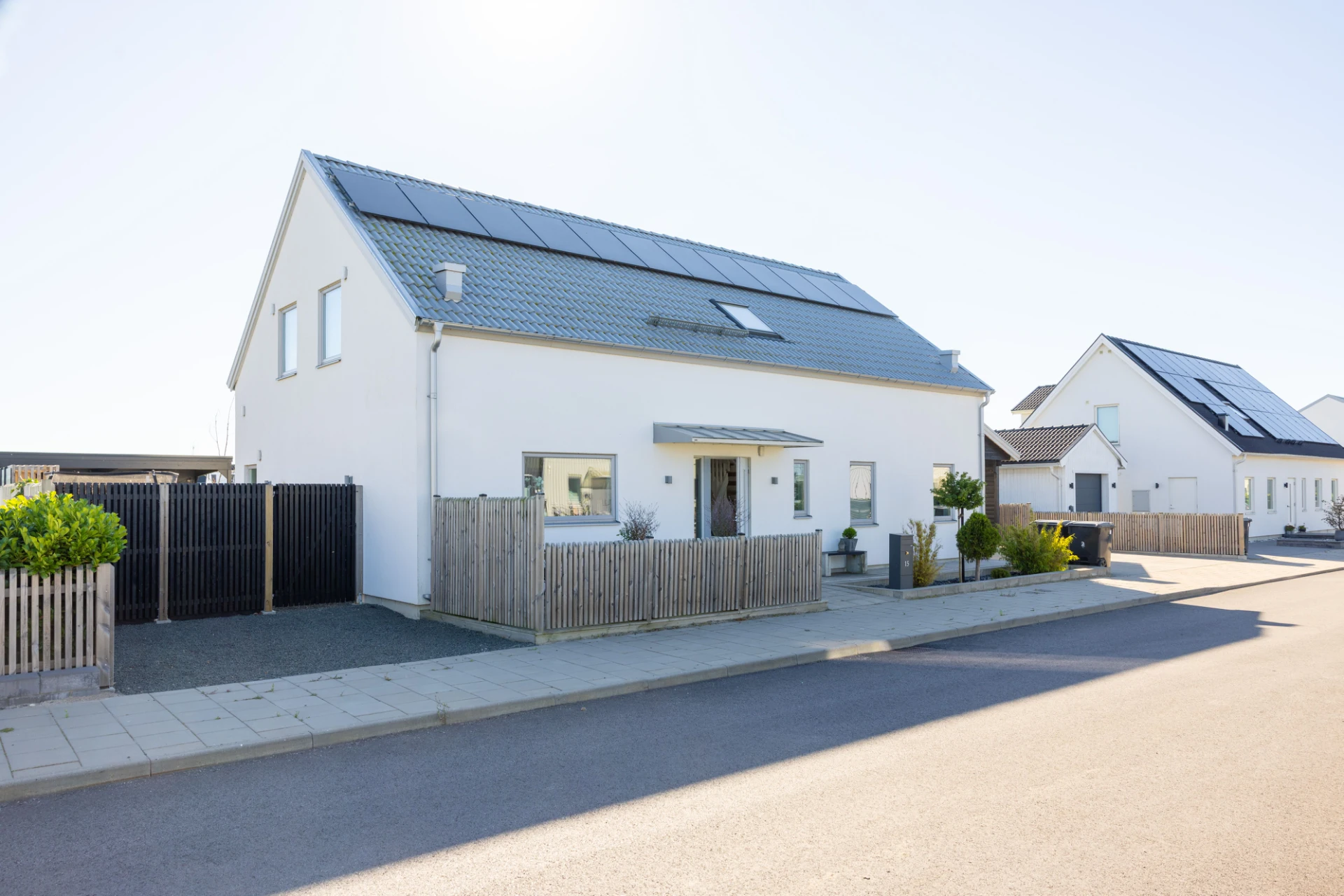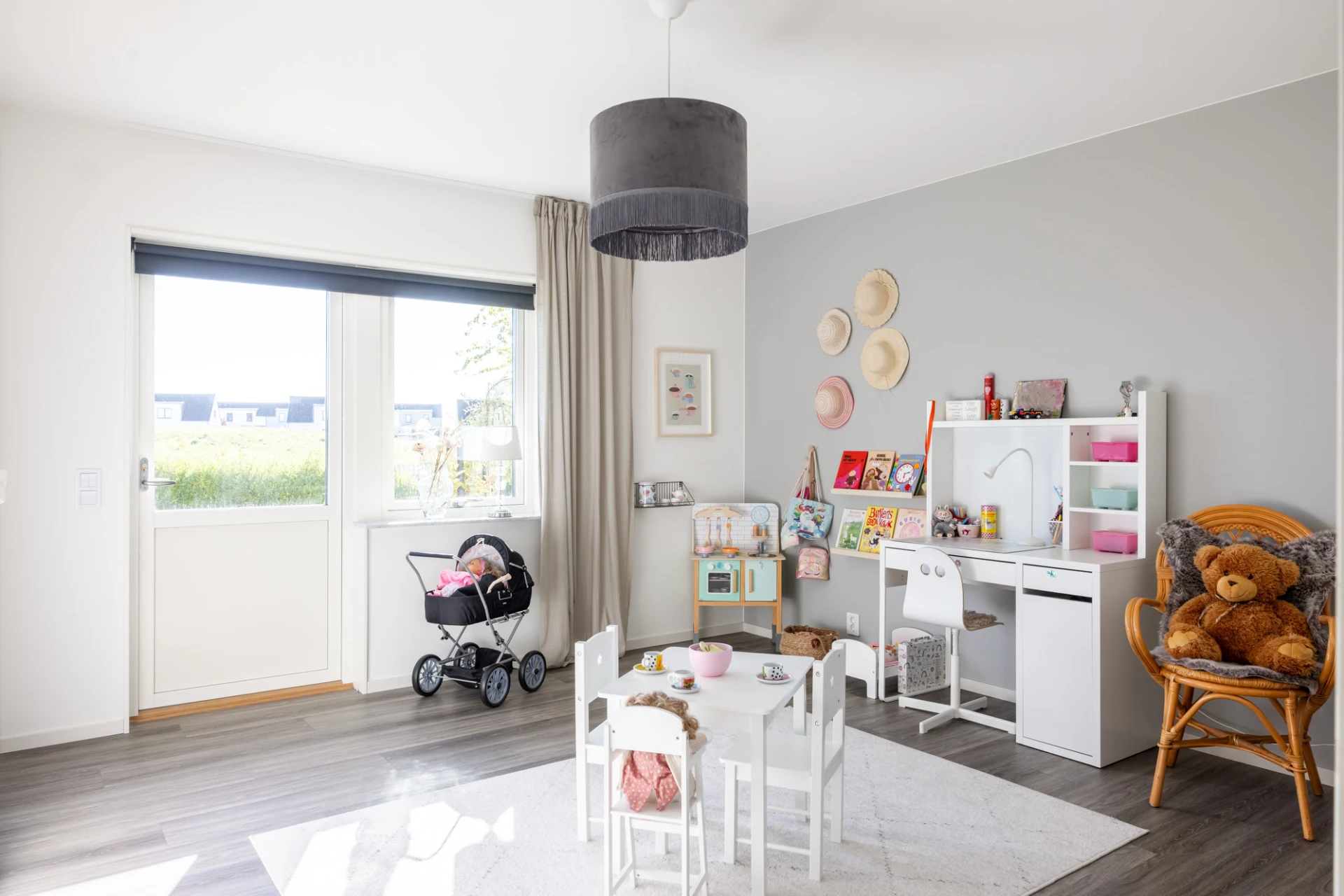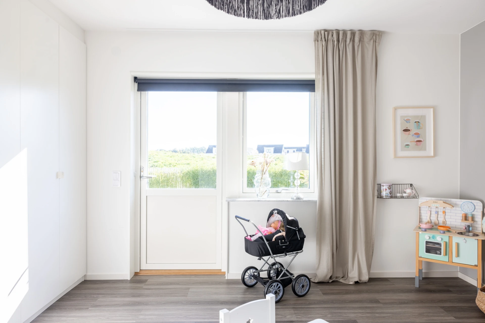 Vinylgolv, vita väggar samt en grå fondvägg. Tre garderober samt golvvärme. Utgång till trädgård.
