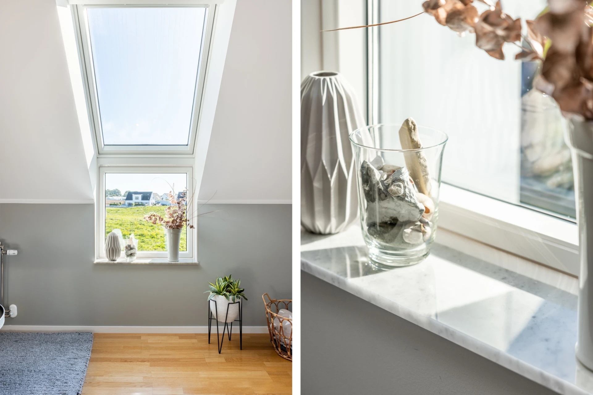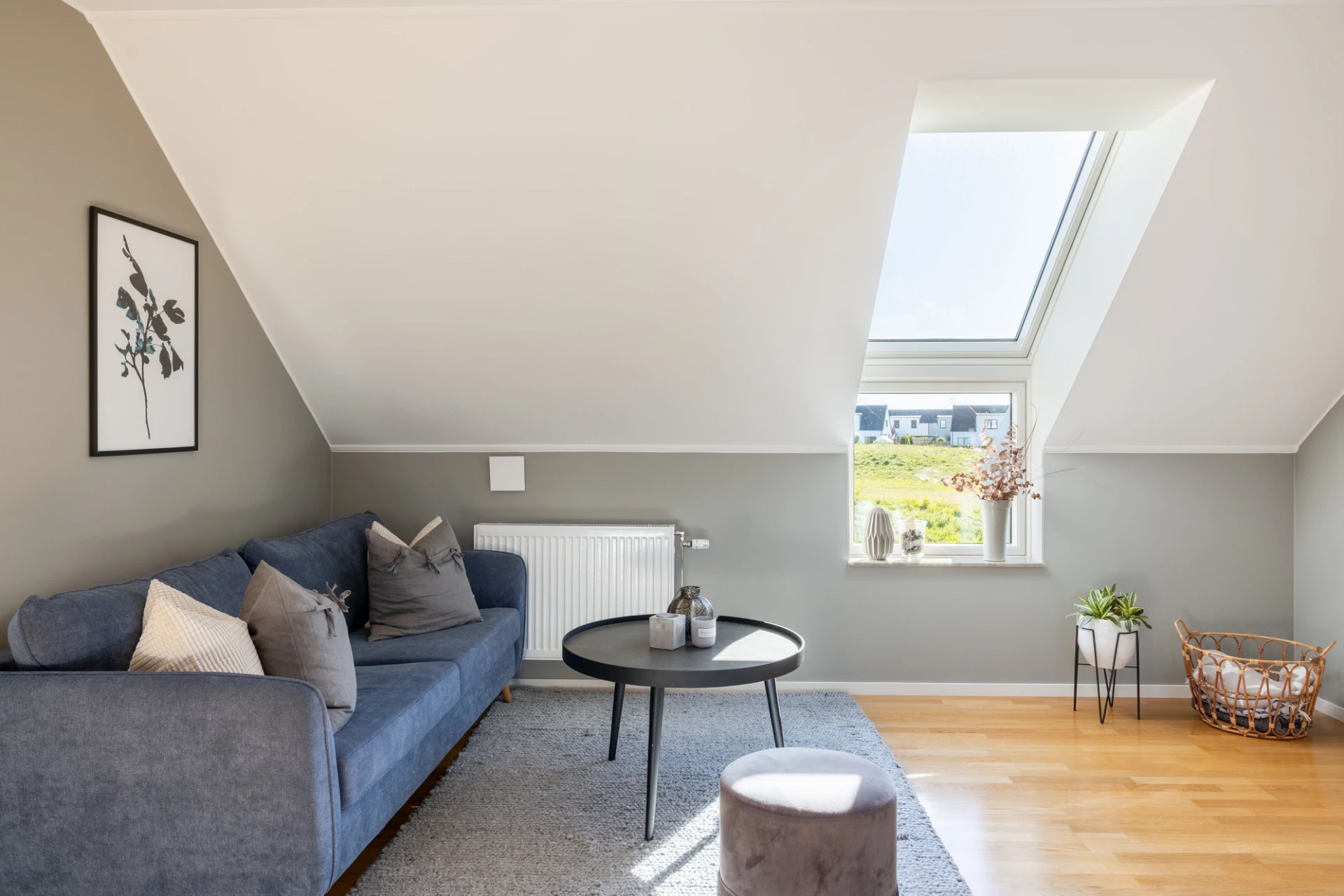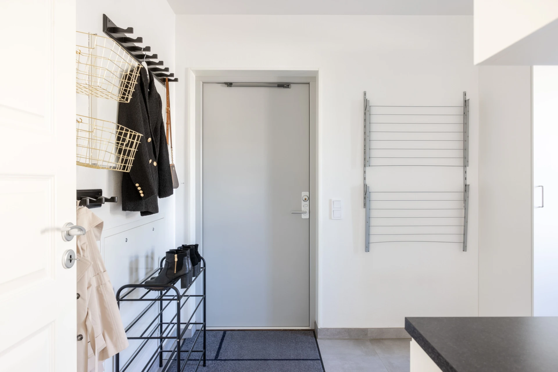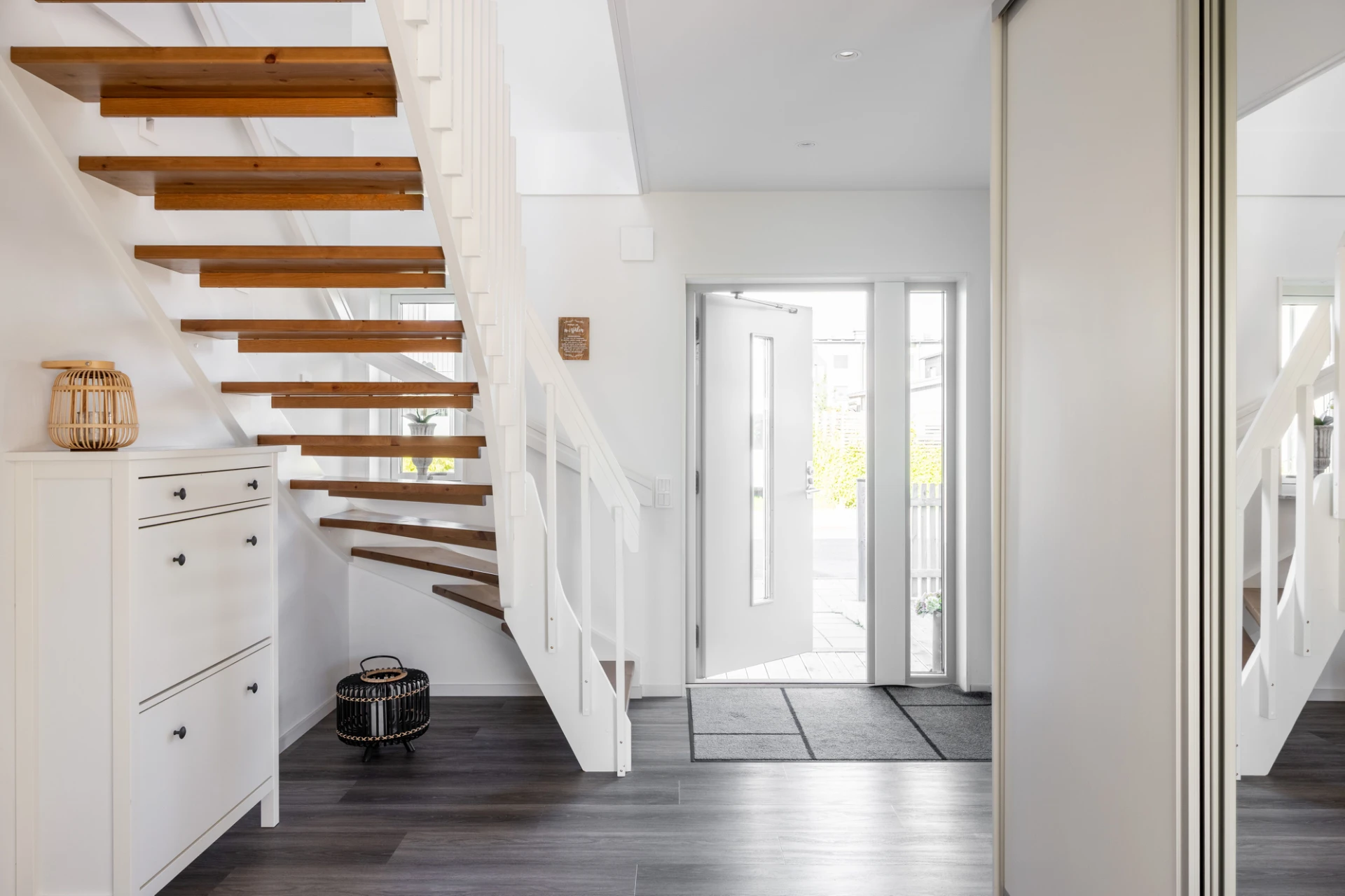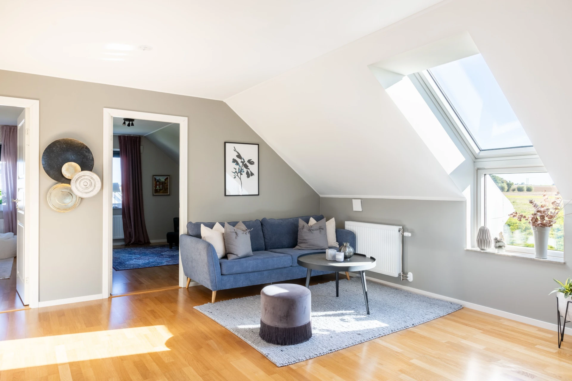 Parkettgolv, gråa väggar samt en vit vägg. Goda förvaringsmöjligheter i klädkammare.