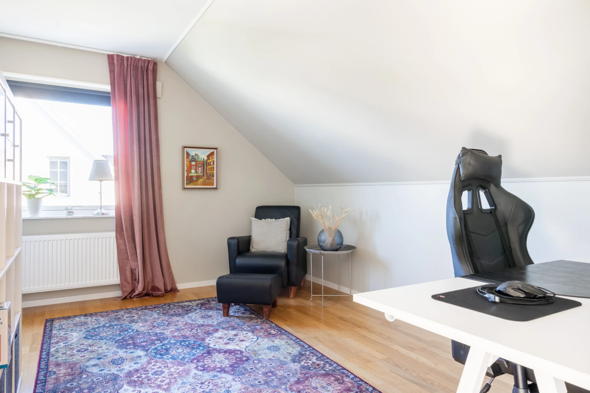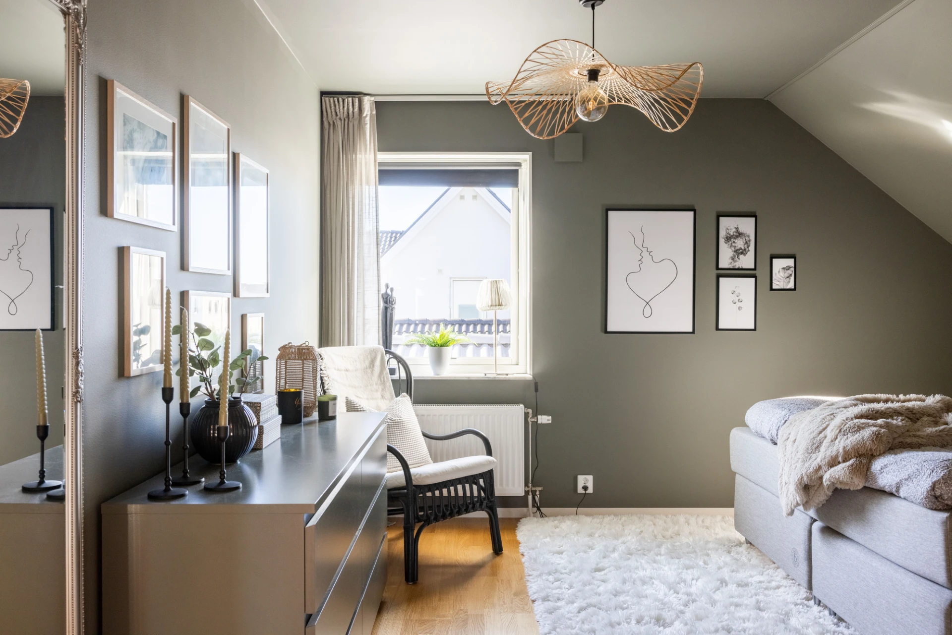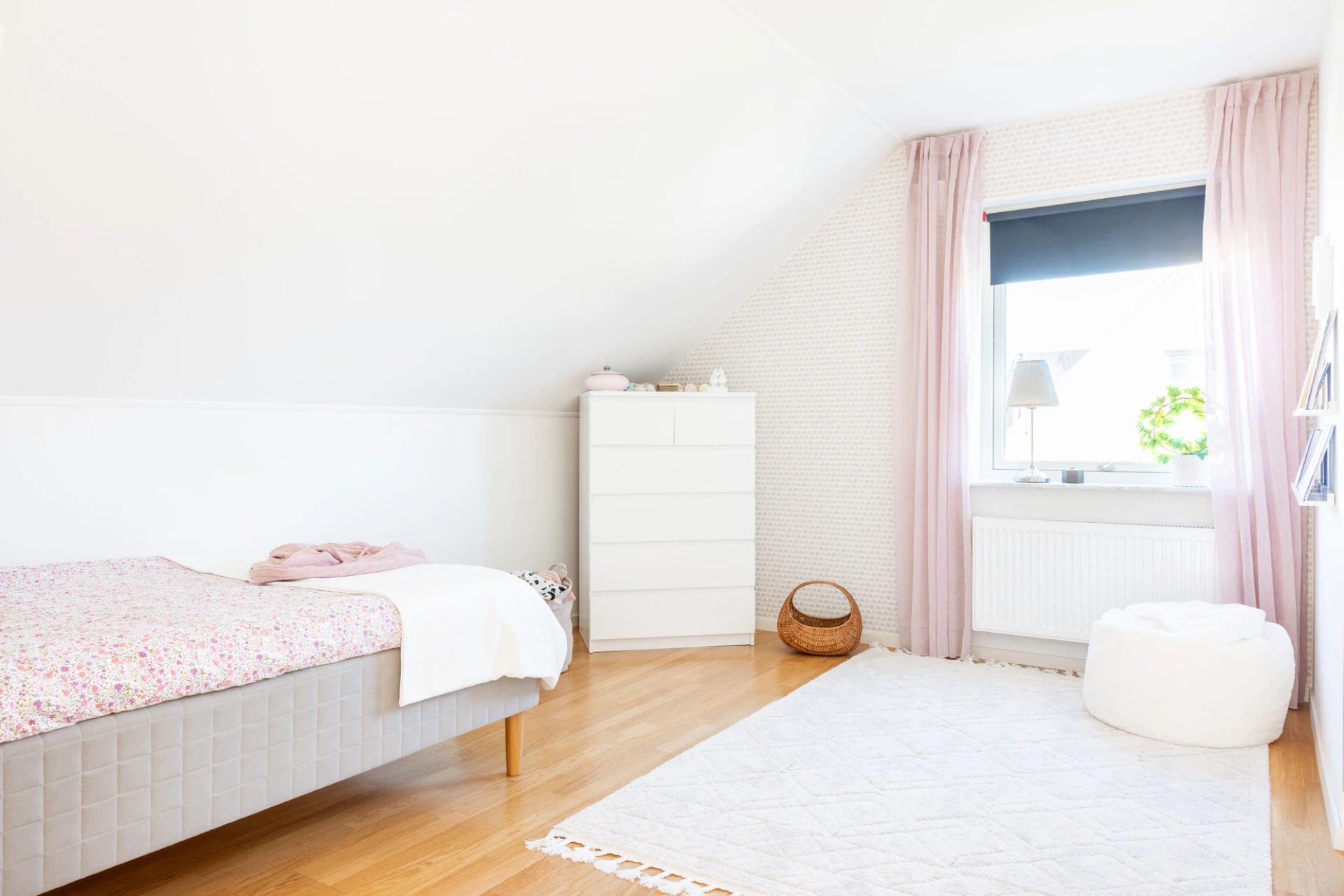 Parkettgolv, beiga väggar, fondvägg samt en garderob.