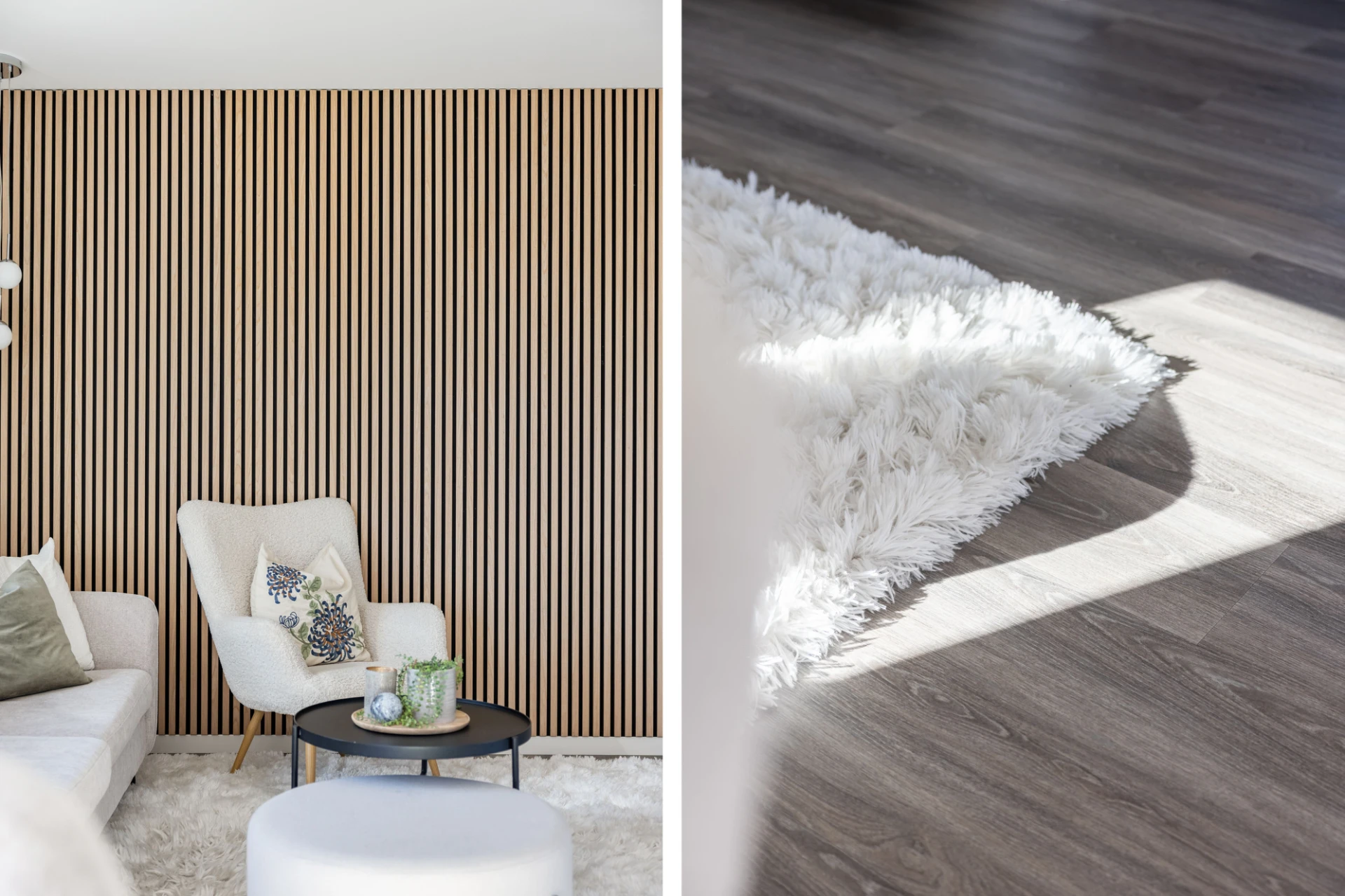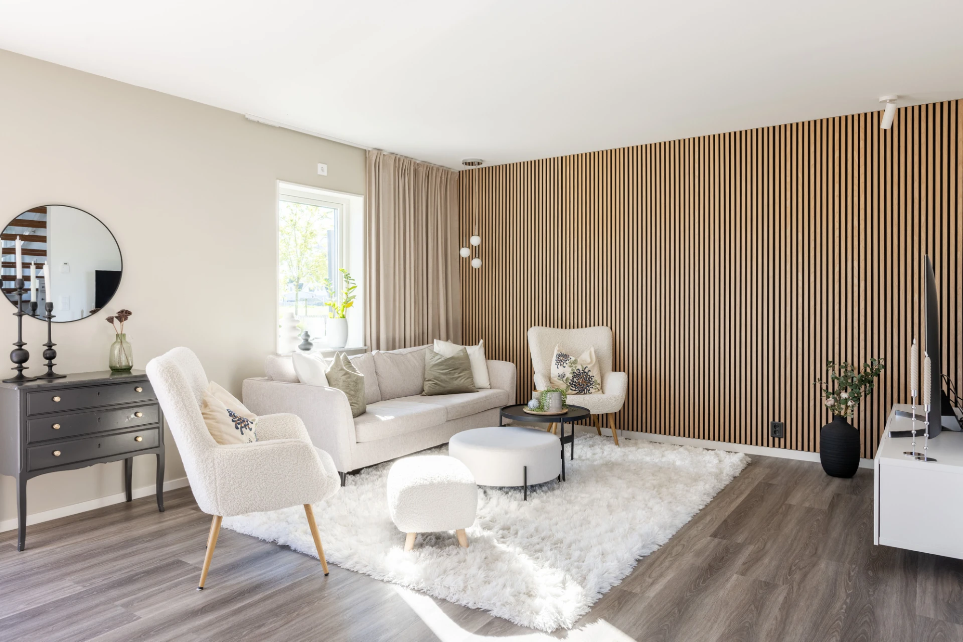 Parkettgolv, vitta väggar, fondvägg samt garderob.
