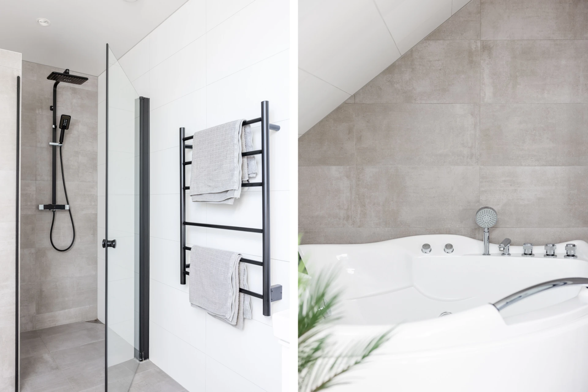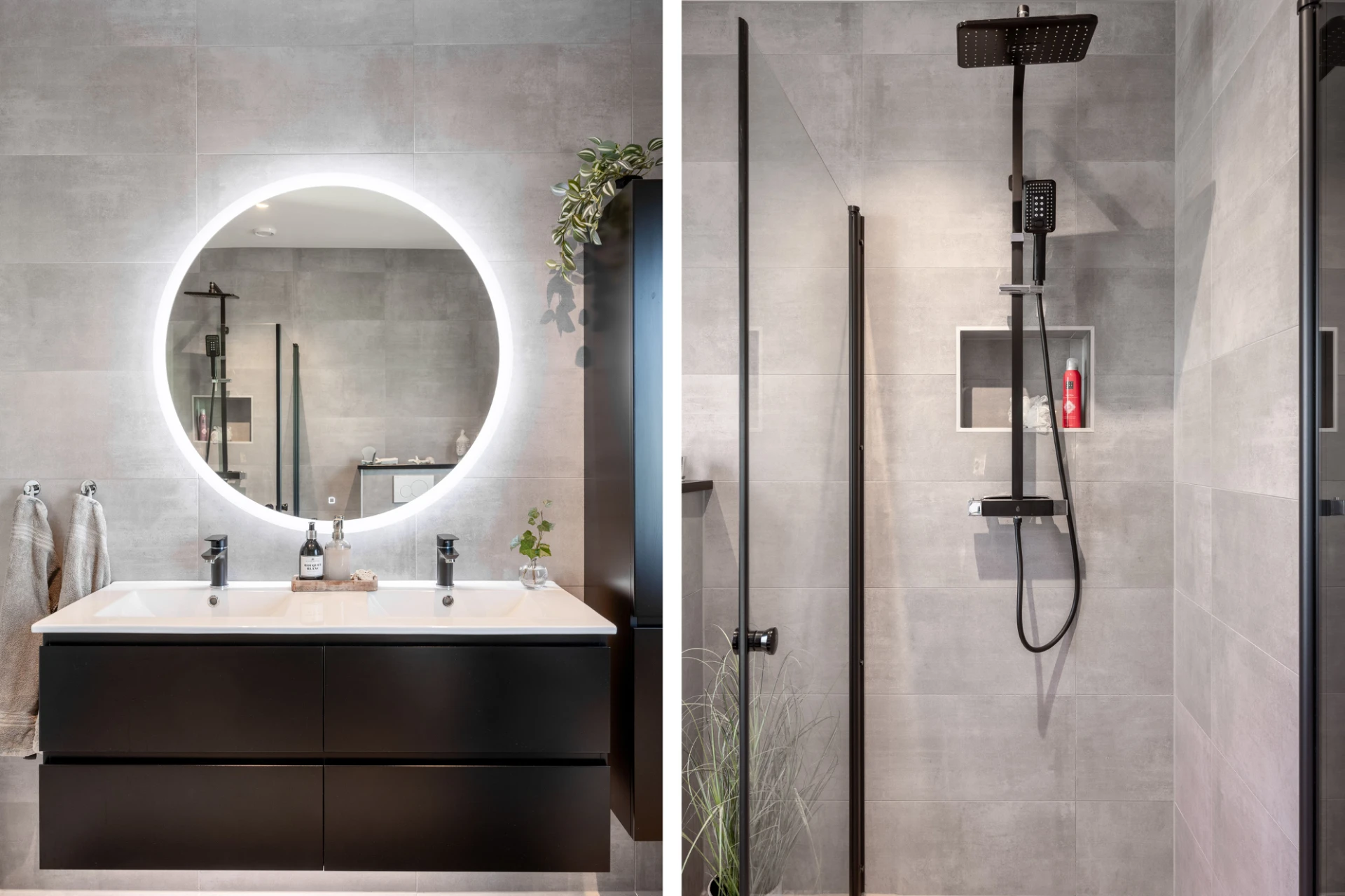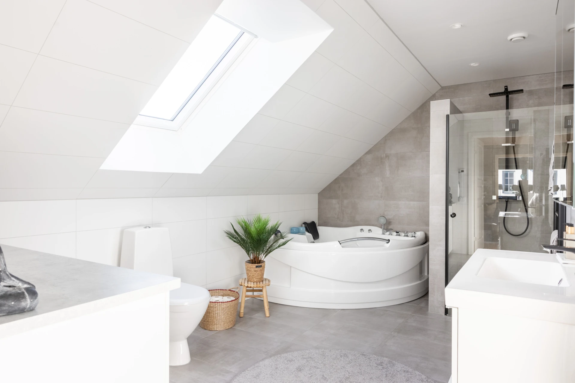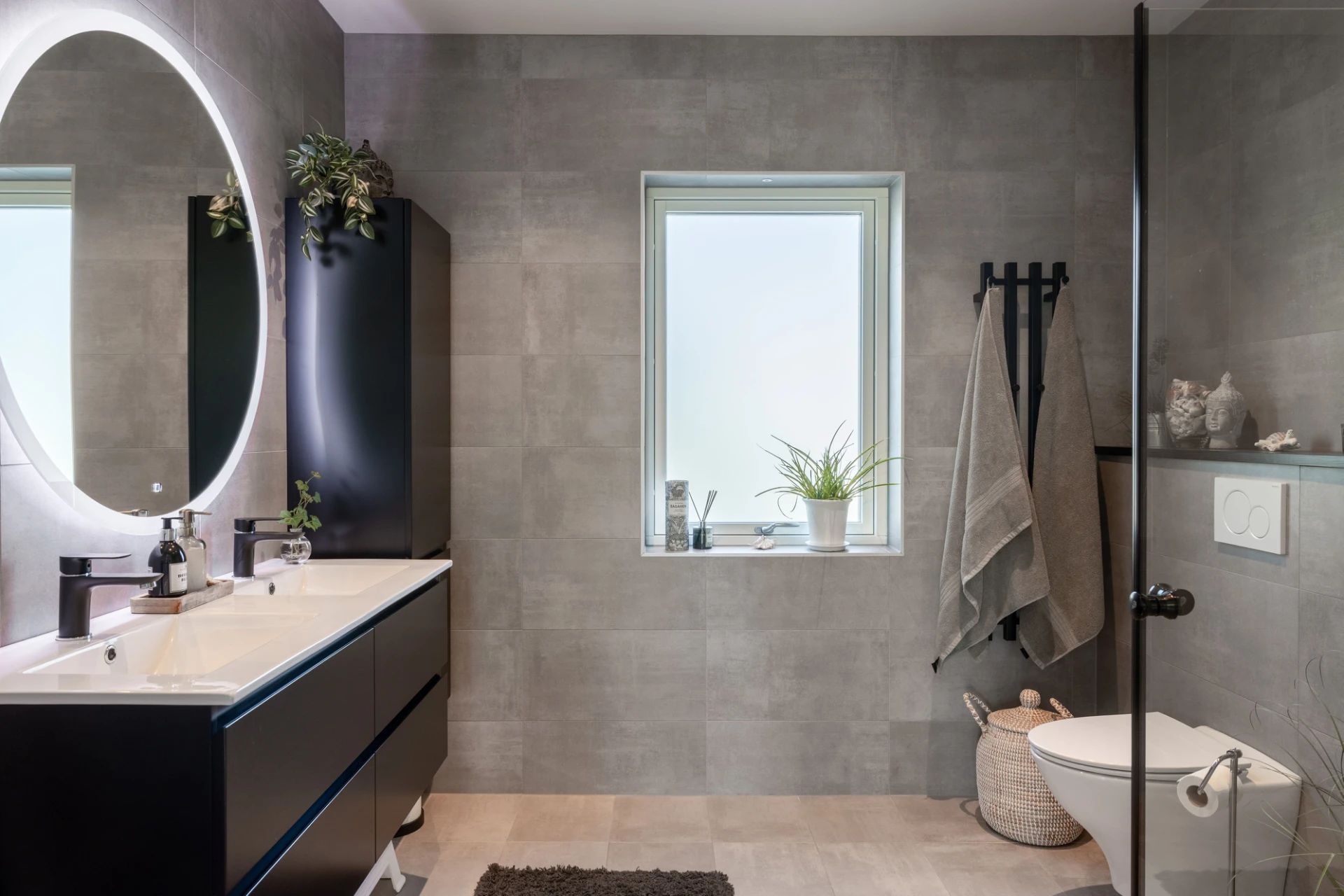 Klinkergolv samt kakelväggar. Utrustat med dusch, handfat med kommod, spegel, vägghängd WC, handdukstork, golvvärme, spotlights samt dimmer.