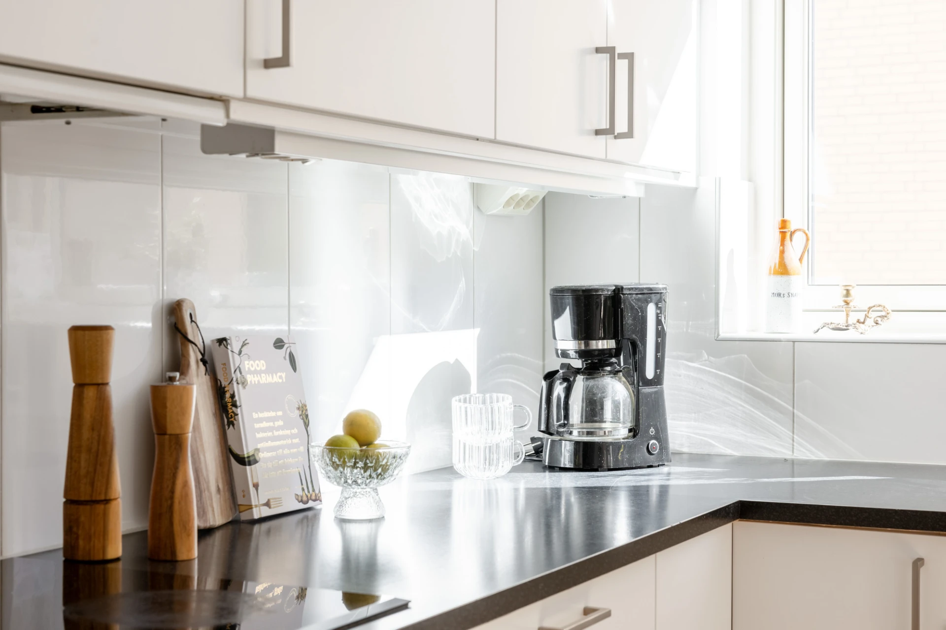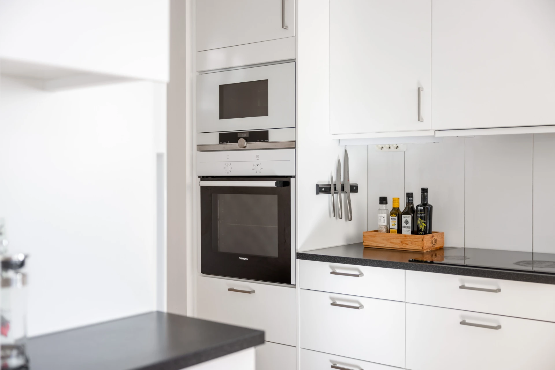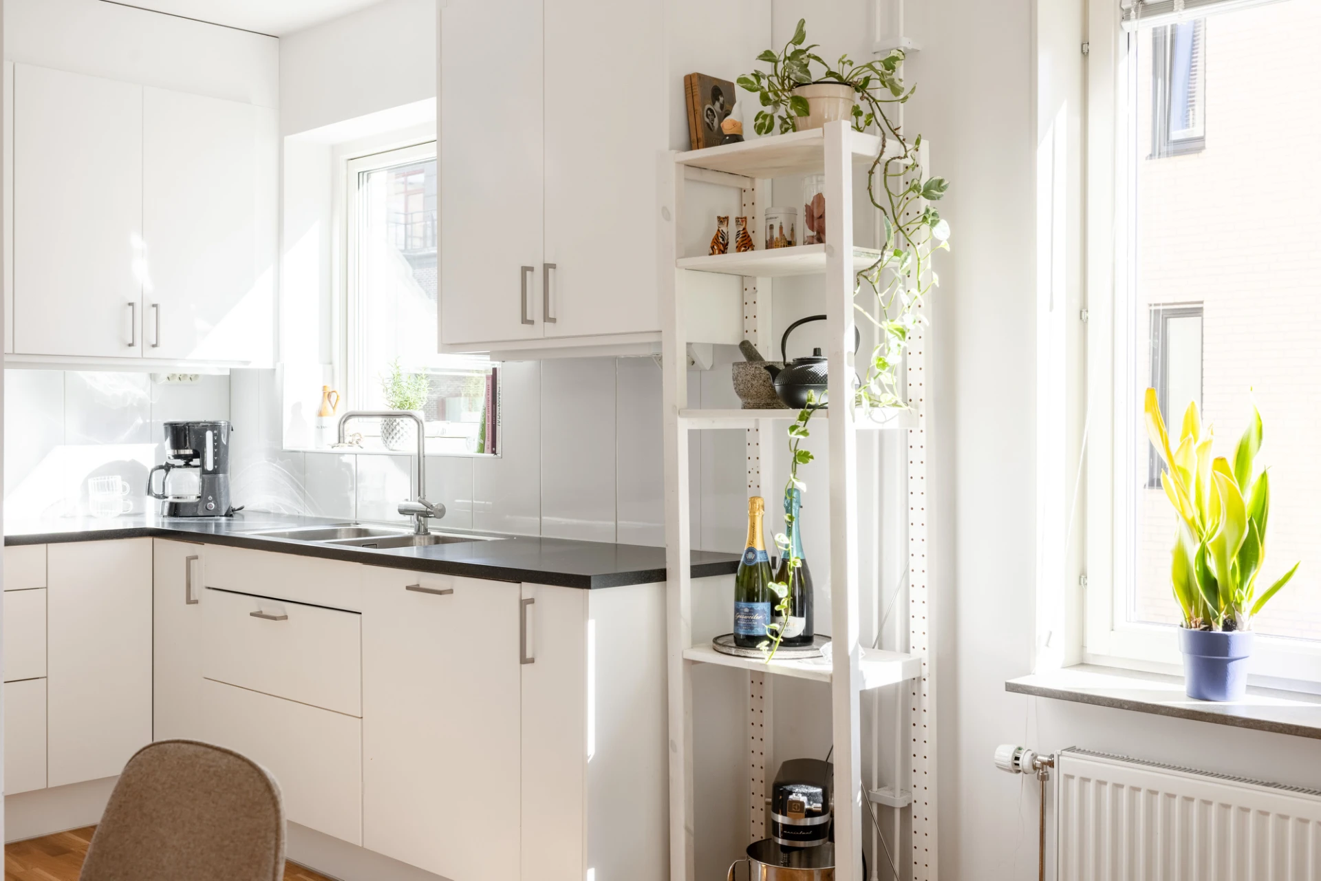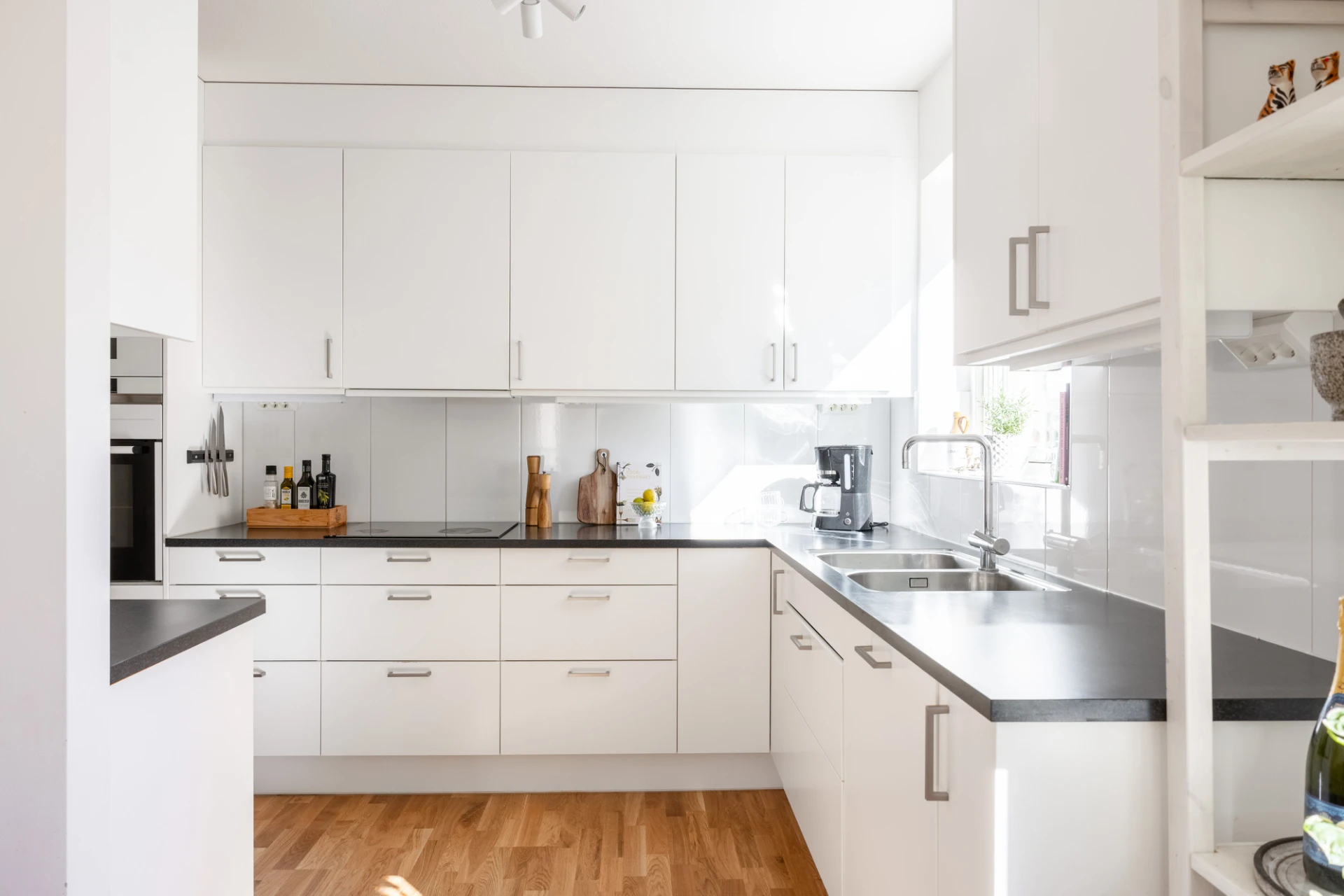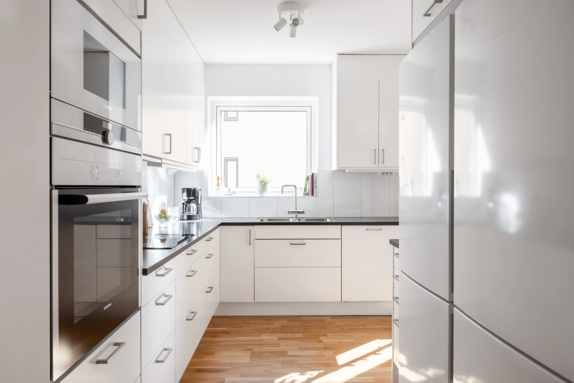 Parkettgolv och vita väggar. Vit köksinredning med vitt kakel ovan mörk bänkskiva. Köket är utrustat med kyl/frys, diskmaskin, inbyggd mikrovågsugn och ugn.