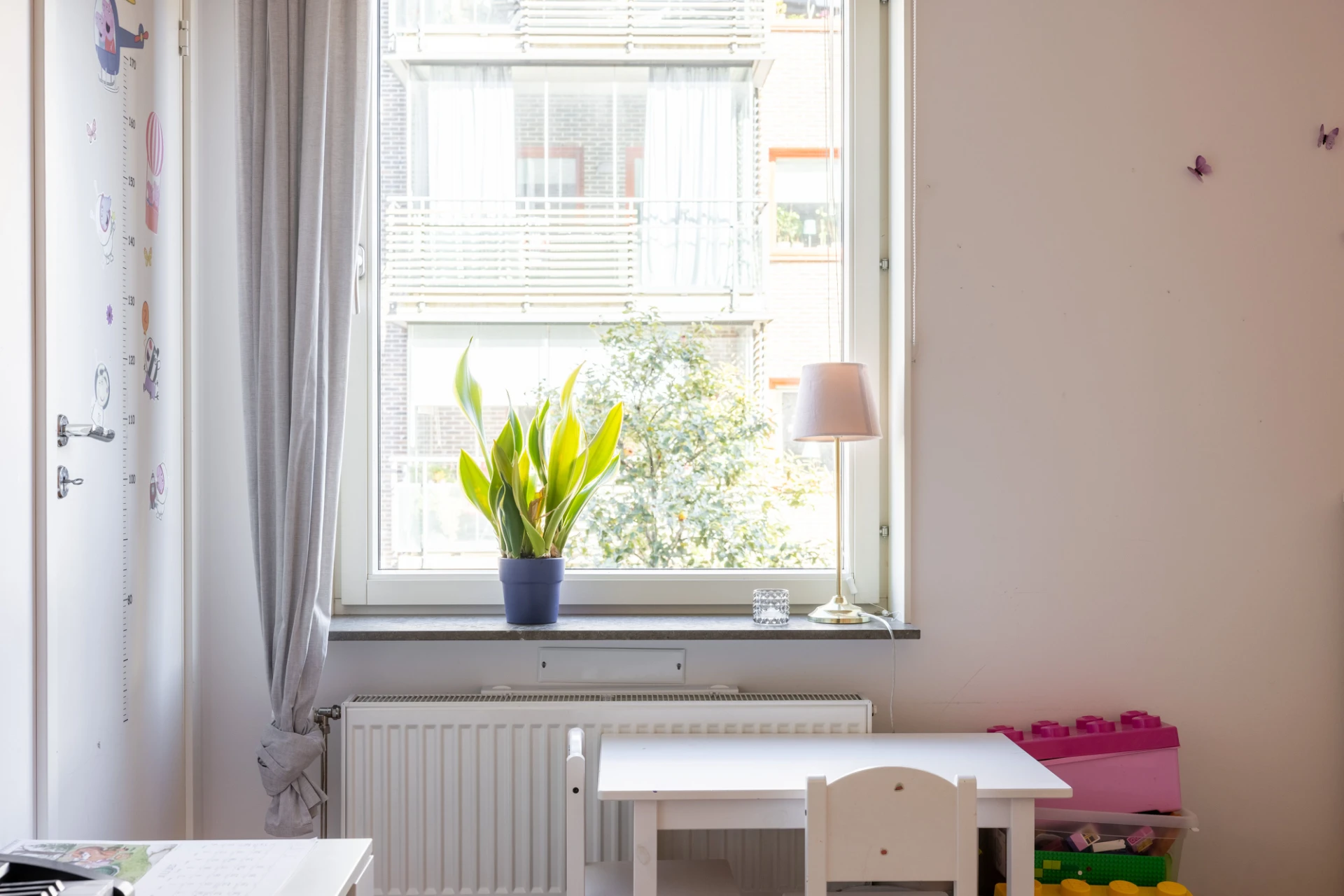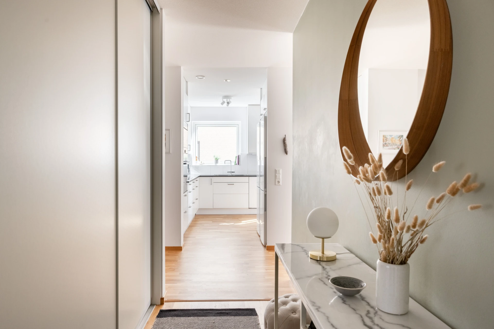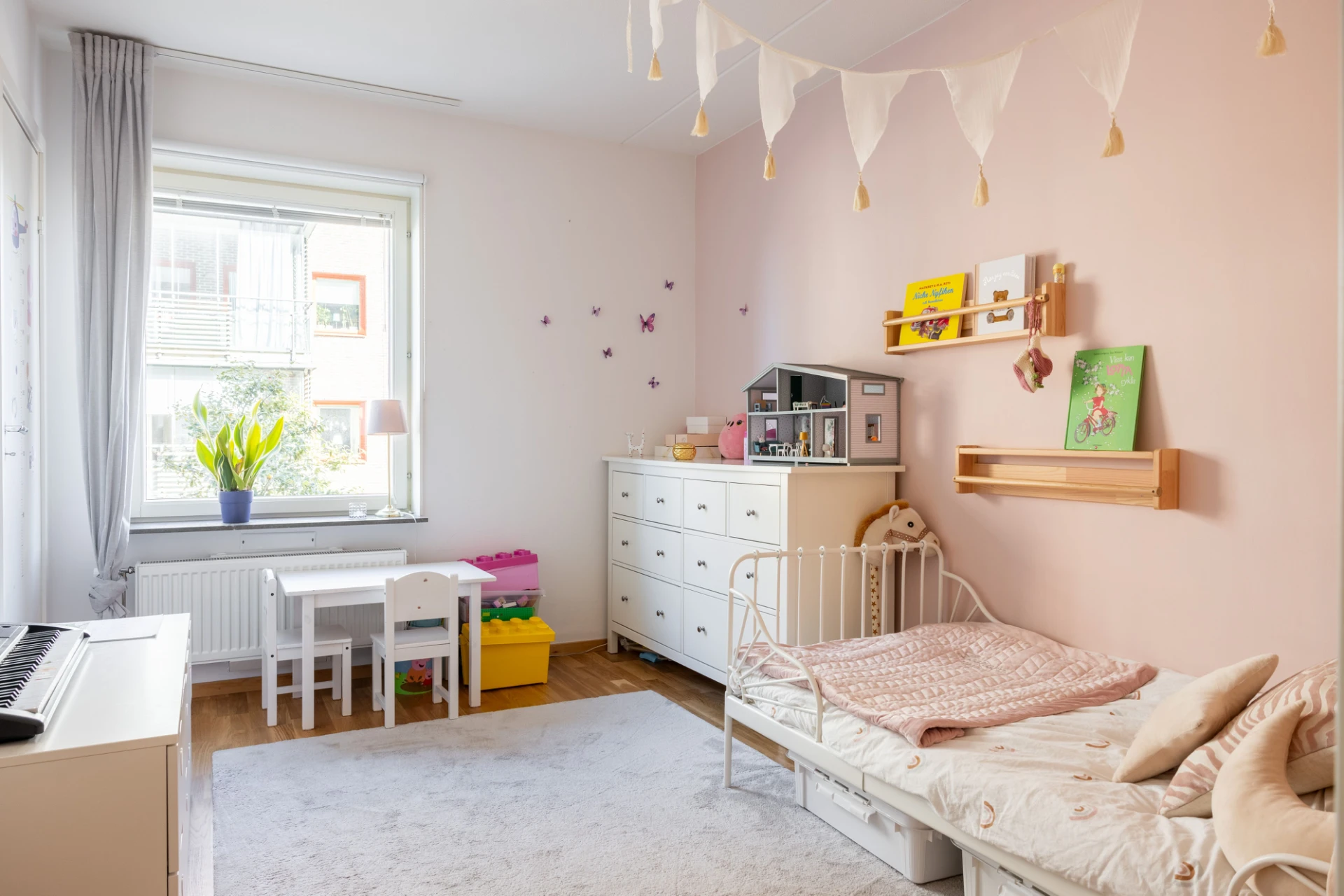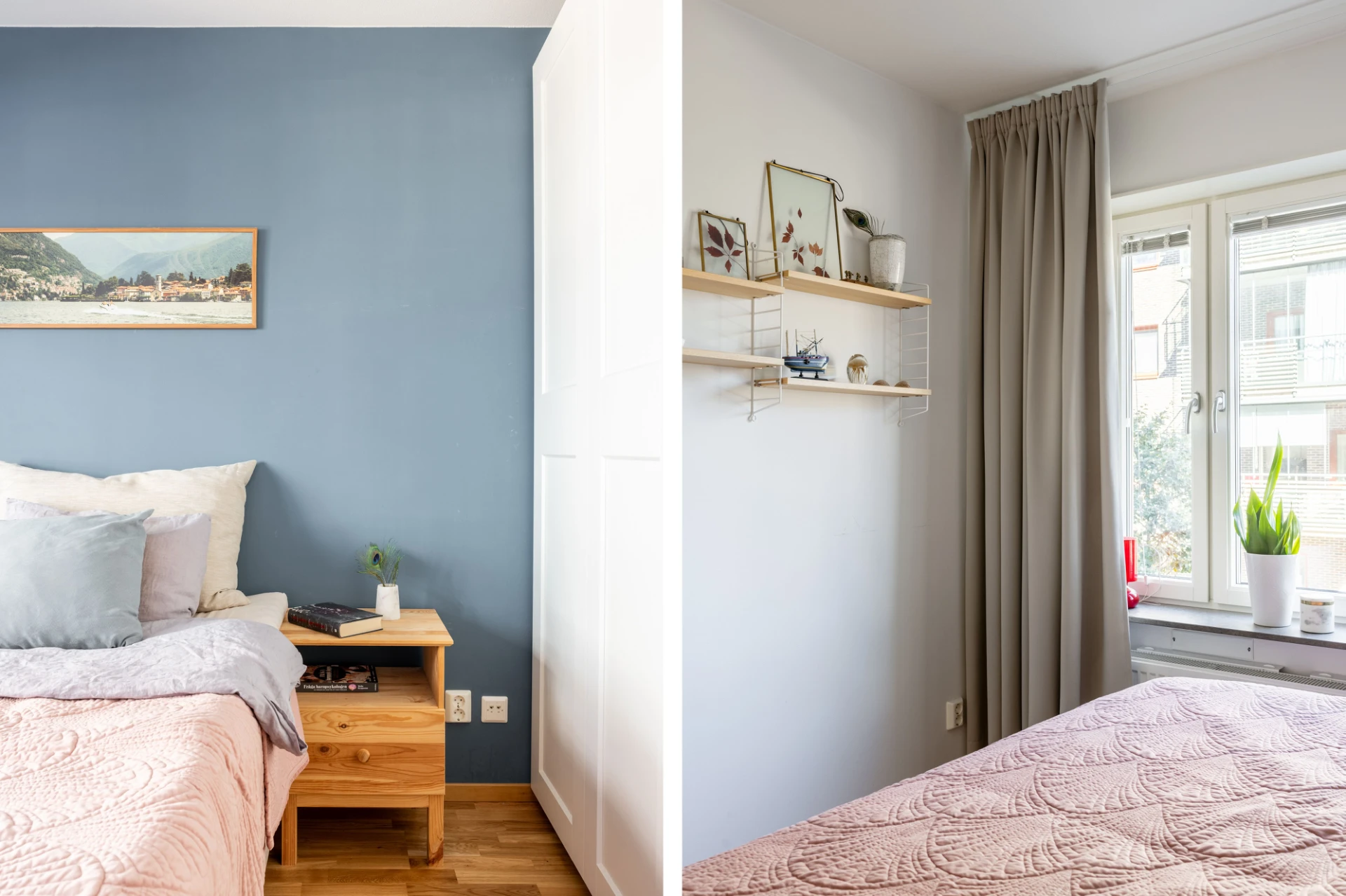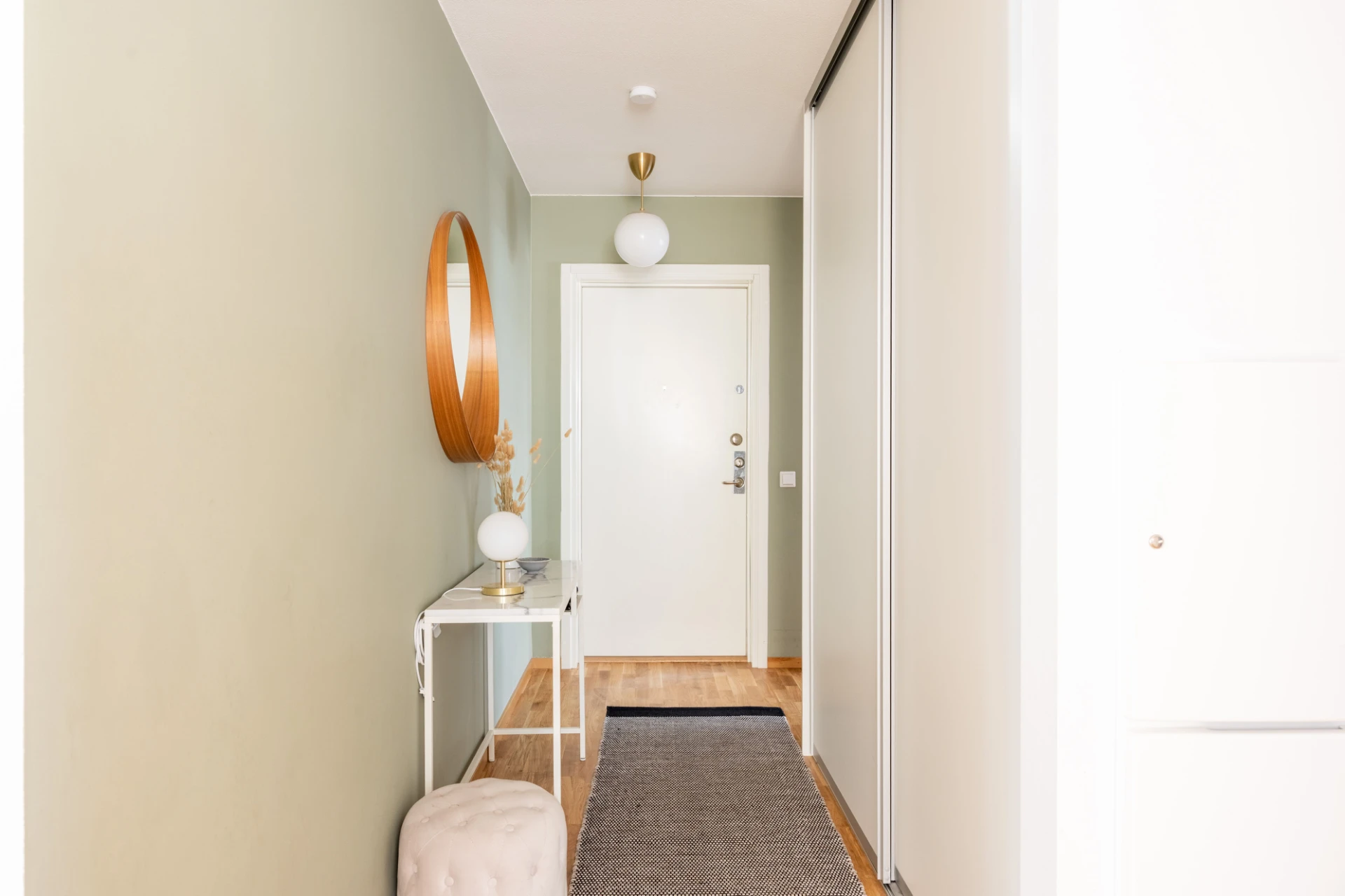 Parkettgolv och gröna väggar. Förvaring i skjutdörrsgarderober.