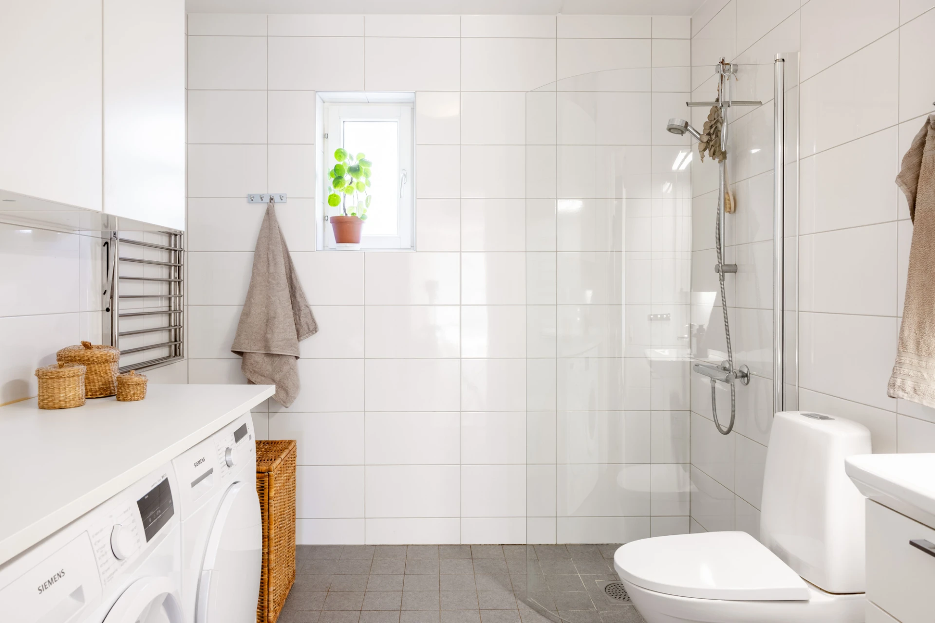 Grå klinker och vitt kakel. Badrummet är utrustat med egna tvättmöjligheter, handfat med vit kommod, dusch och wc.
