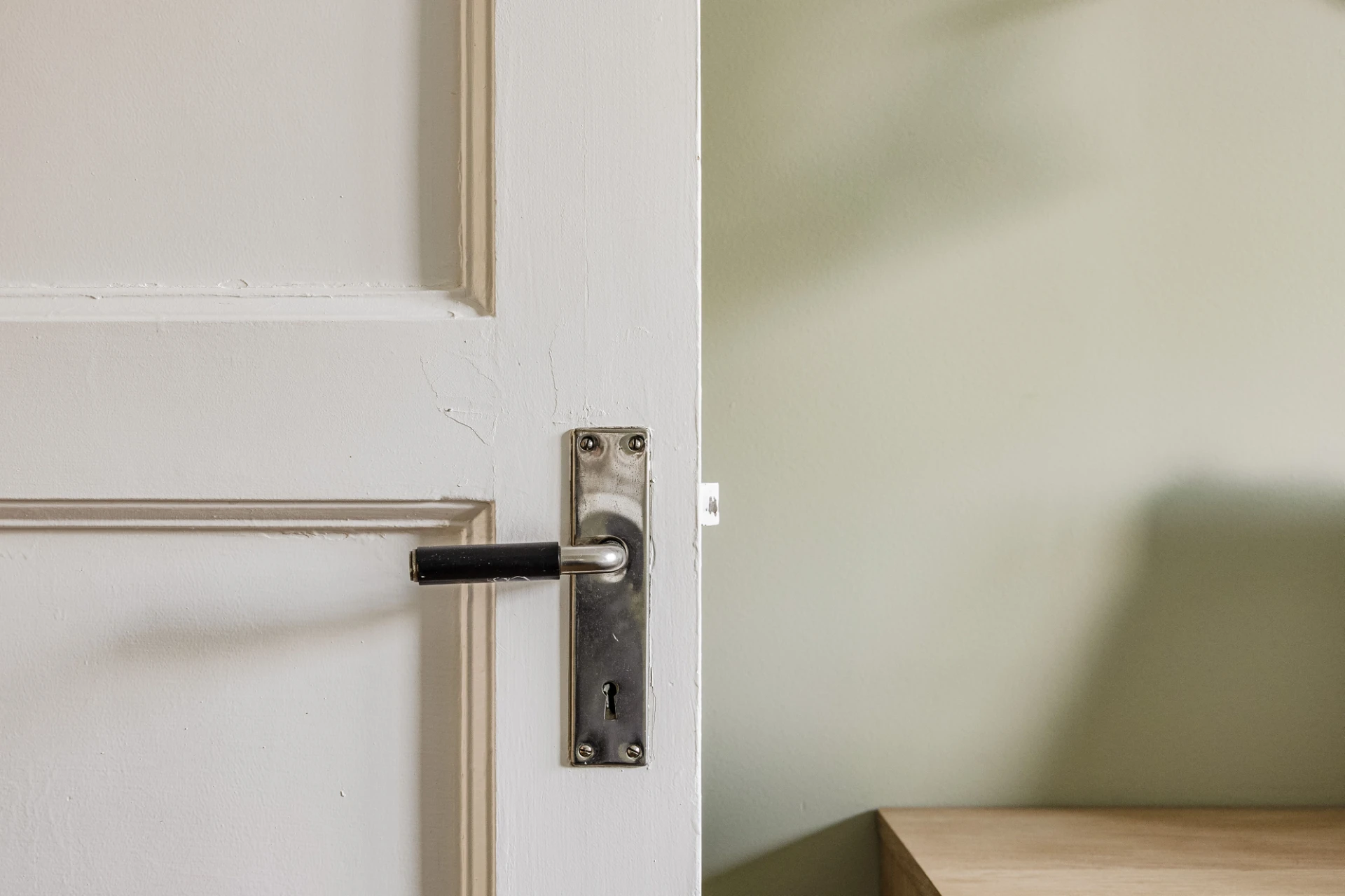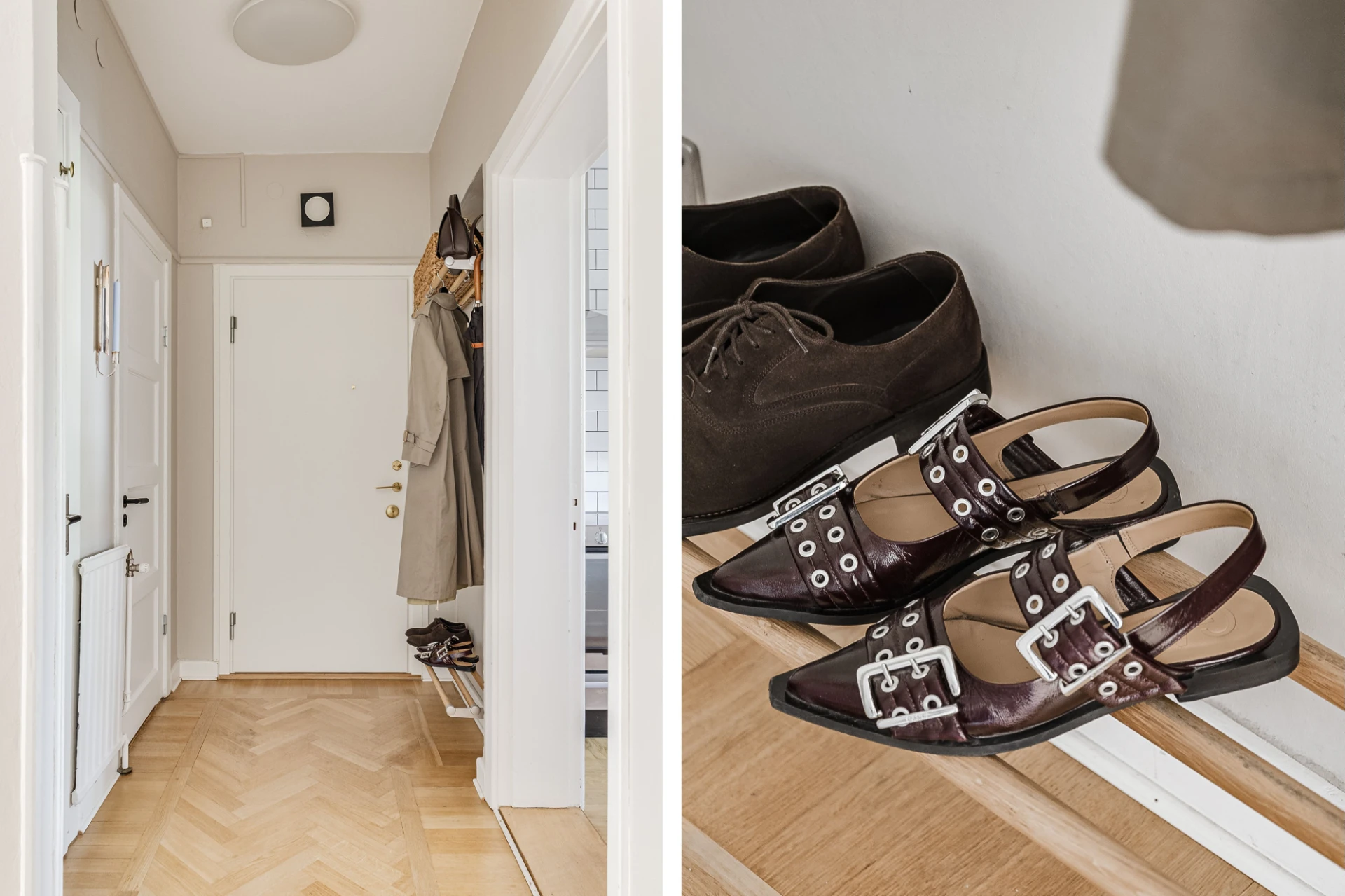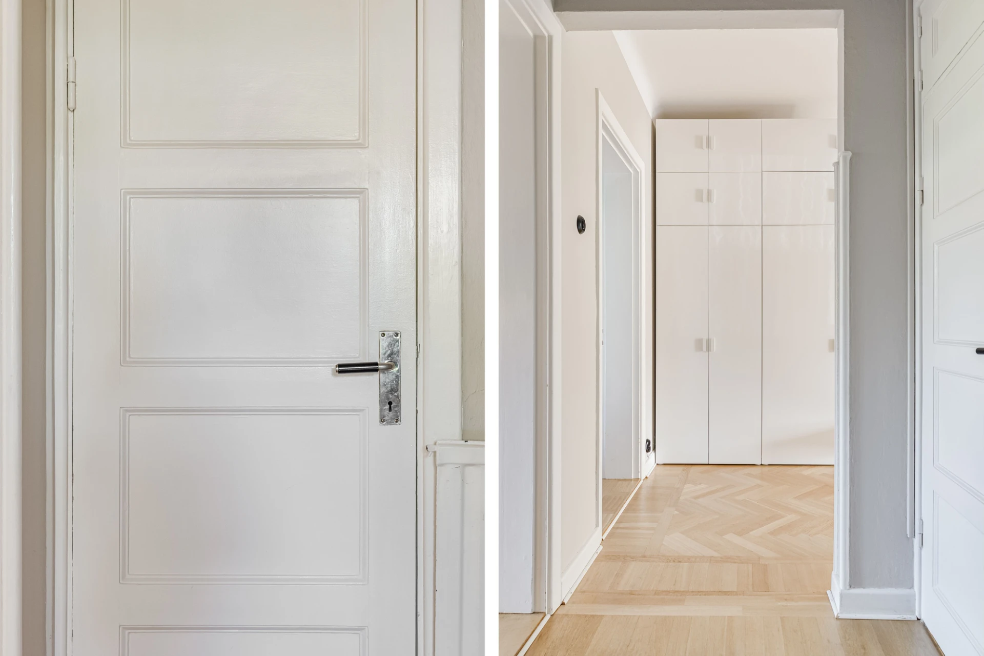 Fiskbensparkett och beige väggar. Ingång till förråd med brädgolv och vita väggar. Säkerhetsdörr.