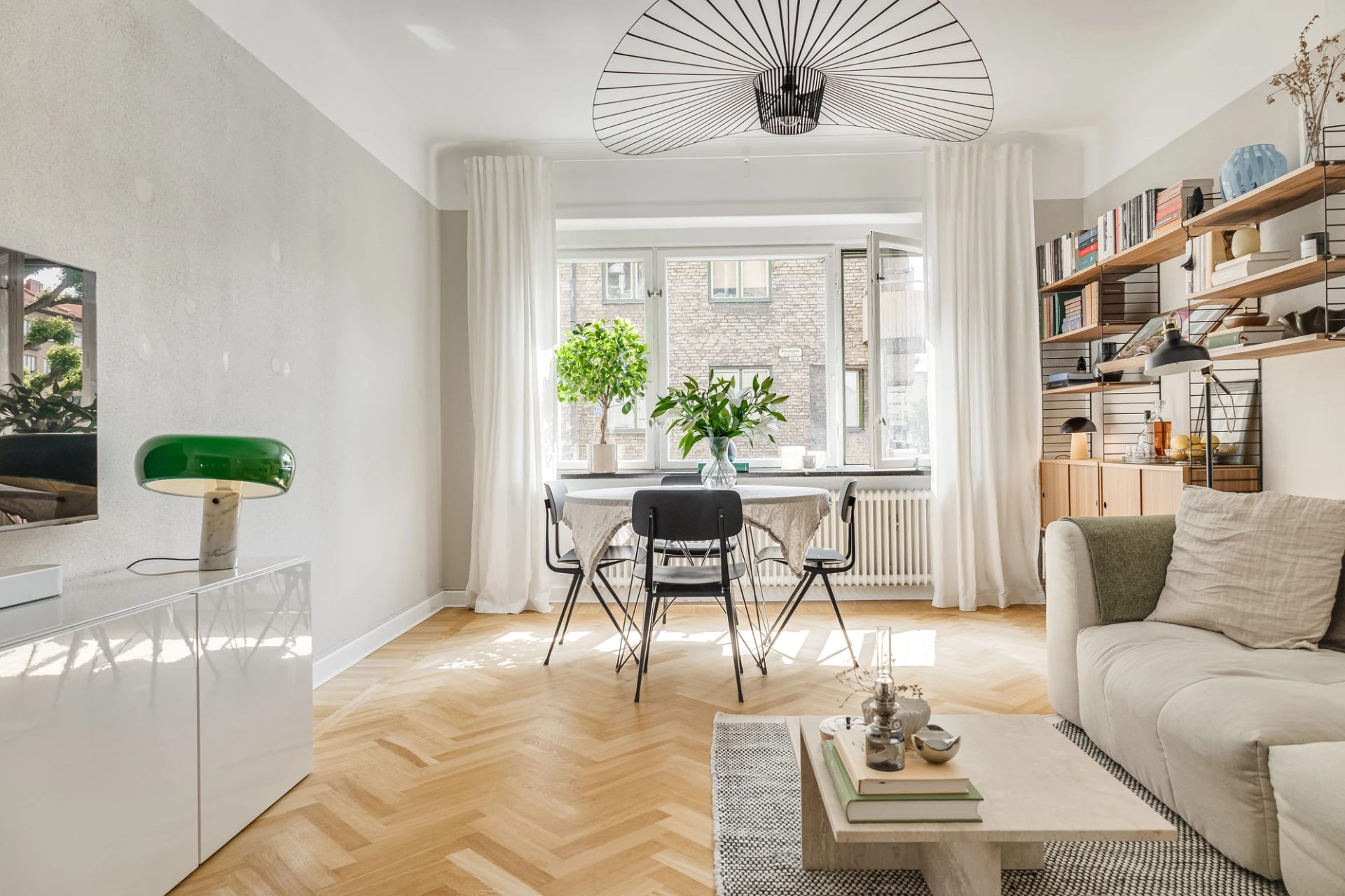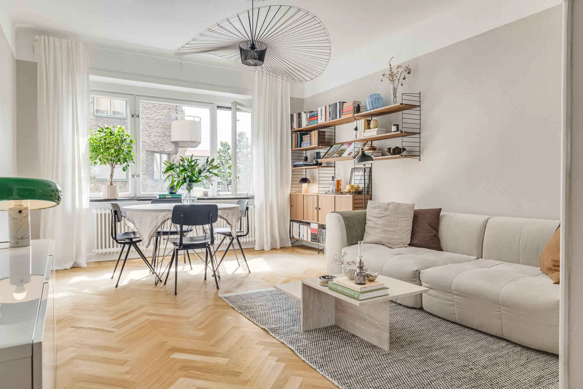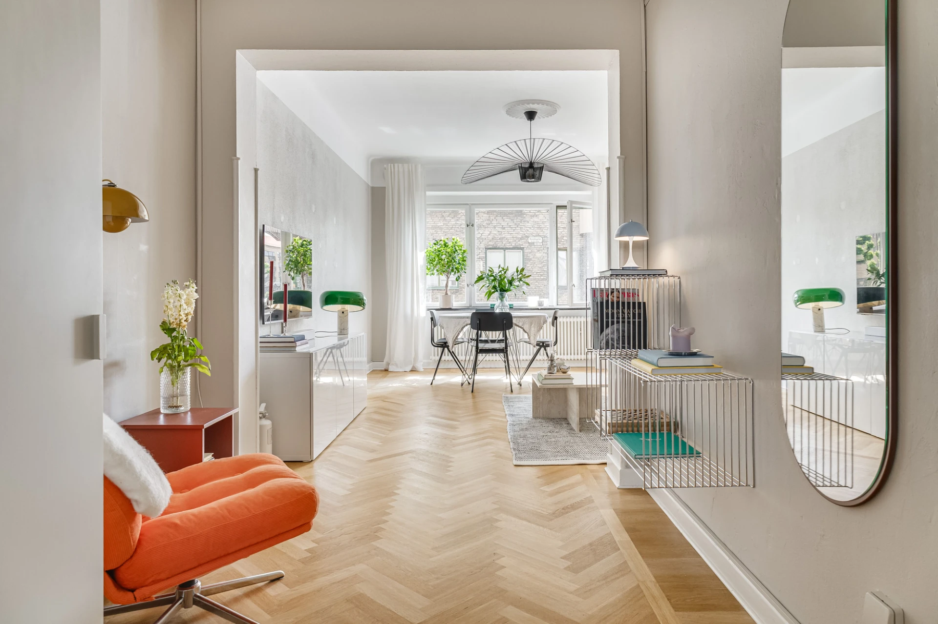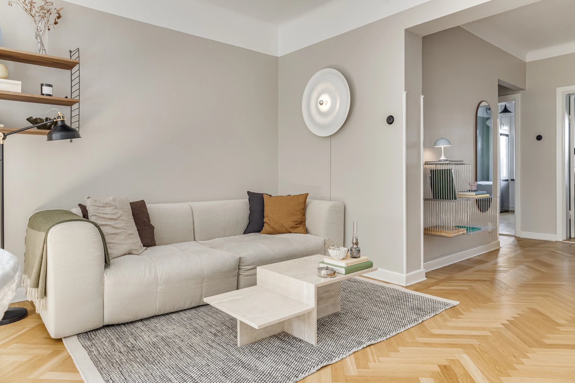 Fiskbensparkett och beige väggar. Lamprosett. Plats för soffa och matbord.