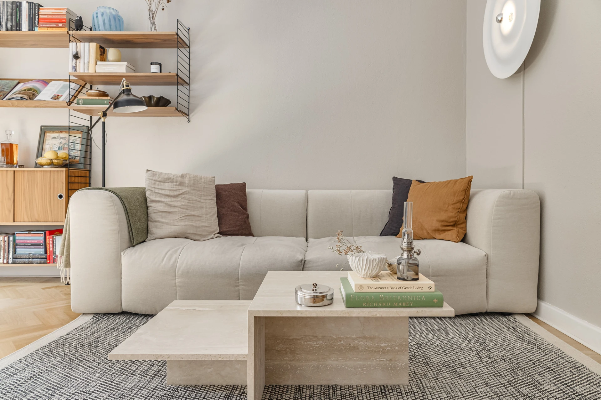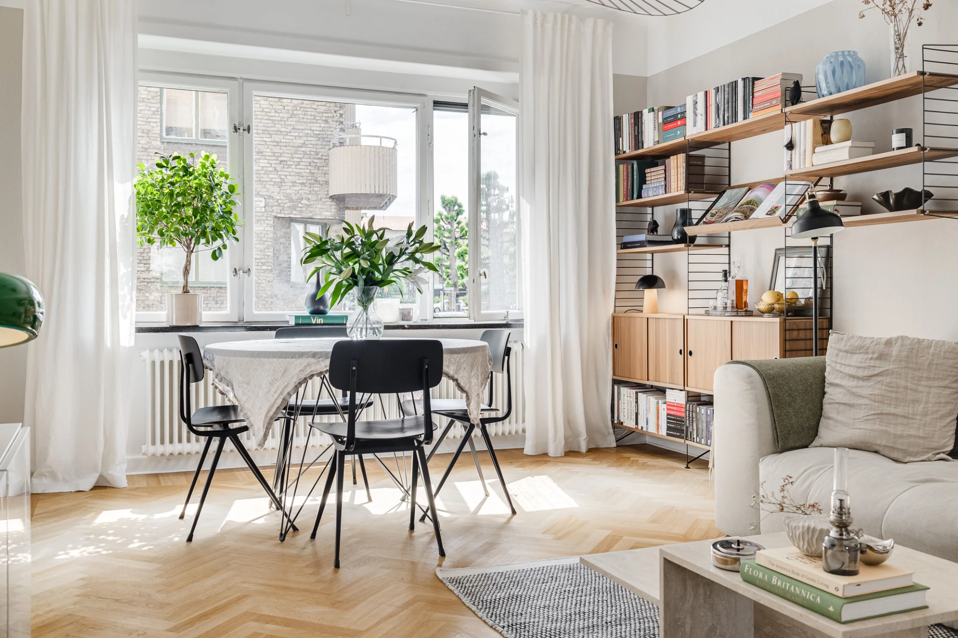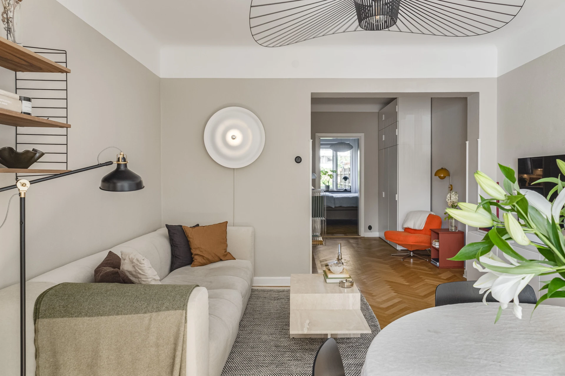 Fiskbensparkett och beige väggar. Lamprosett. Plats för soffa och matbord.