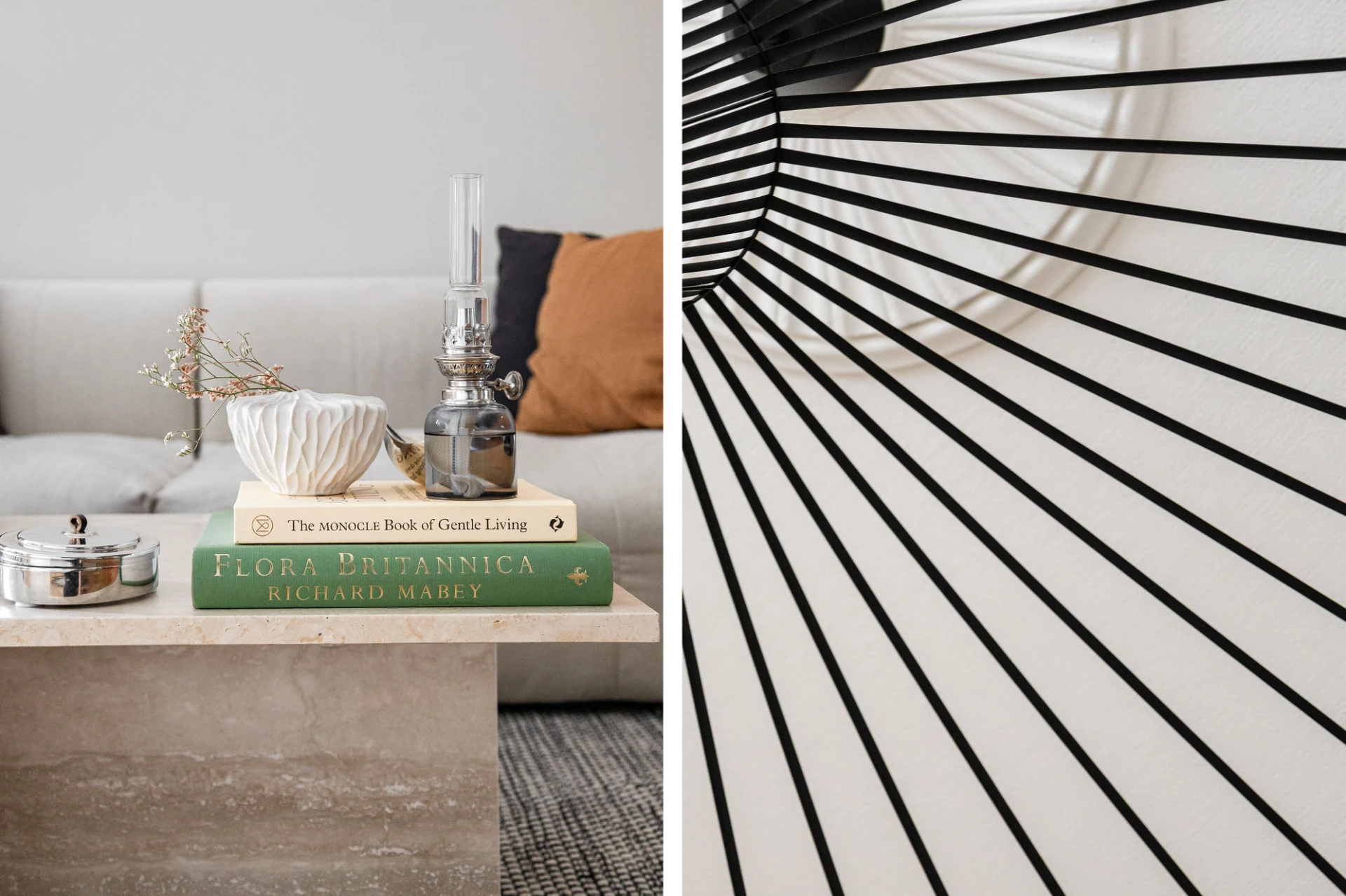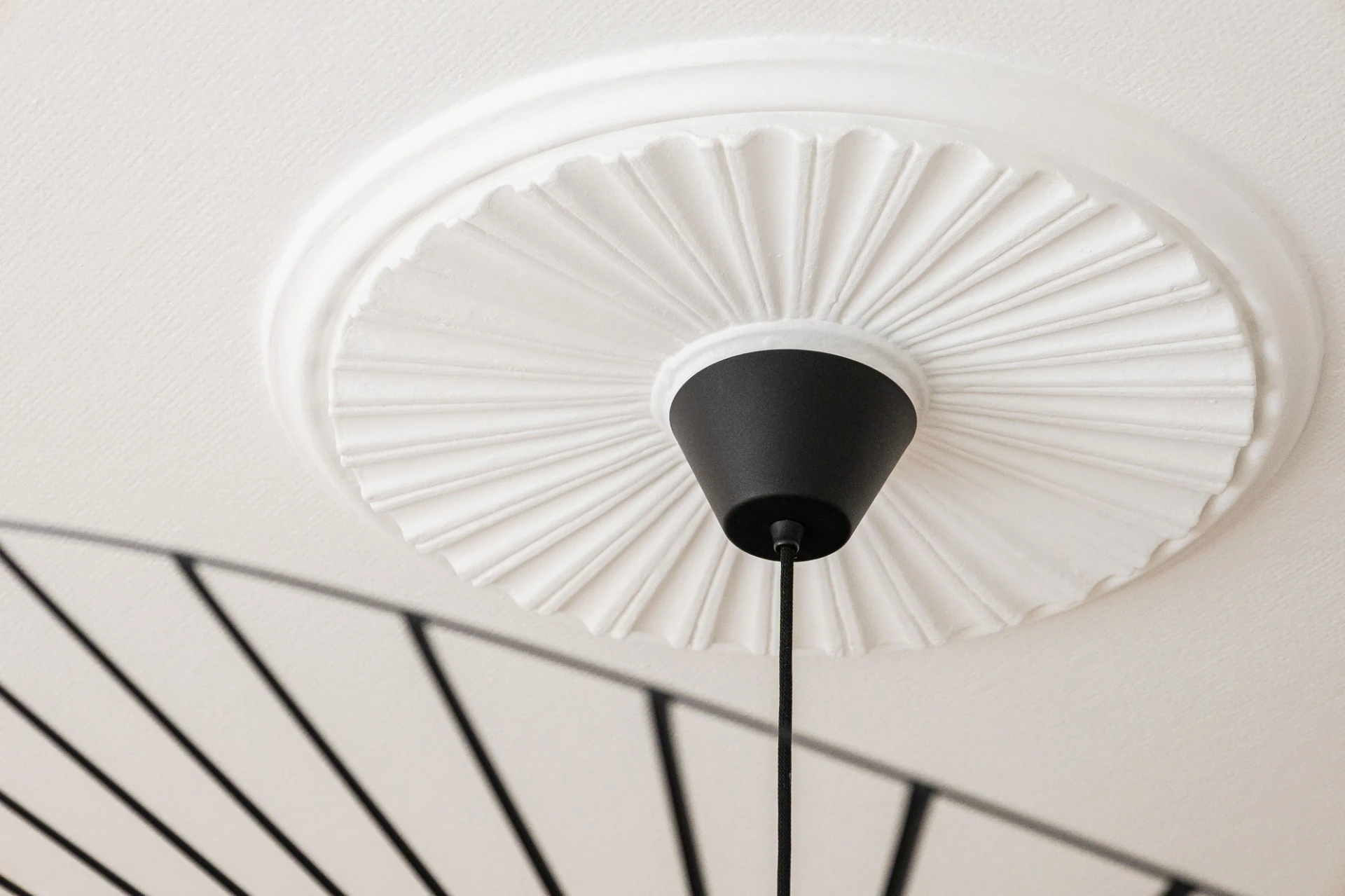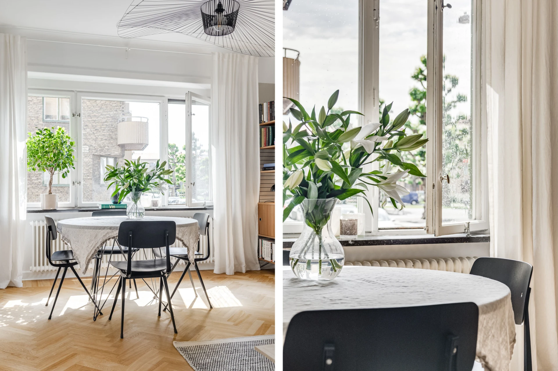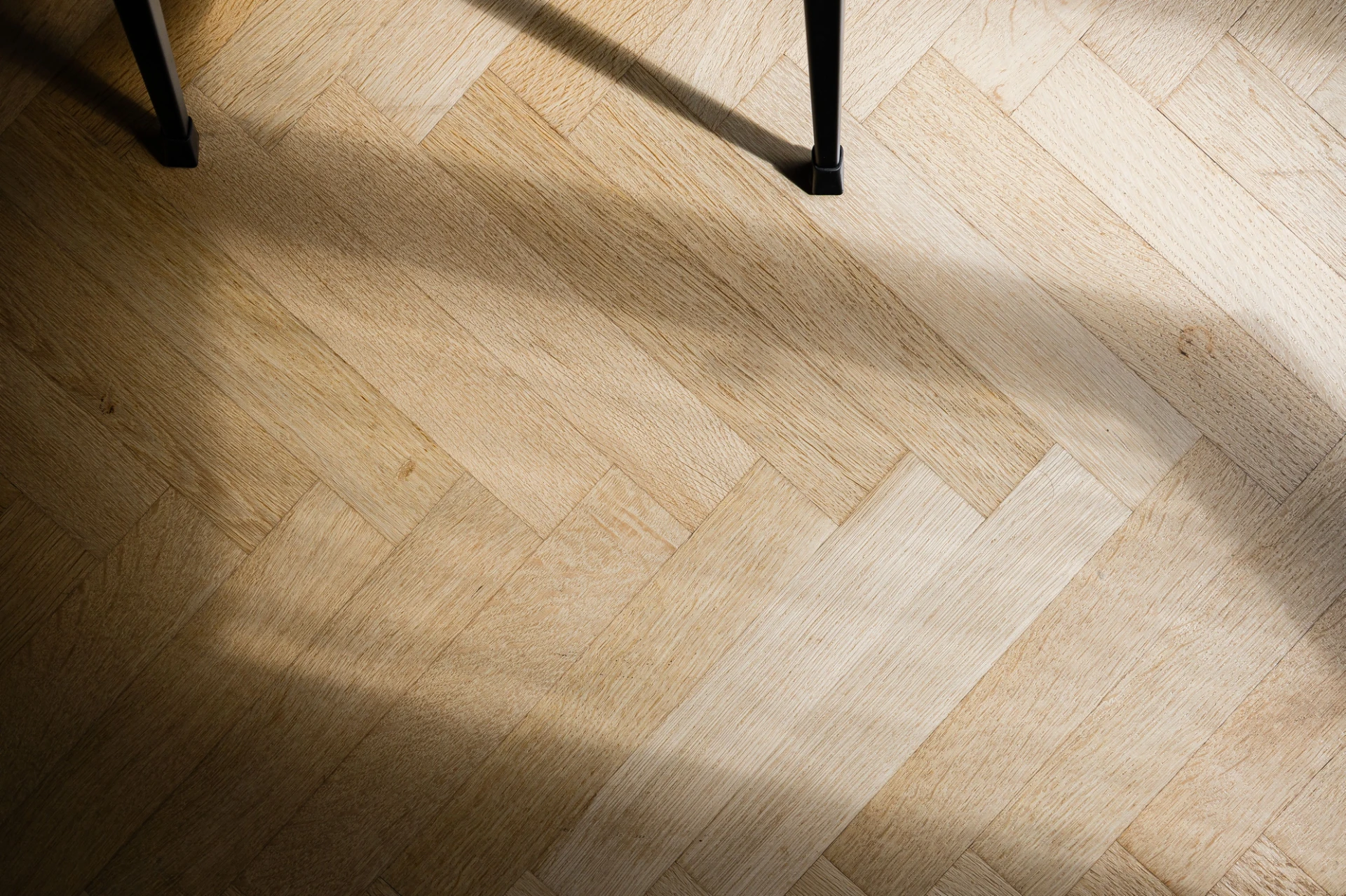 Fiskbensparkett och beige väggar. Lamprosett. Plats för soffa och matbord.