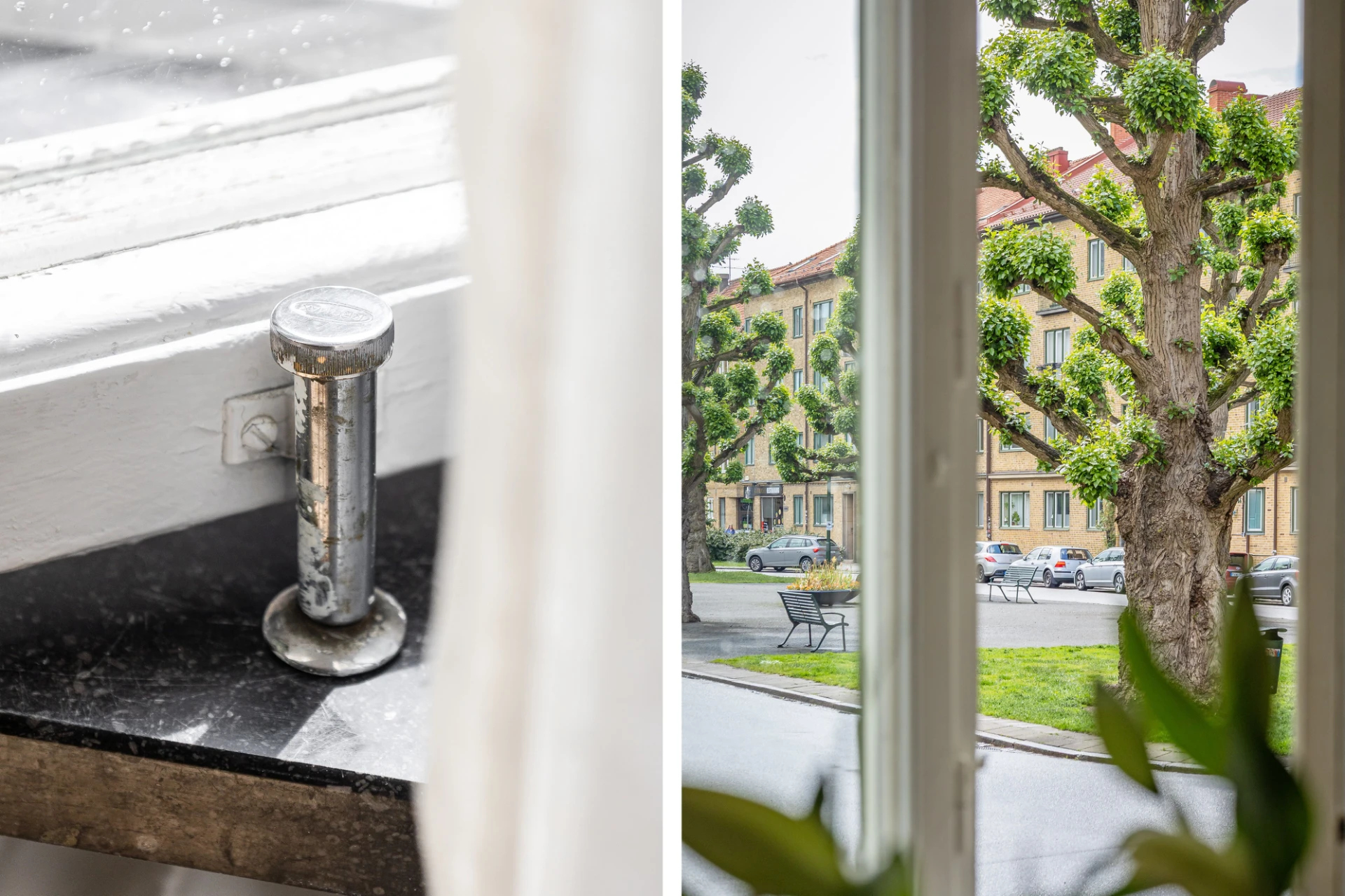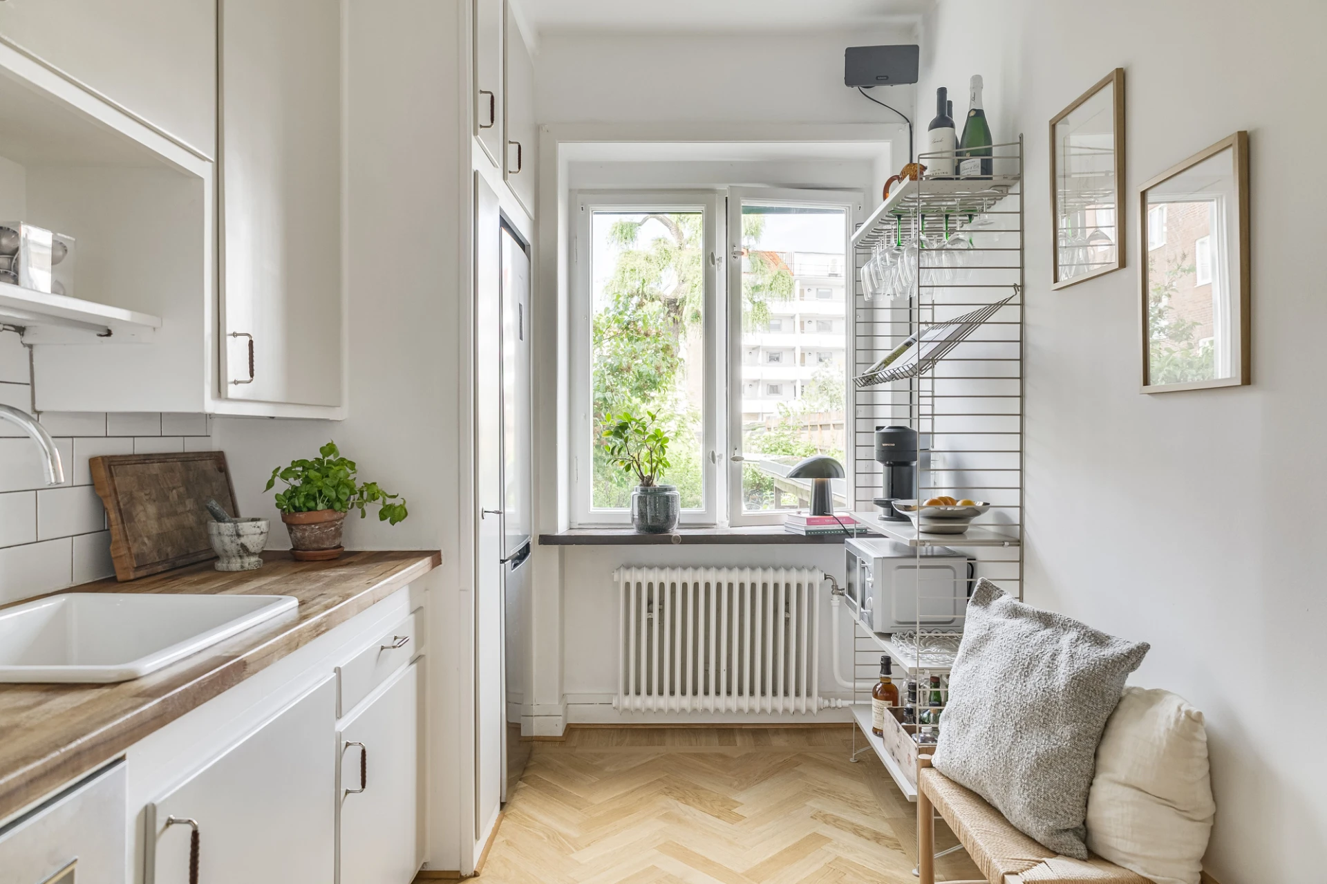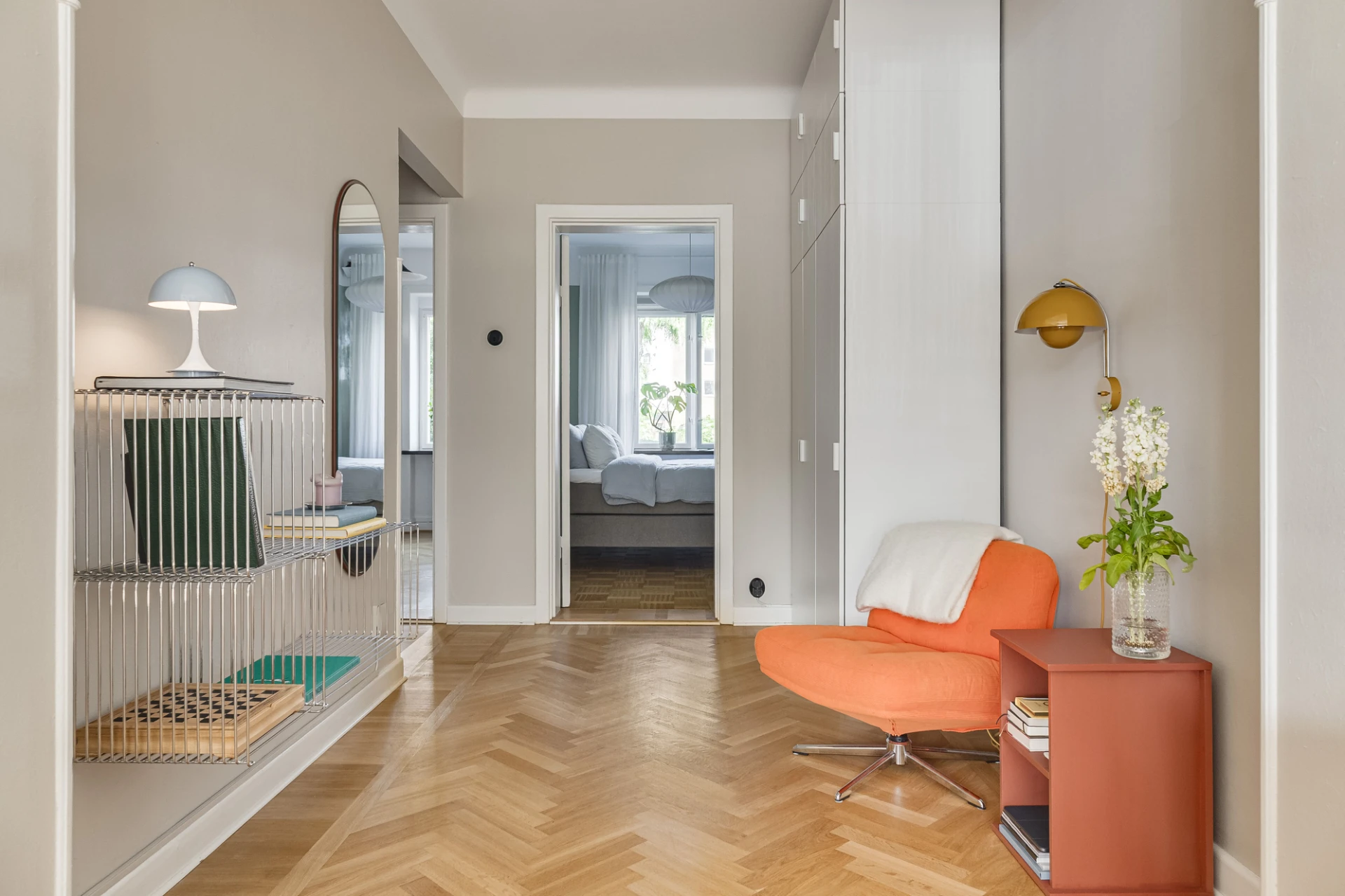 Fiskbensparkett och beige väggar. Förvaring i två garderober.