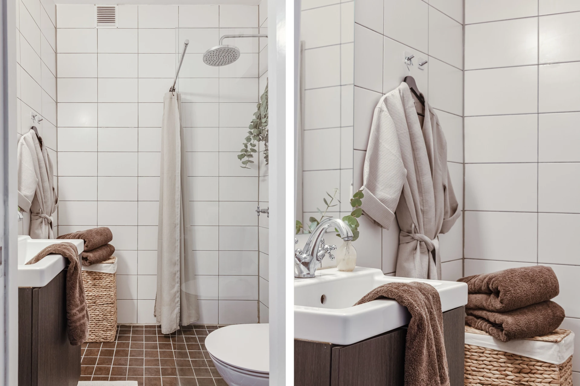 Brun klinker och cremefärgat kakel. Utrustat med takdusch, duschvägg i klarglas, wc, handfat med träfärgad kommod och spegel.